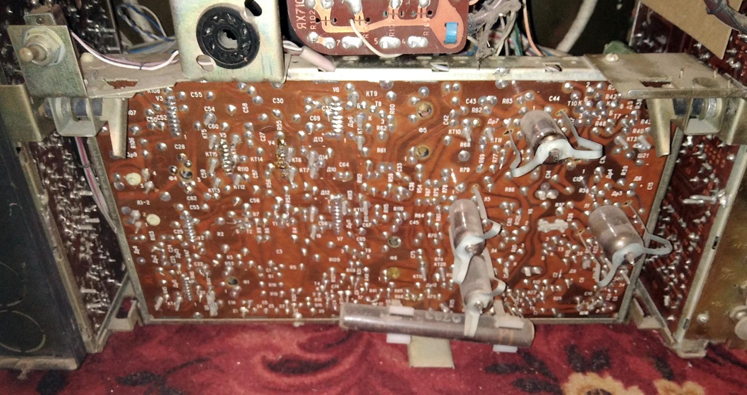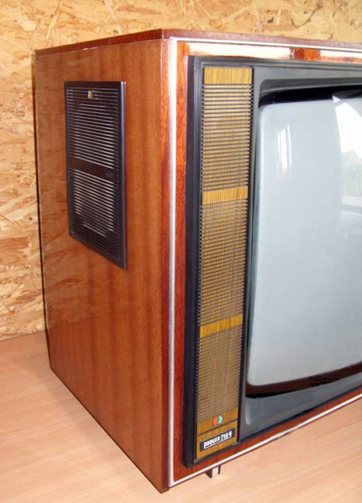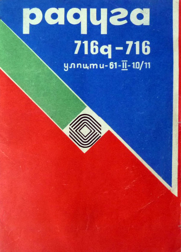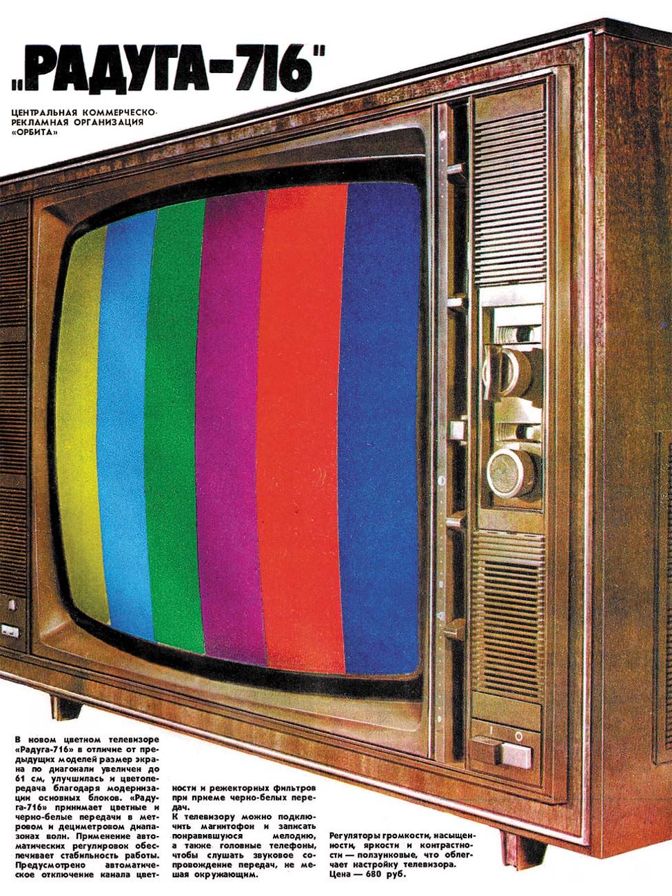 Телевизионный приёмник цветного изображения *Радуга-716/Д* с 1977 года выпускал Ленинградский завод им. Козицкого. Унифицированный цветной телевизор второго класса **Радуга-716/Д** выпускался в настольном оформлении с вариантами отделки корпуса и передней панели. В телевизоре применён кинескоп 61ЛК3Ц, использованы радиолампы, транзисторы, интегральные микросхемы. Чувствительность модели в МВ диапазоне 55 мкВ, в ДМВ (Д*) 100 мкВ. Номинальная выходная мощность 2,3 Вт. Диапазон воспроизводимых звуковых частот - 80...12500 Гц. Потребляемая от сети мощность 250 Вт. Габариты телевизора - 550х785х580 мм. Масса 60 кг. Цена модели - 680 и 705 рублей с индексом *Д*.