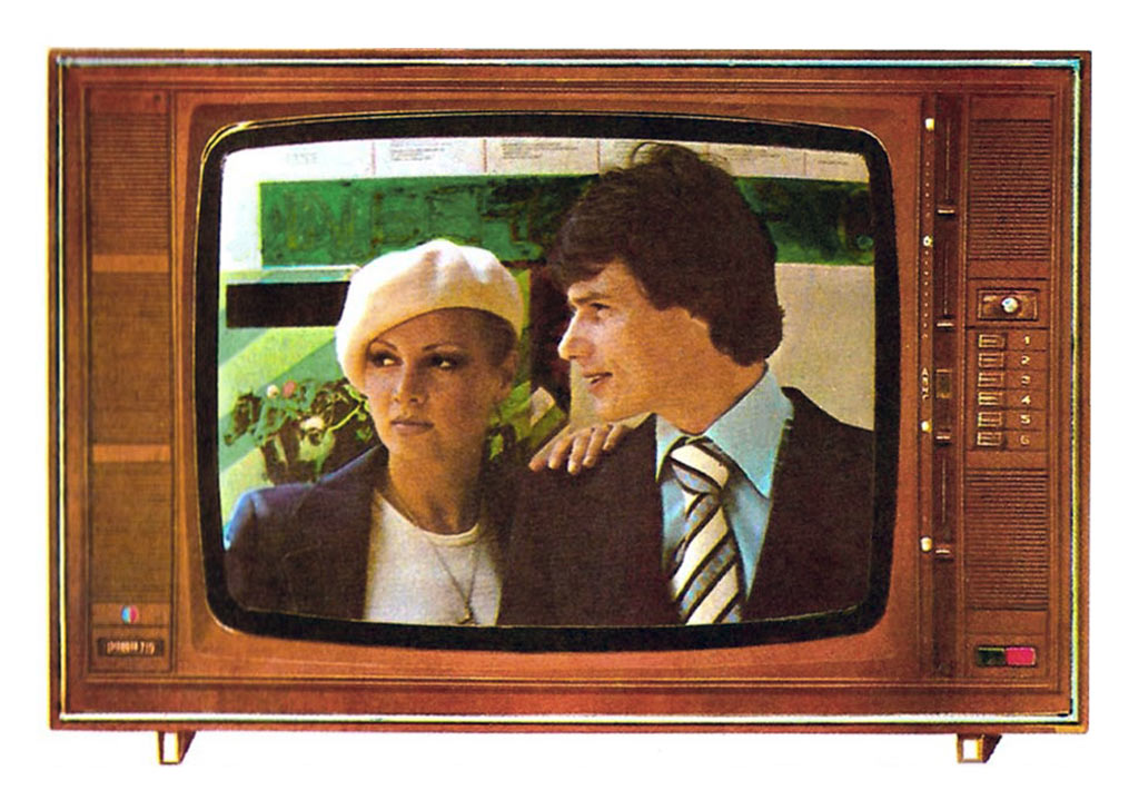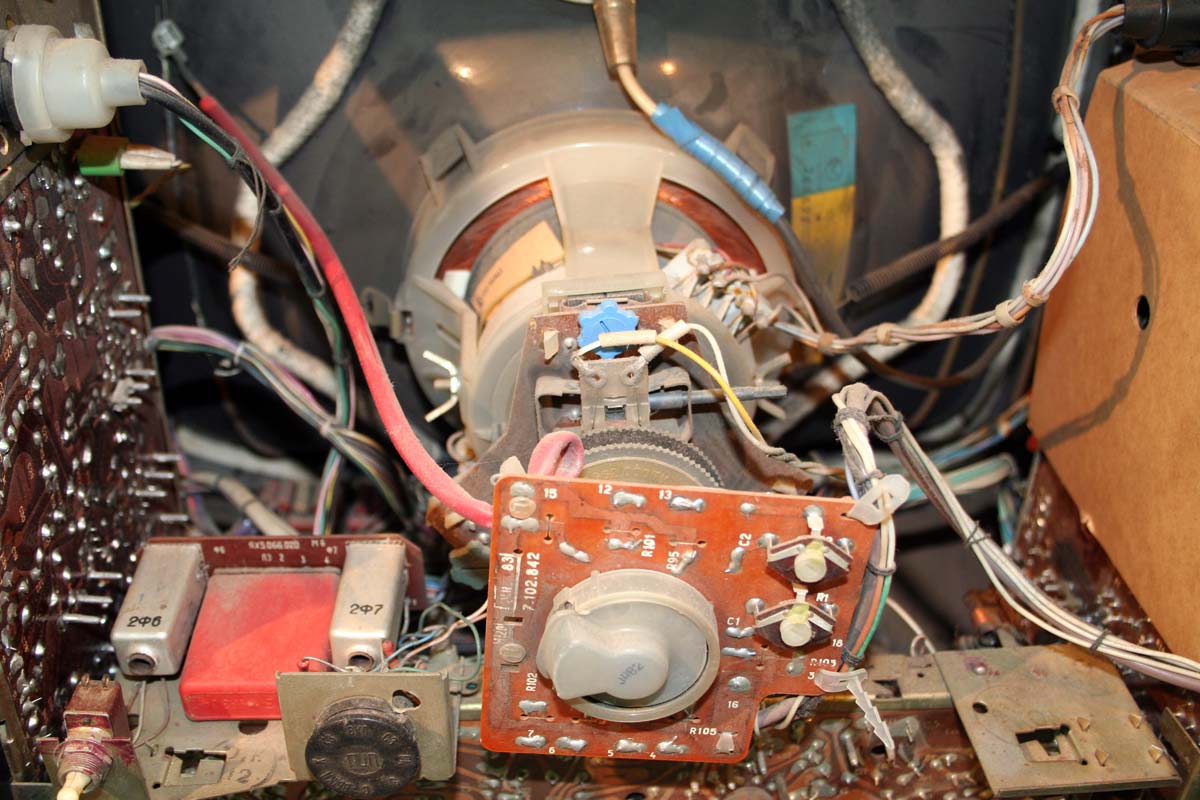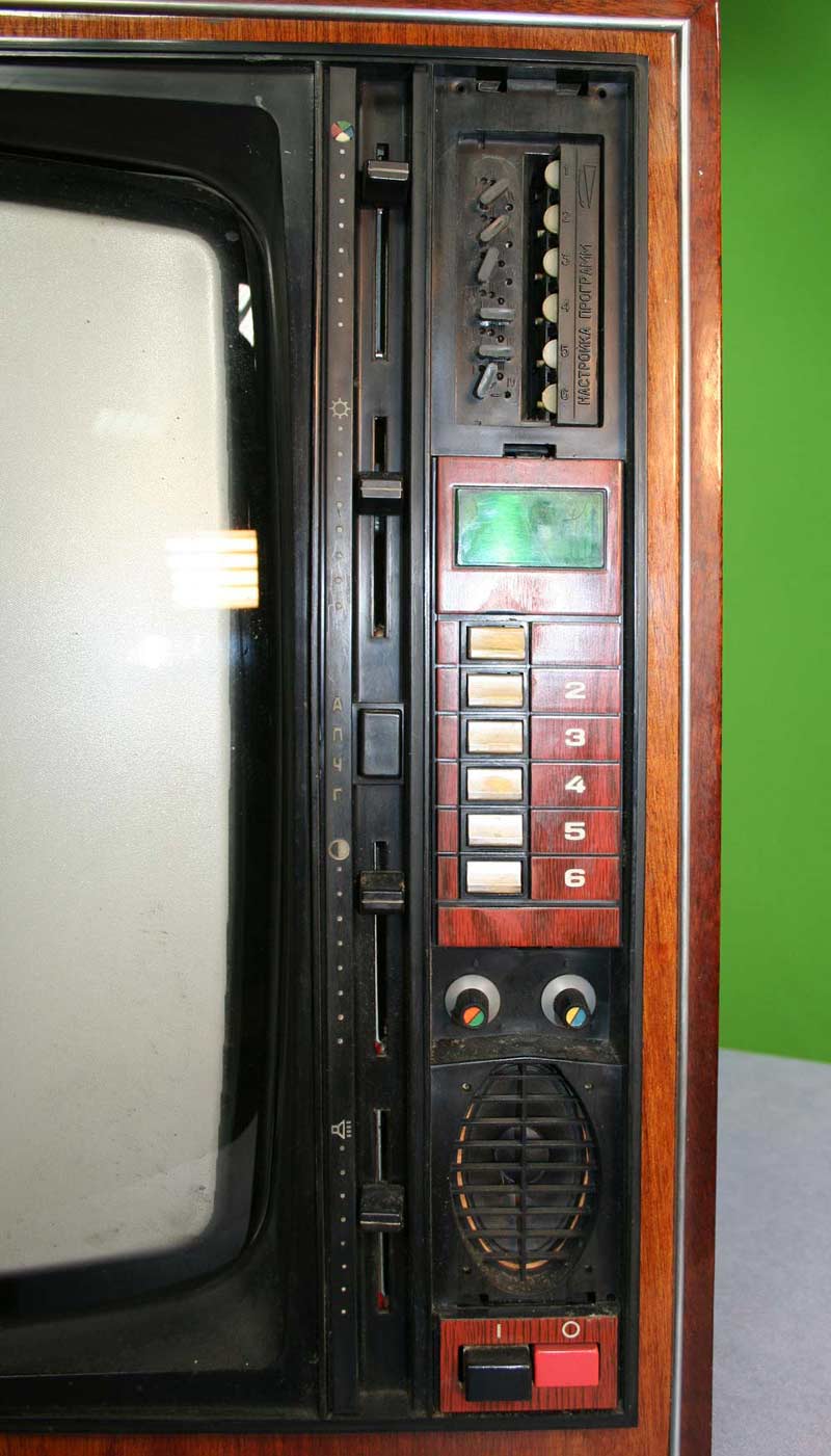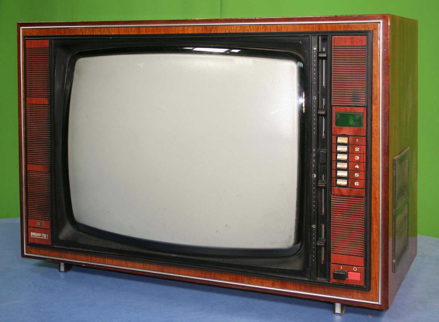 Телевизионный приёмник цветного изображения *Радуга-719* с 1978 года выпускал Ленинградский завод имени Козицкого. Унифицированный лампово-полупроводниковый цветной телевизионный приемник 2-го класса **Радуга-719** (УЛПЦТИ-61-II-12) предназначен для приёма программ цветного и ч/б изображения в МВ и ДМВ диапазонах (при установке блока ДМВ). Аппарат выпускался в настольном оформлении, с различными вариантами отделки. В телевизоре применён взрывозащищенный кинескоп 61ЛК3Ц или 61ЛК4Ц. Включение нужной программы производится посредством легкого нажима на соответствующую клавишу. Переключение происходит с помощью электронного устройства, а номер программы показывает цифровой индикатор, если предварительно сделан выбор нужного поддиапазона и отрегулировано положение потенциометра настройки. В телевизоре есть возможность: подключения магнитофона для записи звукового сопровождения; его прослушивание на головные телефоны при отключенной АС. Высокая чувствительность в сочетании с АРУ позволяет вести приём на удалении от телевизионного центра. АПЧГ повышает качество изображения и сохраняет его при переключении на другой канал. Регуляторы на передней панели позволяют изменять громкость, яркость, контрастность изображения, насыщенность. Для повышения качества приёма чёрно-белого изображения в схему введено автоматическое отключение режекторных фильтров. Уменьшение влияния помех достигается системой АПЧ и Ф. Схема ТВ предусматривает автоматическое поддержание размеров изображения при колебании напряжения сети в пределах 200...230 В и автоматическое размагничивание кинескопа при включении. Размер изображения 480x360 мм. Чувствительность в МВ 55 мкВ, ДМВ 90 мкВ. Разрешающая способность в центре 450 линий. Выходная мощность 2,3 Вт. Диапазон воспроизводимых частот 80...12500 Гц. Потребляемая мощность 250 Вт. Габариты телевизора 550x785x548 мм. Масса - 60 кг. Первые телевизоры *Радуга-719*, которые планировали выпускать с 1977 года для расширения ассортимента наименований имели вид модели *Радуга-716*, смотрите 1-е фото в галерее. Но потом оставили эту затею и с 1978 года начали полноценный, но ограниченный выпуск усовершенствованной модели *Радуга-719*, смотрите 2-е фото в галерее. С 1982 года массово выпускался телевизор *Радуга-719-1* - по унификации и оформлении практически аналогичный описанному, но с возможностью приёма программ в диапазоне ДМВ.