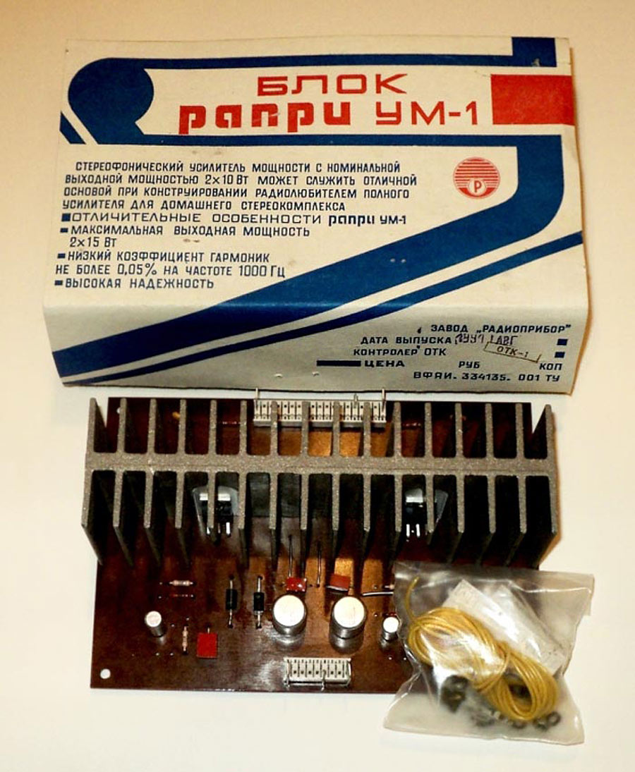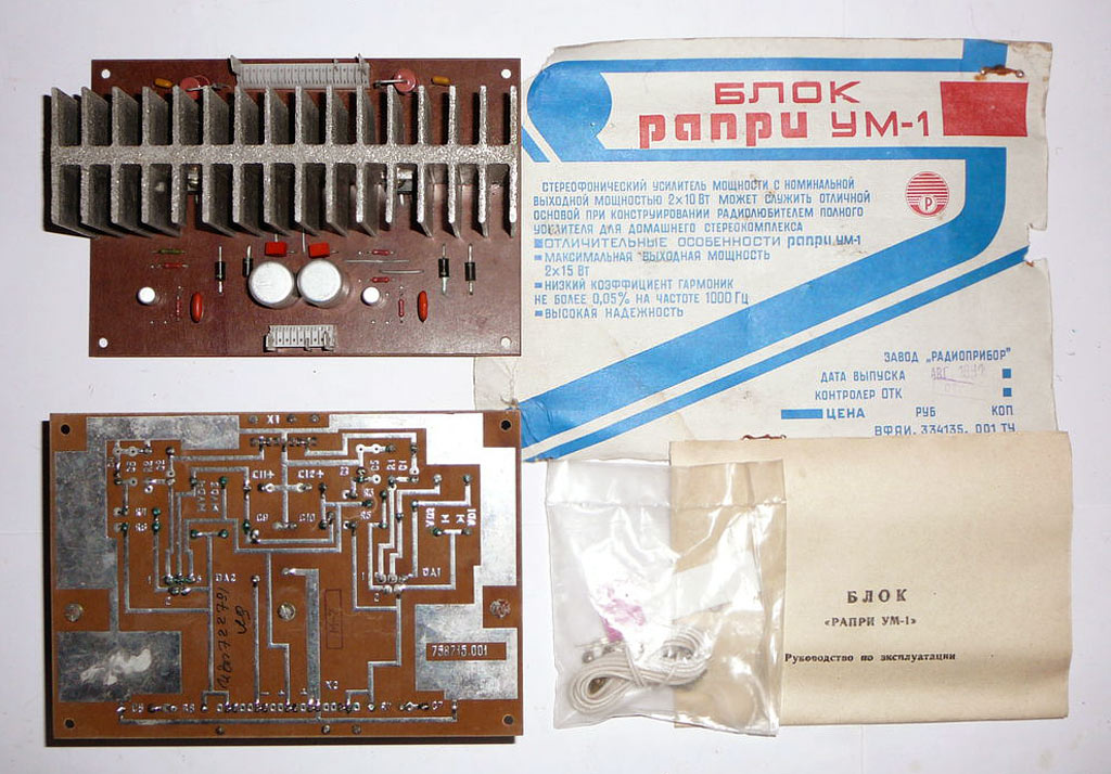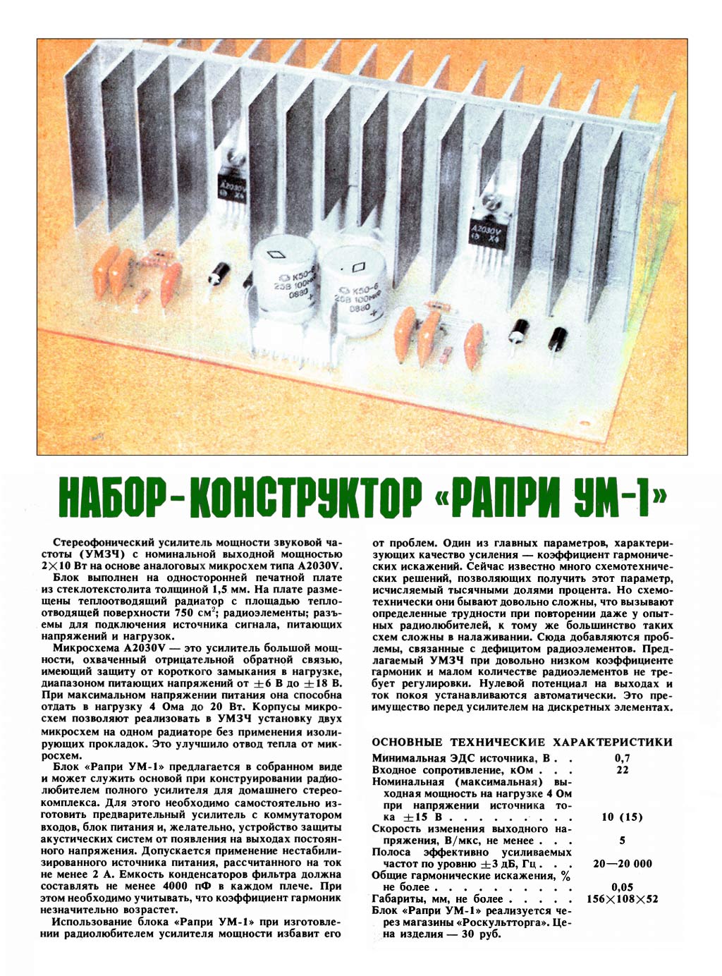 Радиоконструктор *Рапри УМ-1* (Усилитель мощности) выпускался с 1991 года. Стереофонический усилитель мощности с номинальной выходной мощностью 2х10 Вт собиран на аналоговых микросхемах A2030V. На плате размещены: теплоотводящий радиатор с площадью теплоотводящей поверхности 750 кв.см; радиоэлементы; разъёмы для подключения источника сигнала, питающих напряжений и нагрузок. A2030V - это усилитель большой мощности, охваченный отрицательной обратной связью, имеющий защиту от короткого замыкания нагрузки, диапазоном питающих напряжений от +6 В до ±18 В. При максимальном напряжении она способна отдать в нагрузку 4 Ома до 20 Вт. Микросхемы ставятся на общем радиаторе. Минимальная ЭДС источника сигнала 0,7 В. Входное сопротивление 22 кОм. Номинальная (максимальная) выходная мощность при напряжении источника тока ±15 В - 10 (15) Вт. Полоса воспроизводимых звуковых частот - 20...20000 Гц. Общие искажения 0,05%. Габариты УМ - 156х108х52 мм. Цена УМ - 30 рублей. УМ поставлялся собранным, для сборки совместно с предусилителем (тоже РК) полного усилителя ЗЧ.