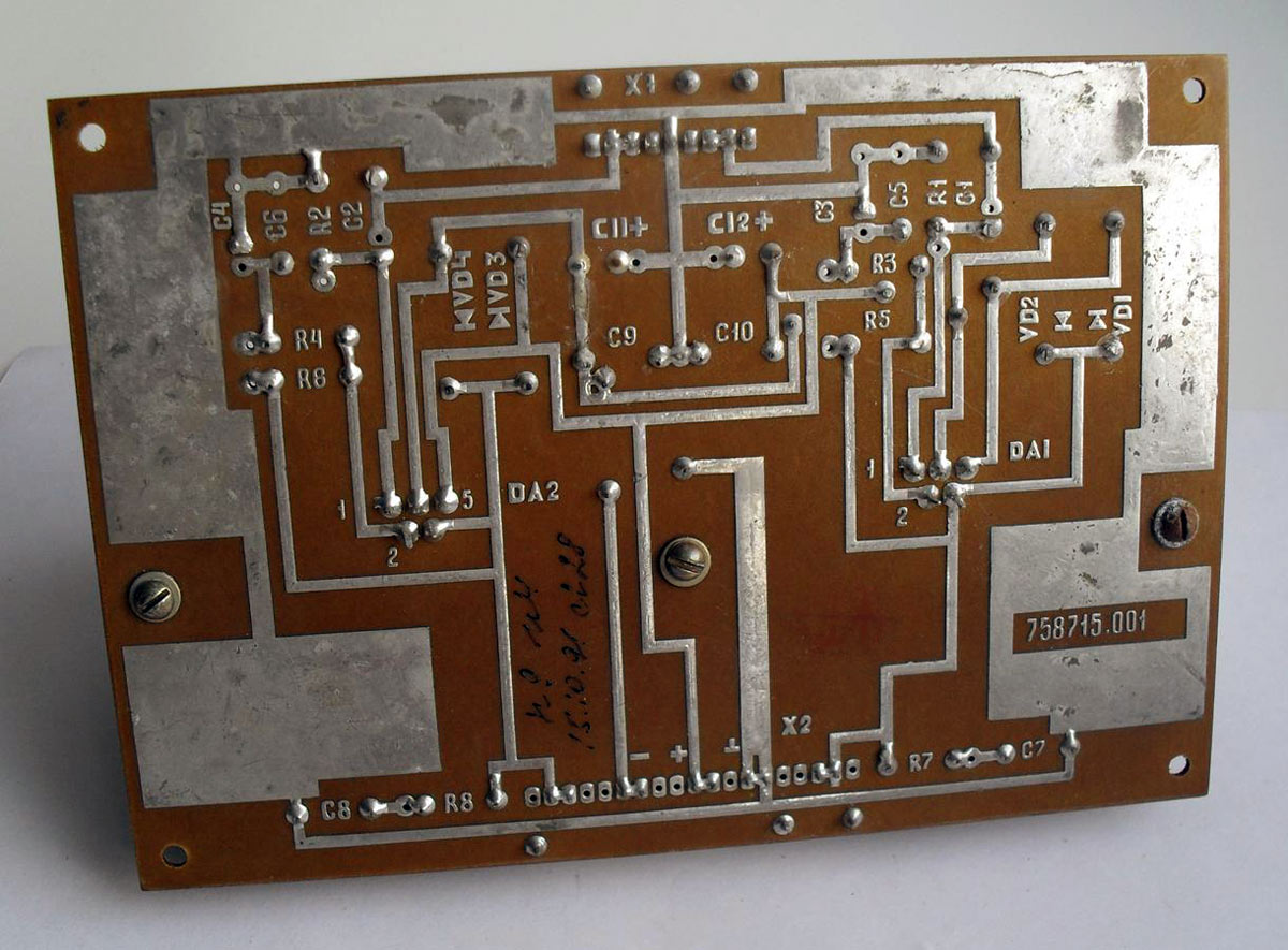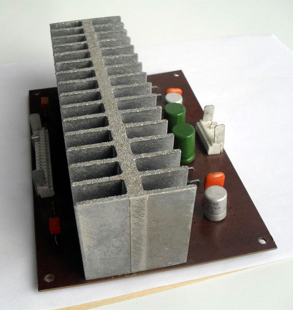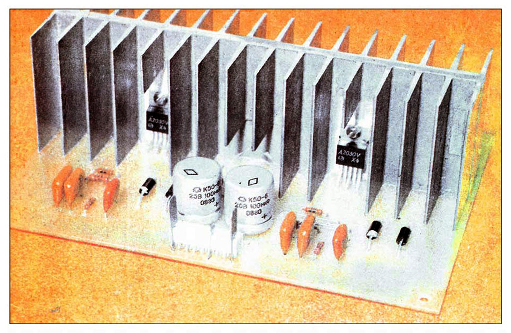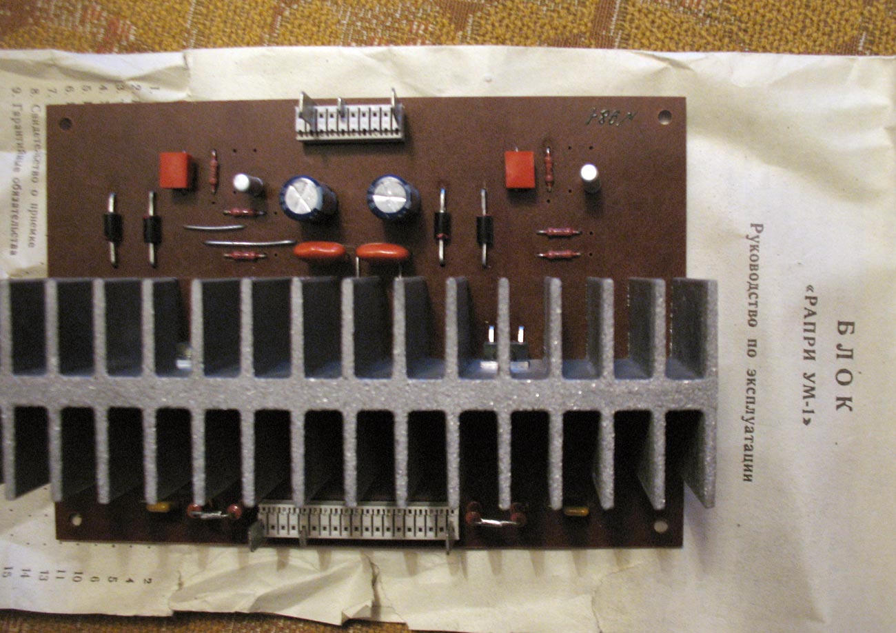 Радиоконструктор *Рапри УМ-1* (Усилитель мощности) выпускался с 1991 года. Стереофонический усилитель мощности с номинальной выходной мощностью 2х10 Вт собиран на аналоговых микросхемах A2030V. На плате размещены: теплоотводящий радиатор с площадью теплоотводящей поверхности 750 кв.см; радиоэлементы; разъёмы для подключения источника сигнала, питающих напряжений и нагрузок. A2030V - это усилитель большой мощности, охваченный отрицательной обратной связью, имеющий защиту от короткого замыкания нагрузки, диапазоном питающих напряжений от +6 В до ±18 В. При максимальном напряжении она способна отдать в нагрузку 4 Ома до 20 Вт. Микросхемы ставятся на общем радиаторе. Минимальная ЭДС источника сигнала 0,7 В. Входное сопротивление 22 кОм. Номинальная (максимальная) выходная мощность при напряжении источника тока ±15 В - 10 (15) Вт. Полоса воспроизводимых звуковых частот - 20...20000 Гц. Общие искажения 0,05%. Габариты УМ - 156х108х52 мм. Цена УМ - 30 рублей. УМ поставлялся собранным, для сборки совместно с предусилителем (тоже РК) полного усилителя ЗЧ.