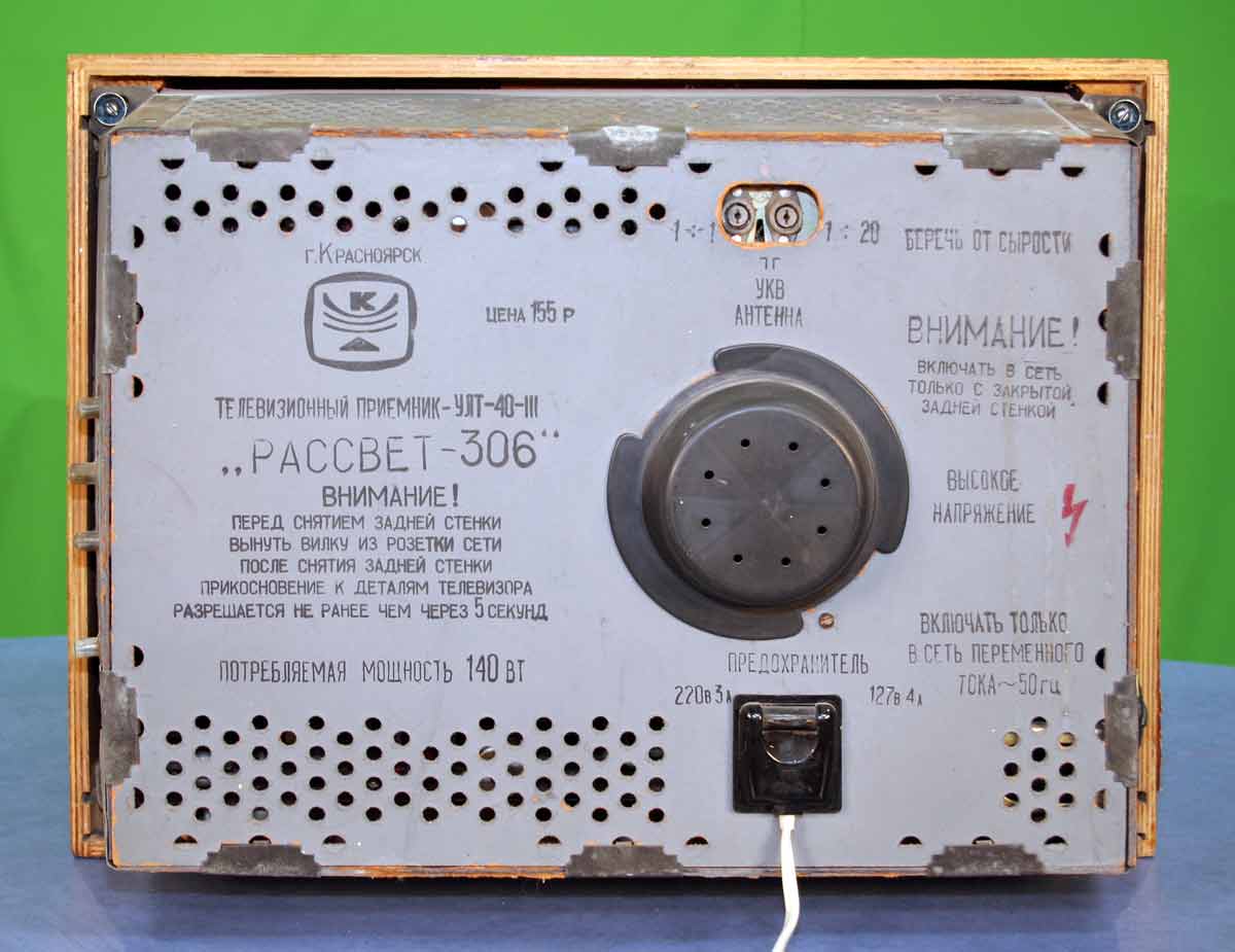 Телевизионный приёмник чёрно-белого изображения *Рассвет-306* с начала 1973 года выпускал Красноярский завод телевизоров. Телевизор выполнен в футляре из дерева с имитацией ценных пород, глянцевым покрытием. Он работает в любом из 12 каналов. В модели 14 ламп и 14 диодов. Переключатель каналов ПТК-10Б, кинескоп 40ЛК1Б. Имеются системы АРУ, АПЧ и Ф. Есть возможность подключения магнитофона на запись, прослушивания звука на головные телефоны, с отключенным громкоговорителем. Сзади телевизор закрыт крышкой с отверстиями для вентиляции. Основные ручки управления выведены на переднюю панель. Это ручки ПТК, настройки гетеродина, выключателя сети, громкости, контрастности, яркости. На задней стенке справа, расположены ручки регулировки линейности по вертикали и размера по горизонтали, частоты кадров и строк, переключатель напряжения сети. Акустическая система состоит из громкоговорителя 1ГД-36. Питание от сети напряжением 110, 127 или 220 В. Допустимы колебания напряжения около 10%. Чувствительность телевизора 200 мкВ. Номинальная выходная мощность 0,5 Вт. Диапазон частот воспроизводимых АС телевизора 150...7000 Гц. Потребляемая мощность 140 Вт. Габариты модели 497х440х385 мм. Вес 25 кг.