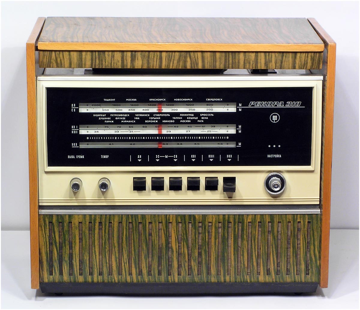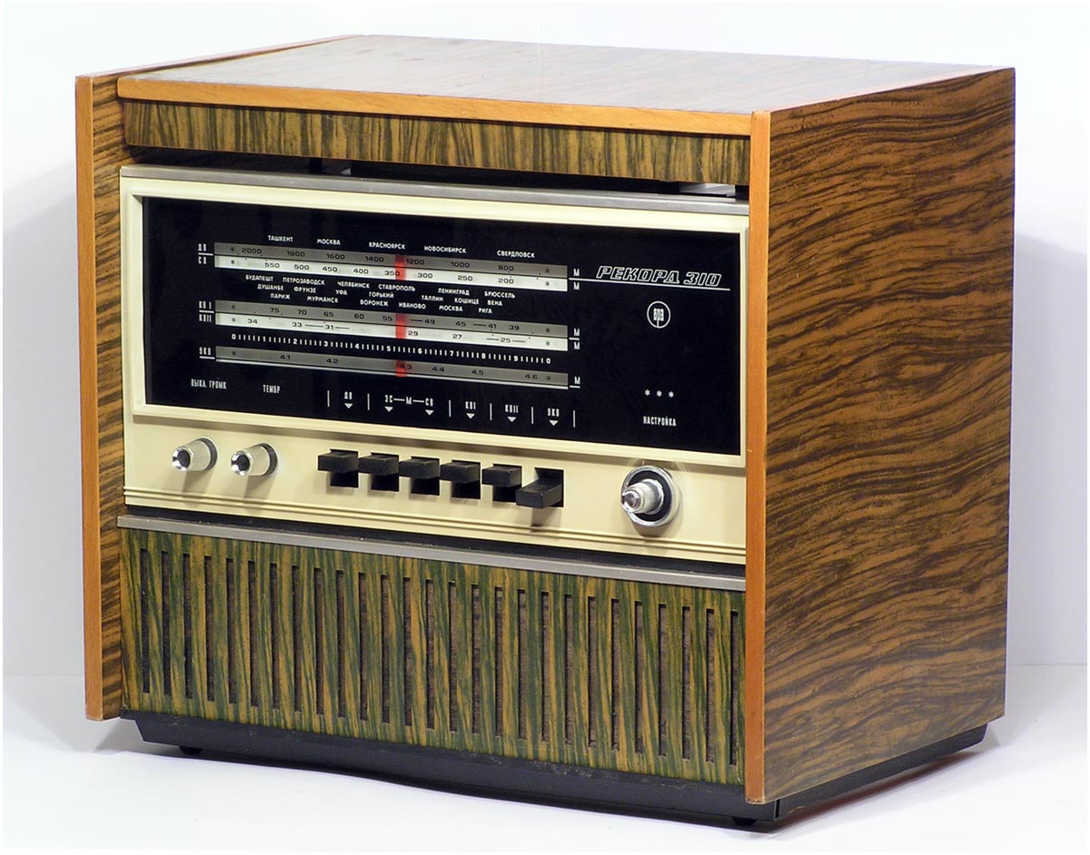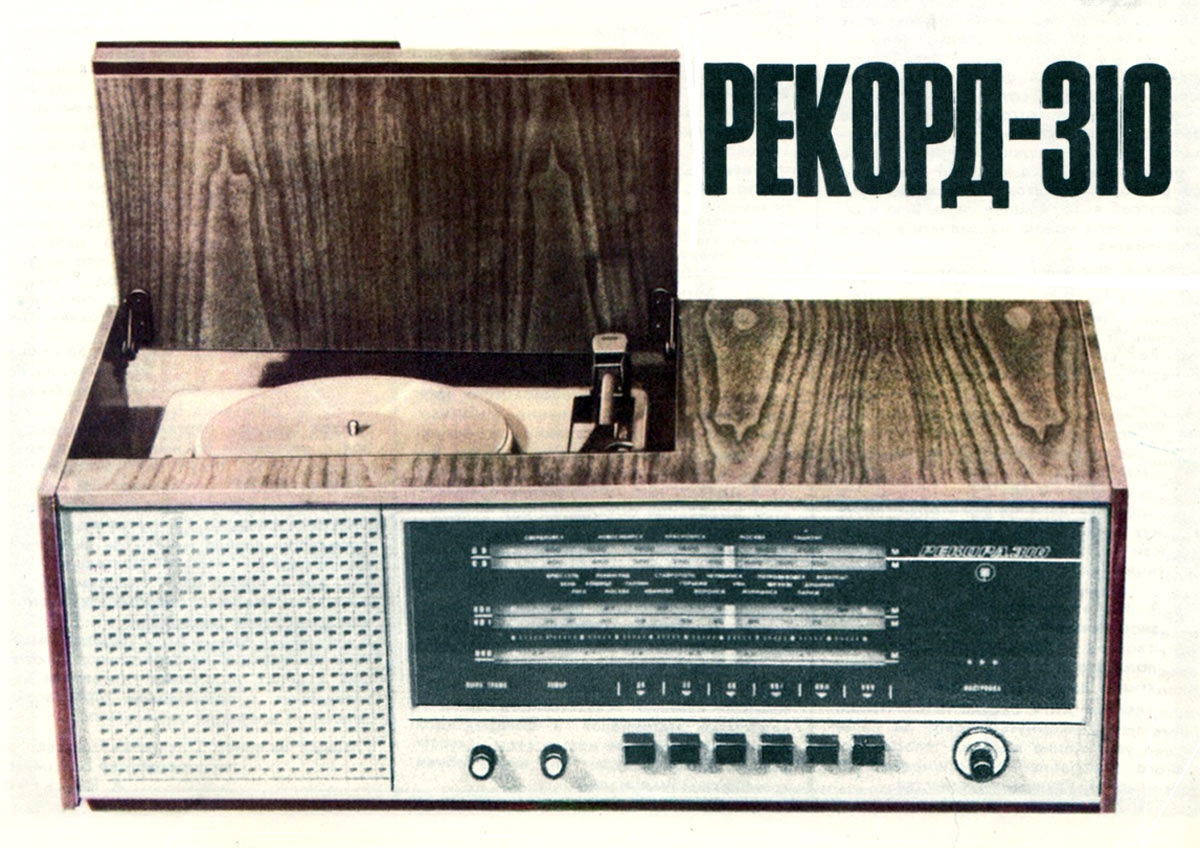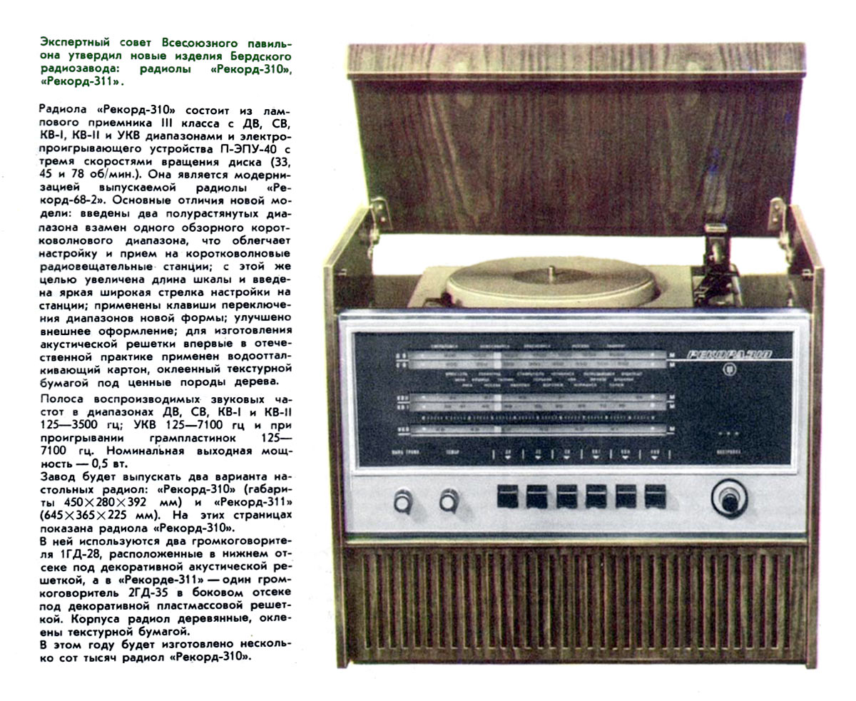 Сетевая унифицированная ламповая радиола третьего класса *Рекорд-310* с 1971 года выпускалась Бердским радиозаводом. Радиола состоит из приёмника 3-го класса и универсального трёхскоростного ЭПУ 2-го или 3-го класса, позволяющего воспроизводить записи с грампластинок любых форматов, со скоростью вращения диска: 33, 45 и 78 об/мин. Приёмник рассчитан на приём радиовещательных станций в диапазонах: ДВ, СВ, двух поддиапазонах КВ: KB1 - 75,9...40,0 м, КВ2 - 32...24,8 м и УКВ-ЧМ 4,54..4,11 м. Чувствительность в диапазонах ДВ, СВ - 200 мкВ, в 2-х поддиапазонах КВ - 300 мкВ, в диапазоне УКВ-ЧМ - 30 мкВ. Избирательность по соседнему каналу в диапазонах АМ 26 дБ. Номинальная выходная мощность усилителя низкой частоты 0,5 Вт, максимальная 1 Вт. Полоса воспроизводимых частот в тракте AM - 125...3500 Гц, тракте ЧМ и при прослушивании грамзаписи 125...7100 Гц. Питание радиолы осуществляется от сети переменного тока. Потребляемая мощность 60 Вт при приёме и 75 Вт при работе ЭПУ. Размеры радиолы 450х392х400 мм. Масса 12,5 кг.