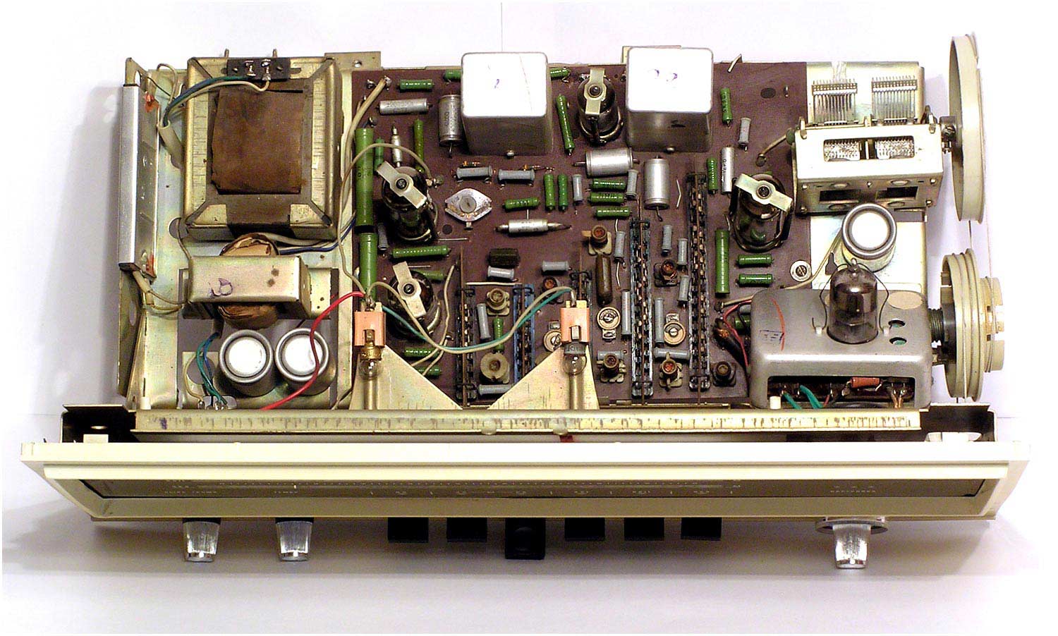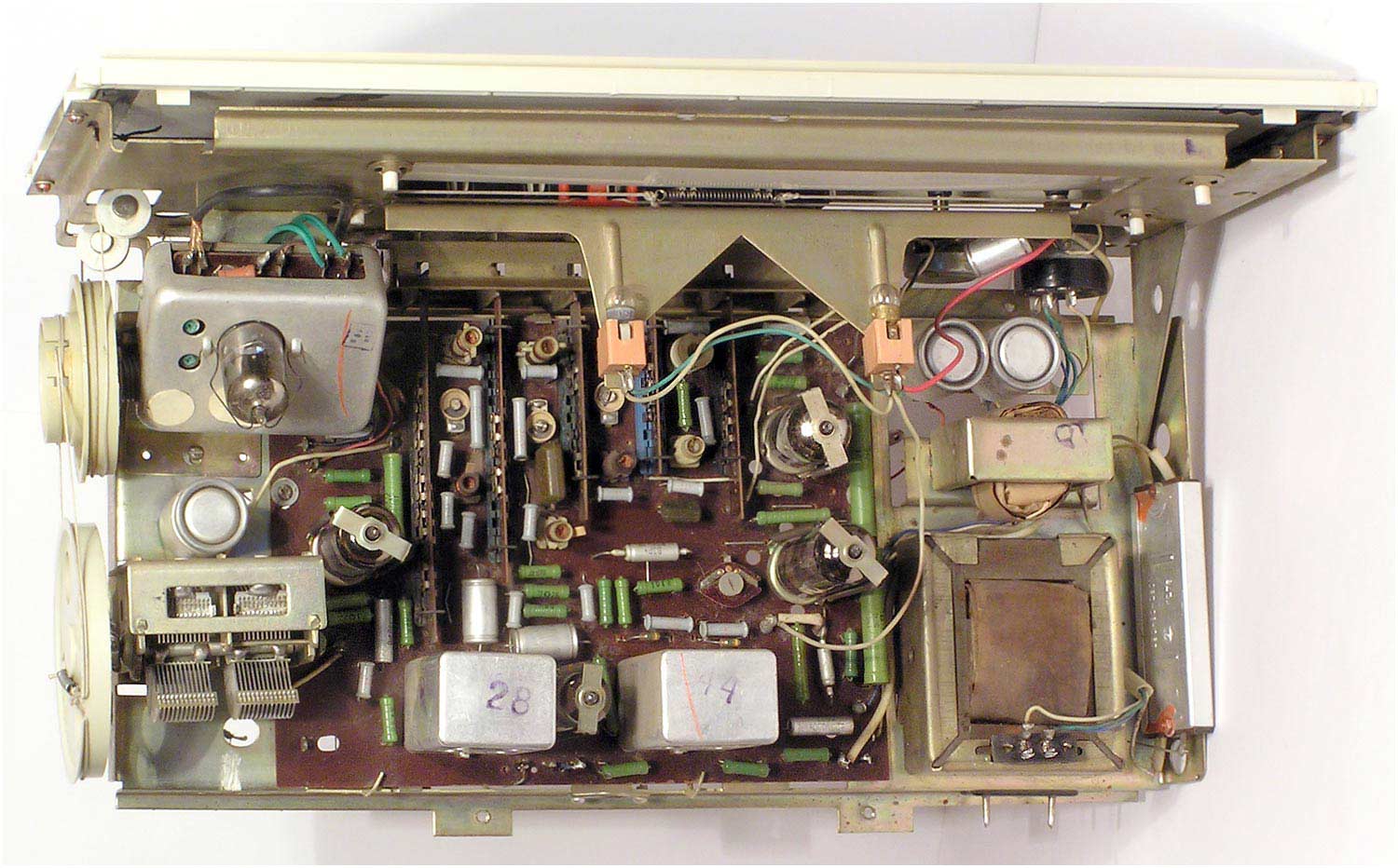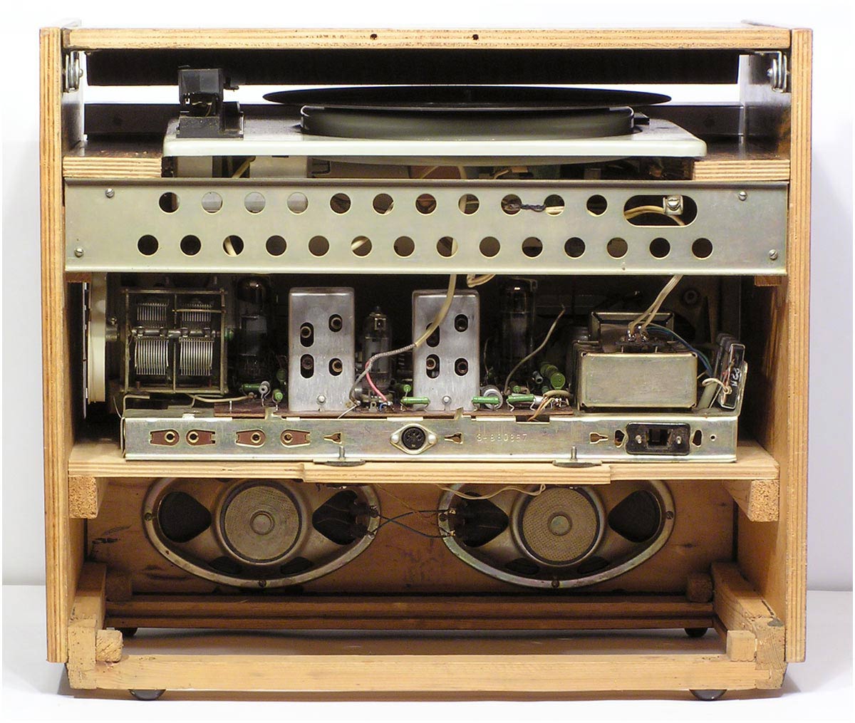 Сетевая унифицированная ламповая радиола третьего класса *Рекорд-310* с 1971 года выпускалась Бердским радиозаводом. Радиола состоит из приёмника 3-го класса и универсального трёхскоростного ЭПУ 2-го или 3-го класса, позволяющего воспроизводить записи с грампластинок любых форматов, со скоростью вращения диска: 33, 45 и 78 об/мин. Приёмник рассчитан на приём радиовещательных станций в диапазонах: ДВ, СВ, двух поддиапазонах КВ: KB1 - 75,9...40,0 м, КВ2 - 32...24,8 м и УКВ-ЧМ 4,54..4,11 м. Чувствительность в диапазонах ДВ, СВ - 200 мкВ, в 2-х поддиапазонах КВ - 300 мкВ, в диапазоне УКВ-ЧМ - 30 мкВ. Избирательность по соседнему каналу в диапазонах АМ 26 дБ. Номинальная выходная мощность усилителя низкой частоты 0,5 Вт, максимальная 1 Вт. Полоса воспроизводимых частот в тракте AM - 125...3500 Гц, тракте ЧМ и при прослушивании грамзаписи 125...7100 Гц. Питание радиолы осуществляется от сети переменного тока. Потребляемая мощность 60 Вт при приёме и 75 Вт при работе ЭПУ. Размеры радиолы 450х392х400 мм. Масса 12,5 кг.