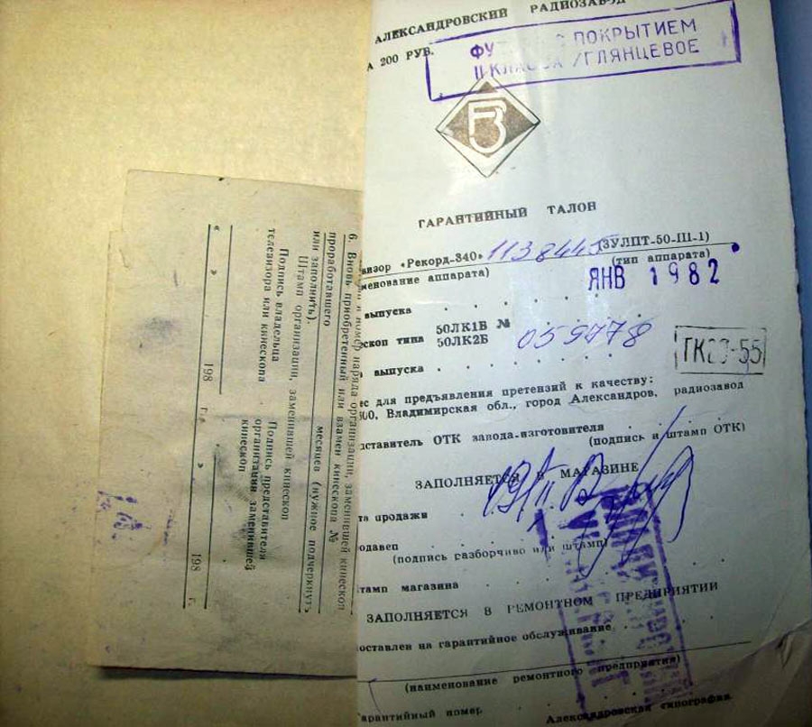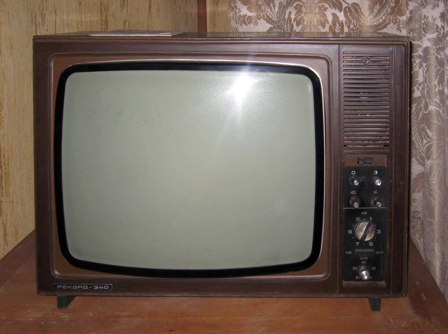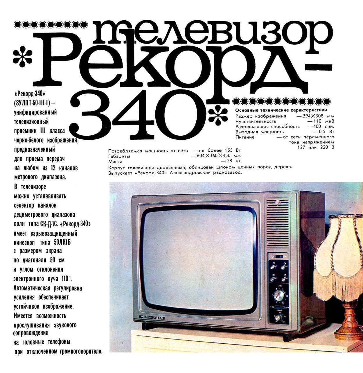 Телевизор *Рекорд-340* с 1980 года выпускал Александровский радиозавод. Очередное изменение номера на протяжении многих лет подряд в наименовании в общем то одного и того же телевизора, теперь модель **Рекорд-340**. За последние несколько лет ничего в конструкции телевизора практически не изменилось, кроме вариаций в его внешнем оформлении. Телевизор **Рекорд-340** (3УЛПТ-50-III-1) выпускался по унифицированной электрической схеме и конструкции. Размер по диагонали экрана видимой части кинескопа 50 сантиметров. Чувствительность с антенного входа 110 мкВ. Разрешающая способность 400 линий. Номинальная выходная мощность усилителя 0,5 Вт. Потребляемая мощность 155 Вт. Габариты телевизора 604х360х450 мм. Вес 28 кг. В модели устанавливали кинескоп 50ЛК1Б или 50ЛК2Б. Номера шасси были сквозные.