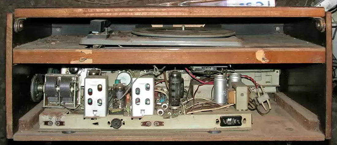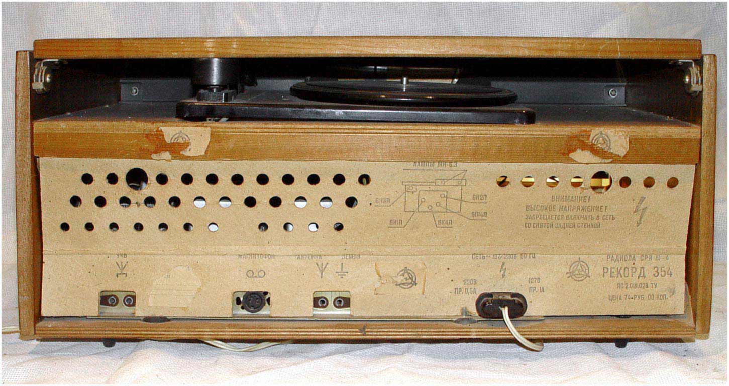 Радиола сетевая ламповая *Рекорд-354* с 1977 года выпускалась на Иркутском заводе радиоприёмников имени 50-летия СССР. Радиола 3 класса **Рекорд-354** предназначена для приёма местных и дальних радиовещательных станций в диапазонах длинных, средних, коротких и ультракоротких волн, а также для проигрывания грамзаписи с помощью электропроигрывающего устройства и записи или воспроизведения фонограмм с помощью магнитофона. Диапазоны принимаемых волн (или частот): Длинные волны (ДВ) - 2000...735,3 м (150...408 кГц). Средние волны (СВ) - 571,4...186,9 м (525...1605 кГц). Короткие волны (КВ) - 75,9...24,8 м (3,95...12,1МГц). Ультракороткие волны (УКВ) - 4,56...4,11 м (65,8...73,0МГц). Чувствительность не хуже: в диапазонах ДВ и СВ - 200 мкВ, в диапазоне КВ - 300 мкВ, в диапазоне УКВ-ЧМ - 30 мкВ. Избирательность (при расстройке на +/- 10 кГц) в диапазонах ДВ и СВ, не менее 26 дБ. Номинальная выходная мощность 0,5 Вт. При приёме радиостанций радиола воспроизводит полосу звуковых частот в диапазонах ДВ, СВ и КВ - 150...3500 Гц, в диапазоне УКВ - 150...7000 Гц. При проигрывании грампластинок или подключении магнитофона 150...7000 Гц. Питание радиолы осуществляется от сети переменного тока, напряжением 127 или 220 В, частотой 50 Гц. Мощность, потребляемая от сети 220 В не более 65 Вт. Габаритные размеры радиолы - 554х292х249 мм. Масса без упаковки - 13 кг, с упаковкой не более 17 кг. Розничная цена радиолы - 74 рубля 00 копеек. Радиола **Рекорд-354** стала последней моделью в линейке ламповых радиоприёмников и радиол из серии **Рекорд**.
