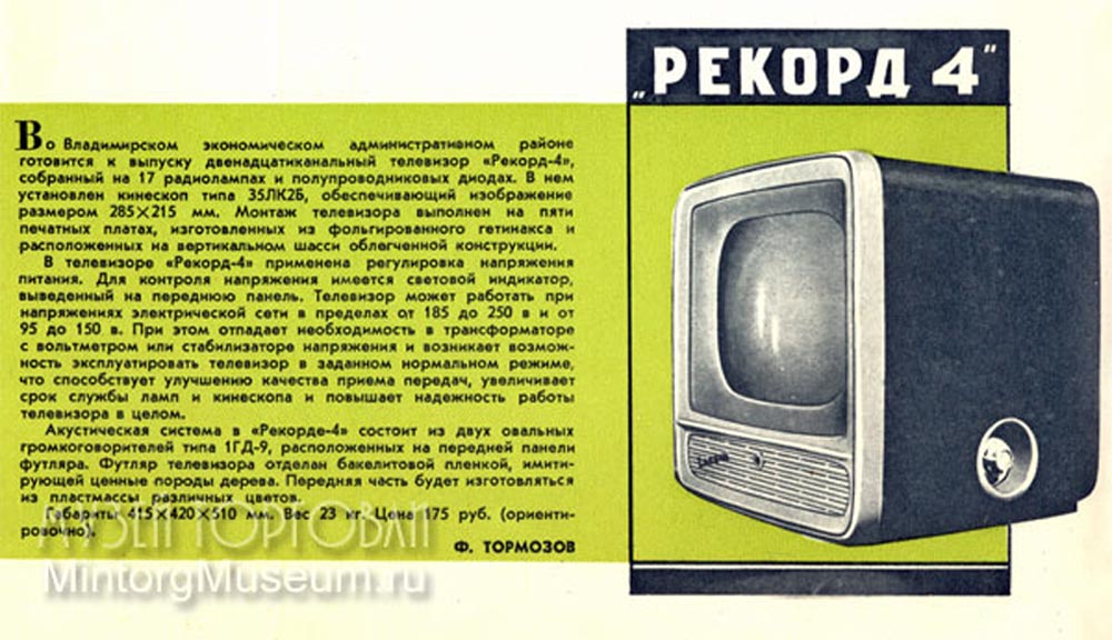 Телевизионный приёмник чёрно-белого изображения *Рекорд-4* с начала 1960 года выпускал Александровский радиозавод. Технология выпуска телевизора рассчитана на применение средств автоматизации и механизации. Телевизор **Рекорд-4** это модель 3-класса разработанная на смену модели **Рекорд-Б** и как альтернатива модели **Рекорд-12**. Телевизор **Рекорд-4** работает на любом из 12 каналов. Чувствительность ТВ 200 мкВ. Количество ламп 17. Кинескоп 35ЛК2Б с размером изображения 285х215 мм. Разрешающая способность по горизонтали 350, по вертикали 450 линий. Потребляемая мощность 140 Вт при просмотре программ и 35 Вт при прослушивании грамзаписи. По сравнению с телевизором **Рекорд-Б** модель имеет ряд схемных и конструктивных достоинств. Это автоматические регулировки усиления и яркости, автоматическая подстройка частоты строк и фазы, регулировка тембра. Монтаж выполнен на 5-ти печатных платах из фольгированного гетинакса расположенных на вертикальном шасси. Платы соединены при помощи разъёмов. В телевизоре применена регулировка напряжения сети со световым индикатором и регулятором, выведенным на переднюю панель. При напряжении в сети от 185 до 250 В, можно поддерживать напряжение 220 В. При питании от сети 127 В эти пределы будут 95...150 В. Это даёт возможность эксплуатировать телевизор в заданном режиме, что улучшает качество приёма и надёжность. Имеется вход звукоснимателя, что позволяет воспроизводить грамзапись. Имеется гнездо приставки для приёма ЧМ станций и гнёзда для подключения головных телефонов. Футляр телевизора состоит из двух элементов, изготовленных механизированным способом; гнутой обечайки из прессованного картона, отделанной под ценные породы и пластмассовой передней панели. На нижней раме ТВ, несущей крепление кинескопа размещены два динамика 1ГД-9 и индикатор напряжения сети. Справа футляра выведены ручка ПТК и гетеродина. Слева, ручки громкости с выключателем сети, контрастности, тембра, размера по вертикали, частоты кадров и линейности. Размеры телевизора 420х420х515 мм. Вес 23 кг.