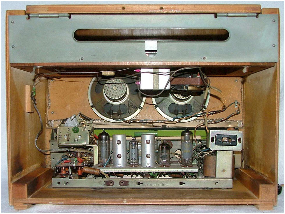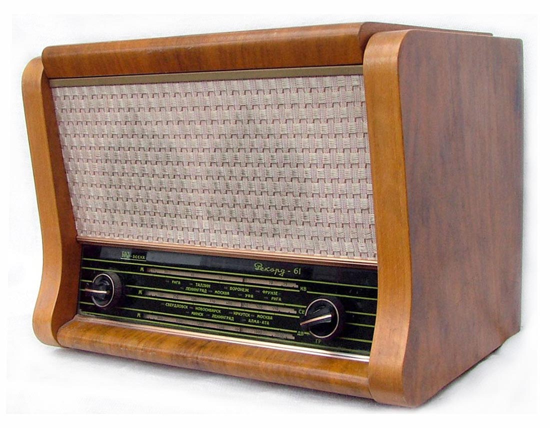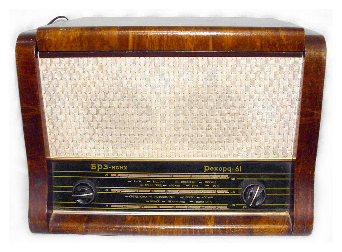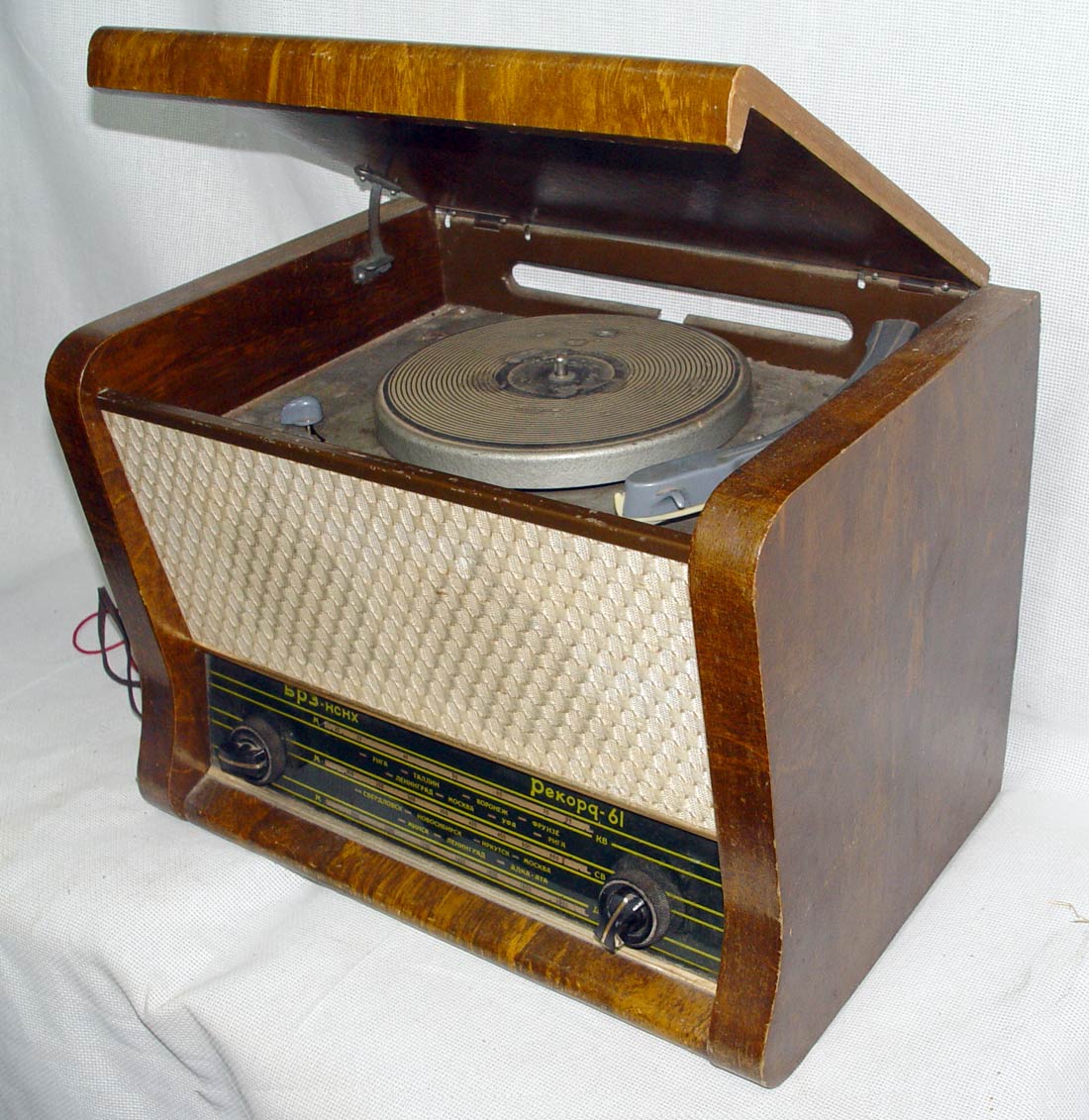 Сетевая ламповая радиола *Рекорд-61* с 1961 года выпускалась Бердским радиозаводом. Радиола предназначена для приёма в диапазонах ДВ, СВ и КВ (76...24,8 м) волн. Трехскоростной, на 33, 45 и 78 об/мин электропроигрыватель радиолы позволяет проигрывать обычные и долгоиграющие грампластинки. Промежуточная частота 465 кГц. Избирательность по соседнему каналу 30 дБ. Чувствительность на всех диапазонах 200 мкВ. Выходная мощность на двух громкоговорителях типа 1ГД-5 - 0,5 Вт. Диапазон воспроизводимых частот при приёме 100...4000 Гц, при проигрывании грампластинок 100...6000 Гц. Мощность потребляемая от сети при проигрывании пластинок 55 Вт, при работе на приём 40 Вт. Монтаж радиолы выполнен навесным способом. В первых выпусках в преобразователе стояла радиолампа 6А7. В 1962 году радиола была модернизирована, получив новый, более современный футляр. Электрическая схема радиолы осталась прежняя, но монтаж, кроме контуров был выполнен печатным способом. В документации и схемах радиолы (не везде) появилась буква *М*. Радиола выпускалась и в старом футляре, причём в более массовом количестве. В 1962 году была предпринята попытка выпустить радиолу *Рекорд-61* с клавишным переключателем диапазонов и в новом оформлении, но кроме изготовления опытных радиол дальше не пошло. Радиолу *Рекорд-61* в 2-х видах оформления футляра выпускали до августа 1965 года.