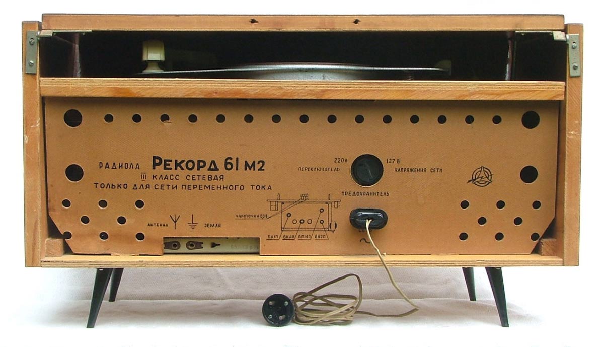 Радиола 3-го класса *Рекорд-61М2* с 1962 года выпускалась Иркутским заводом радиоприёмников. Радиола создана на основе модели **Рекорд-61** Бердского радиозавода. В новой радиоле изменена шкала, применён печатный монтаж и клавишный переключатель. В радиолу установлен новый громкоговоритель 2ГД-8, усовершенствована схема, изменено шасси. Диапазоны рабочих частот: ДВ, СВ и КВ - 3,95...12,1 МГц (75,9...24,8 м). ПЧ = 465 кГц. Чувствительность в диапазонах ДВ, СВ 200 мкВ, на КВ 300 мкВ. Избирательность по соседнему каналу 26 дБ. Номинальная выходная мощность 0,5 Вт. Полоса воспроизводимых частот при приёме 150...3500 Гц, при воспроизведении грамзаписи 150...6000 Гц. Потребляемая мощность при приёме 40 Вт, при воспроизведении грамзаписи около 55 Вт. Габариты радиолы - 600х320х270 мм. Масса 13 кг. Бердский радиозавод с 1962 года малосерийно выпускал такую же радиолу, но ещё под старым наименованием *Рекорд-61*.