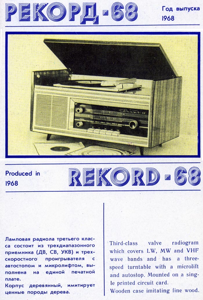 Радиола сетевая ламповая *Рекорд-68* в 1968 году выпускалась Бердским радиозаводом. Редкая радиола по наименованию радиола *Рекорд-68* производилась 8 месяцев, после чего заменена на модель **Рекорд-68-2**. Радиола *Рекорд-68* состоит из 5-ти лампового приёмника 3-го класса и универсального ЭПУ типа III-ЭПУ-17 или II-ЭПУ-40. Радиола работает в диапазонах ДВ, СВ и УКВ. Чувствительность приёмника в диапазонах ДВ, СВ 200 мкВ, УКВ 30 мкВ. Номинальная выходная мощность 0,5 Вт, максимальная 1 Вт. Диапазон воспроизводимых звуковых частот в тракте AM - 150...3500 Гц, ЧМ - 125...7500 Гц. Громкоговоритель 2ГД-19М. Питание радиолы осуществляется от сети 127 или 220 В. Потребляемая мощность при приёме 60 Вт, воспроизведении грамзаписи 75 Вт. Габариты радиолы 535х275х255 мм. Вес 13 кг. В радиоле в отличии от 2-й модели, 2-я клавиша включала внешний магнитофон, а клавиши ДВ, СВ были сдвинуты к клавише УКВ. Заводом было выпущено около 10 тысяч радиол *Рекорд-68*.