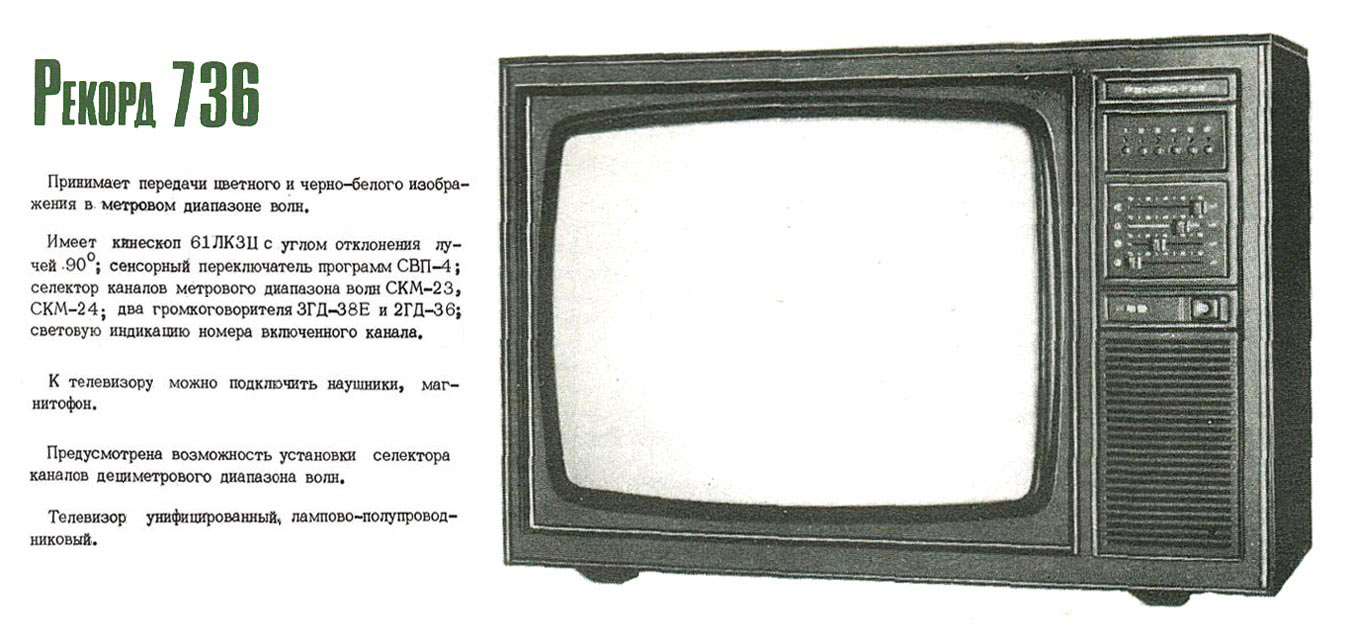 Цветной телевизионный приёмник *Рекорд-736* подготовил к выпуску с 1980 года *Александровский радиозавод*. В производство ТВ не пошёл.