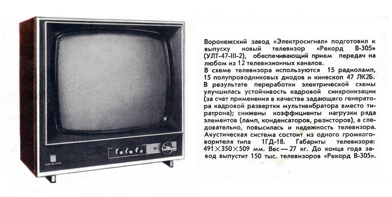 Телевизор ч/б изображения *Рекорд В-305* с 1971 года выпускал Воронежский завод *Электросигнал*. Унифицированный ламповый телевизор 3-го класса **Рекорд В-305** серия (УЛТ-47-III-2) рассчитан на приём передач телевидения на любом из 12 каналов диапазона МВ. Электрическая схема и конструкция телевизора практически аналогична телевизору **Рекорд В-301**, лишь немного изменилось оформление. В телевизоре применён кинескоп 47ЛК2Б, громкоговоритель 1ГД-18. Чувствительность ТВ - 150 мкВ. Номинальная выходная мощность 0,5 Вт. Диапазон воспроизводимых частот 125...7100 Гц. Потребляемая мощность 160 Вт. Размеры ТВ 509х491х350 мм. Масса 27 кг. Была серия телевизоров для установки на ножках.