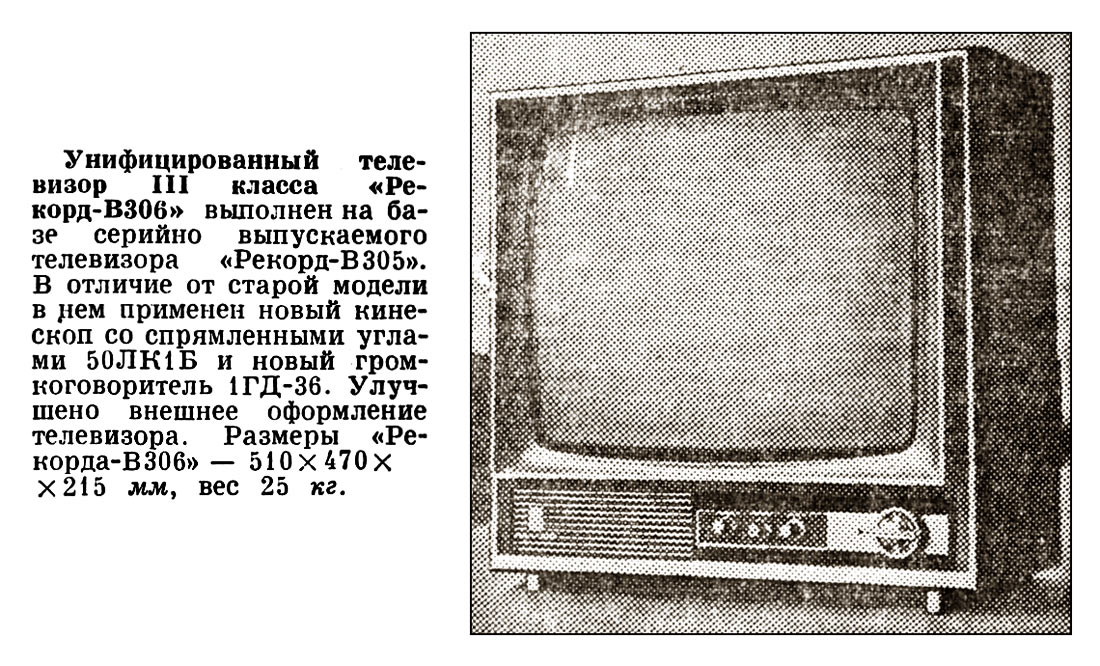 Телевизор *Рекорд В-306* с 1972 года выпускал Воронежский завод *Электросигнал*. Унифицированный ламповый ч/б телевизор 3-го класса **Рекорд В-306** (УЛТ-50-III-2) это дальнейшая модернизация телевизоров **Рекорд** Воронежского завода **Электросигнал**. Модель выполнена на базе телевизора **Рекорд В-305**. В телевизоре применён кинескоп со спрямлёнными углами 50ЛК1Б. Улучшено внешнее оформление. Габариты телевизора 520 х 500 х 370 мм. Масса 29 кг. Розничная цена 230 рублей. Характеристики телевизора соответствуют предыдущему аппарату.