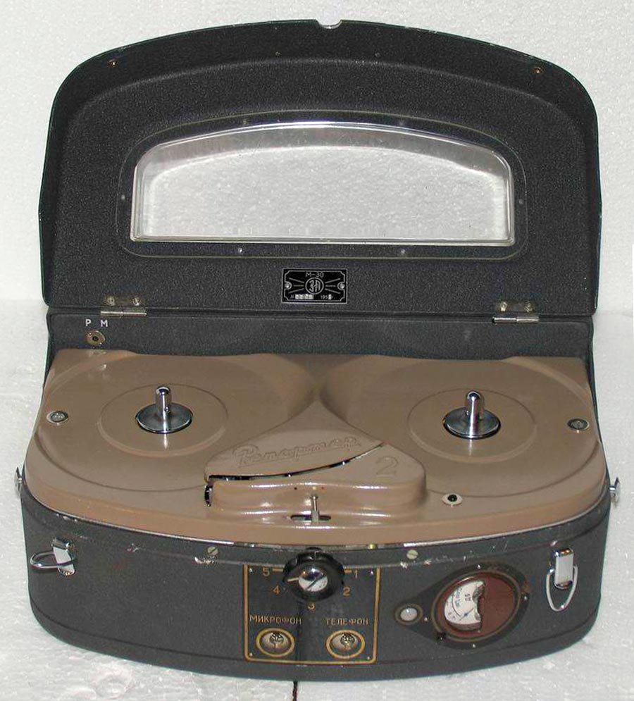 Портативный магнитофон *Репортёр-2* (М-30) с осени 1957 года выпускал Горьковский завод имени Г.И.Петровского. Магнитофон разработан ещё в 1956 году и предназначен для репортёрской записи речи или речи с музыкальным сопровождением и работает от батарей. Запись осуществляется от микрофона МД-35. Отдельный усилитель воспроизведения позволяет контролировать запись непосредственно с магнитной ленты. Контроль записи осуществляется индикатором или головным телефоном. Магнитофон позволяет производить перезапись с выхода на студийные магнитофоны. Аппарат размещен в чехле, в верхней части которого имеется карман для 2-х запасных кассет. Переноска производится с помощью плечевого ремня. Запись можно производить не вынимая магнитофона из чехла. ЛПМ собран на одном двигателе ДКС-8. Усилители записи и воспроизведения выполнены на семи радиолампах типов 0,6П2Б и 2П1П. Магнитофон может работать в любом положении и на ходу. При закрытой крышке за катушками с магнитной лентой можно наблюдать через специальное окно. Управление аппаратом осуществляется одной ручкой. Вращательным движением включается питание усилителей и регулируется уровень записи (причём регулировка уровня воспроизведения отсутствует). Поступательное движение ручки выключает и включает ЛПМ на рабочий ход. Включение на запись и воспроизведение осуществляется отдельной ручкой, находящейся под крышкой ящика. Предусмотрена блокировка включения на запись с помощью дополнительной кнопки. Имеется возможность обратной перемотки ленты. Устройство для стирания записи в модели не предусмотрено. Аппарат работает на заранее размагниченной ленте типа 2 или СН. Скорость движения ленты 19,05 см/сек. Длительность непрерывной записи 15 минут. Сквозная частотная характеристика от 50 до 10000 Гц. Уровень шумов не хуже 55 дБ. Нелинейные искажения - 3%. Длительность обратной перемотки до 3 минут. Вход микрофона несимметричный. Выходное напряжение 1 В. Коэффициент детонации ЛПМ 0,5%. Габариты магнитофона - 300х230х118 мм. Масса без принадлежностей 6,5 кг, с принадлежностями 8 кг.
