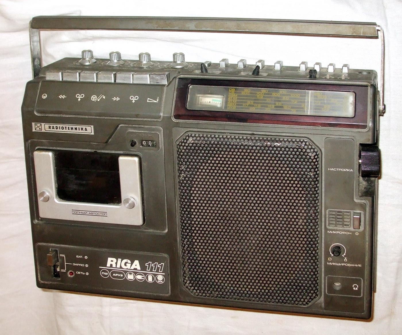 Переносная кассетная магнитола *Рига-111* с 1984 года выпускалась Рижским радиозаводом им. Попова. Магнитола является обновлением модели *Рига-110* и состоит из приёмника, работающегой в диапазонах ДВ, СВ, КВ-1...КВ-4, УКВ и кассетного магнитофона. Конструкцией предусмотрены: 3 фиксированные настройки в диапазонах ДВ, СВ и УКВ. АПЧ в УКВ-ЧМ диапазоне, электретный микрофон, АРУЗ, стрелочный индикатор настройки, уровня записи и питания, автостоп по окончании кассеты, возможность подключения АС и головных телефонов. Питается магнитола от сети или 6 элементов 373. Чувствительность в диапазонах: ДВ - 2 мВ/м, СВ - 1,5 мВ/м, КВ - 0,35 мв/м, УКВ - 100 мкВ. Диапазон частот в АМ тракте 200...3550 Гц, ЧМ 125...12500 Гц, магнитной записи на ЛВ - 63...10000 Гц. Номинальная выходная мощность 1 Вт. Габариты модели 386х280х120 мм, вес 6,5 кг.