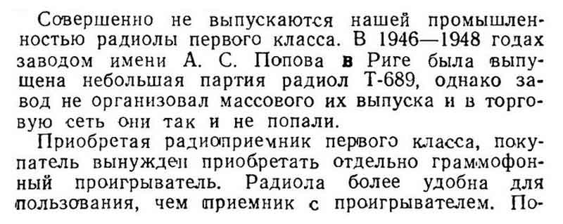 Радиола сетевая ламповая *Рига-Т 689* разработал в 1946 году Рижский завод *Радиотехника*. Радиола *Рига Т-689* возможно эта, возможно в другом исполнении была разработана конструкторским отделом завода *Радиотехника*. Была выпущена опытная серия, но в массовое производство модель не пошла, выпускался только одноимённый приёмник. На его основе создано много самодельных радиол, об этом есть информация на сайте *Старое Радио*.