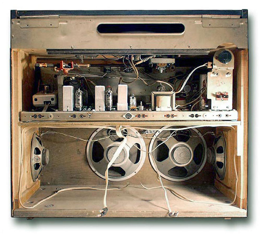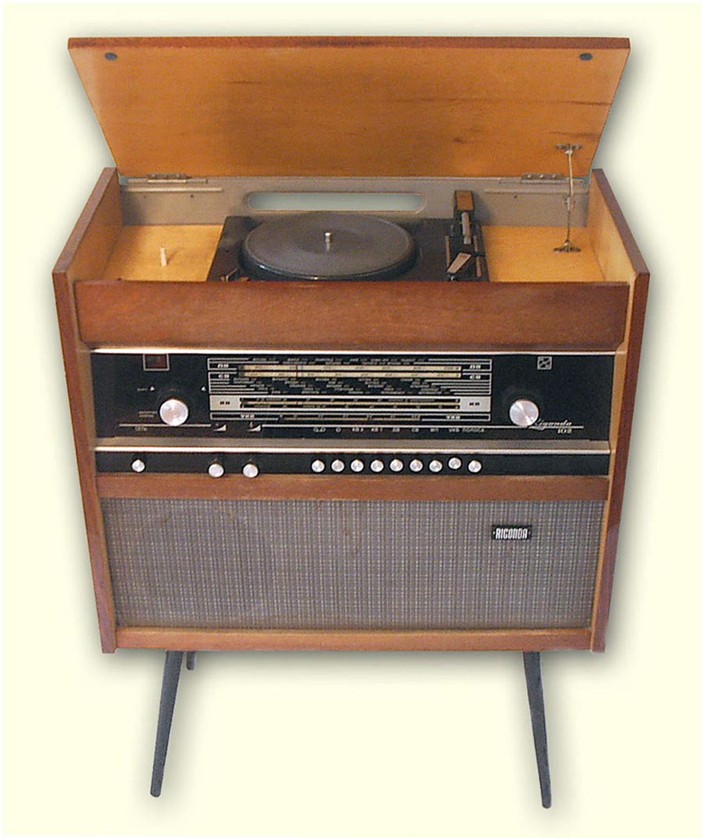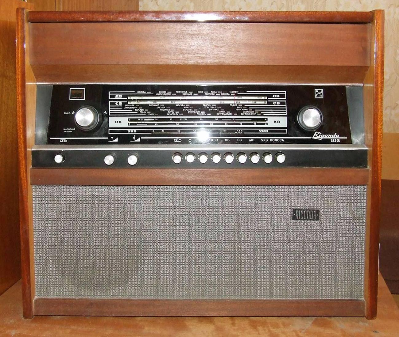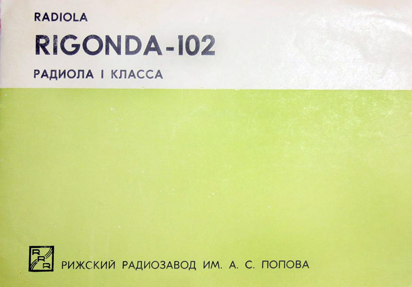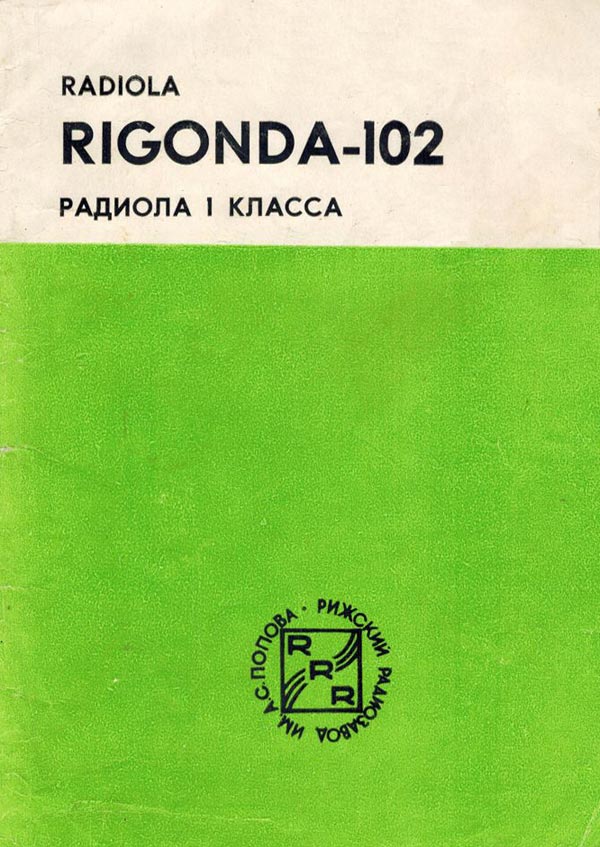 Радиола сетевая ламповая *Ригонда-102* с 1970 года выпускалась Рижским радиозаводом имени А.С.Попова. Монофоническая сетевая радиола 1-го класса **Ригонда-102** заменила радиолу **Ригонда-Моно**. В сравнении с прежней, она обеспечивает более уверенный приём и лучшее качество звука. В радиоле **Ригонда-102** почти в 2 раза увеличена выходная мощность, в 2-3 раза чувствительность индикатора настройки. Улучшена АРУ. Введена отдельная клавиша магнитофон, позволяющая вести запись на магнитную ленту при приёме и при проигрывании грамзаписи. Повышена надёжность заменой выпрямителя ABС-80х260 работавшего в предельном режиме, на сборку КЦ-401Б. Улучшено оформление радиолы. По другим параметрам радиола аналогична прежней модели, радиоле **Ригонда-моно**. Цена новой радиолы 150 рублей. Приёмник радиолы **Ригонда-102** рассчитан на приём передач радиостанций, работающих в диапазонах ДВ - 150...408 кгц (200...735,3 м); СВ - 525...1605 кгц (571,4...186,9 м) двух коротковолновых КВ-2 3,95...7,4 Мгц (75,9...40,5 м), KB-1 9,36...12,1 Мгц (32,0...24,7 м), и УКВ - 65,8...73 Мгц (4,56...4,11 м) волн. Чувствительность приёмника в ДВ, СВ и КВ диапазонах 20...60 мкв, в УКВ-ЧМ диапазоне 3...6 мкв. Избирательность по соседнему каналу в АМ тракте - 66 дб. Номинальная выходная мощность радиолы 3 вт, максимальная 7...10 вт. Акустическая система радиолы состоит из четырех громкоговорителей: двух 4ГД-28 (позже заменённых одним 4ГД-35) и двух 1ГД-28 (позже 1ГД-36). Звуковое давление при номинальной мощности 1,6...1,8 н/м. Диапазон эффективно воспроизводимых звуковых частот для тракта AM - 60...6000 гц, ЧМ - 60...12000 гц. В радиоле установлено трехскоростное ЭПУ типа II-ЭПУ-40 (позже II-ЭПУ-50), рассчитанное на воспроизведение записи с обычных и долгоиграющих пластинок. Питается радиола от сети 220 или 127 в, её габариты без ножек - 640х355х550 мм, масса 24 кг. Набор радиоламп в радиоле: 6Н3П, 6И1П, 6К4П (2), 6Х2П, 6Н2П, 6П14П (2), 6Е1П. Радиолу **Ригонда-102** предполагалось выпускать ещё с 1968 года, но по различным причинам, выпуск был отложен. С начала выпуска радиола была по своему оформлению ближе к базовой модели, затем постепенно заменялась радиоткань, изменилось обрамление шкалы настройки, а в АС радиолы был убран один широкополосный громкоговоритель.