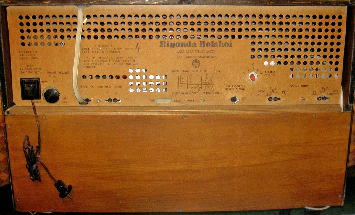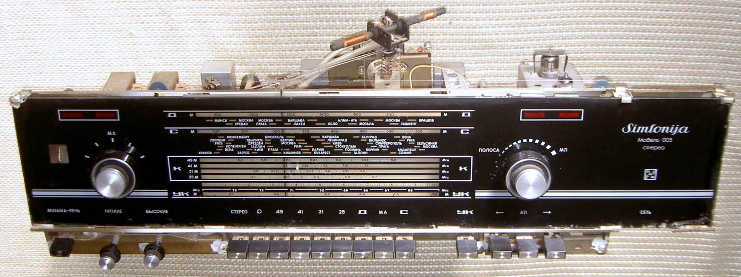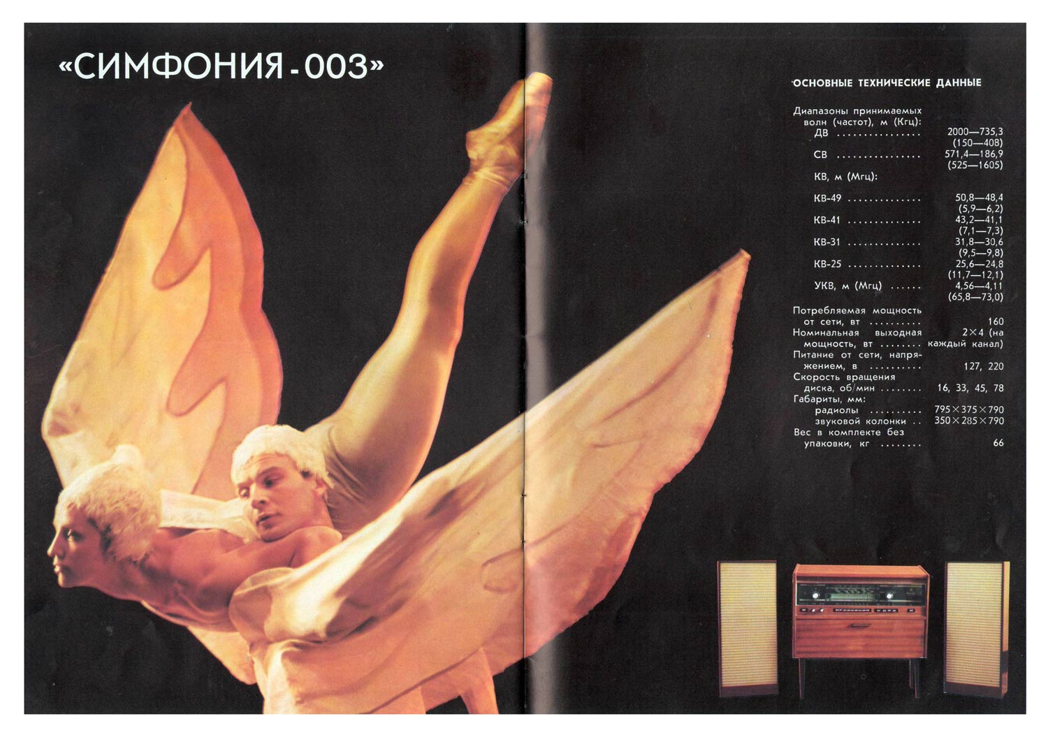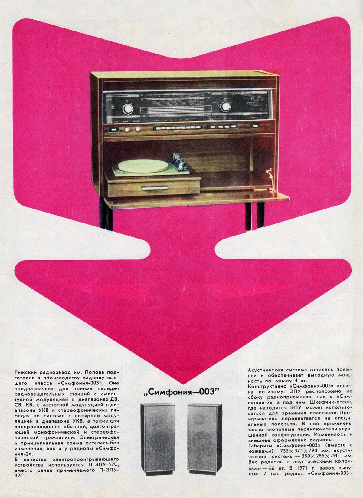 Радиола сетевая ламповая *Симфония-003* с 1971 года выпускалась Рижским заводом *Радиотехника*. Стереофоническая радиола высшего класса **Симфония 003** разработана на базе радиолы **Симфония-2**, но отличается от неё. Улучшена электрическая схема, применены новые материалы отделки, кнопочный переключатель диапазонов, применено более совершенное ЭПУ типа II-ЭПУ-52С с автостопом. Радиоприёмник имеет диапазоны ДВ, СВ, КВ 1, 2, 3, 4 и УКВ. Чувствительность в АМ диапазонах 30 мкВ, ЧМ 2,5 мкВ. Избирательность 60 дБ. Полоса воспроизводимых частот в диапазонах АМ - 40...7000 Гц, ЧМ и при воспроизведении грампластинок - 40...15000 Гц. Усилитель мощности выполнен на лампах типа 6П14П, включенных по ультралинейной схеме с автосмещением, имеет выходную мощность 2х4 Вт. АС трёхполосные, закрытого типа, в каждой установлены по три громкоговорителя 6ГД-2, 3ГД-1 и 1ГД-3. Размеры АС уменьшены по сравнению с применявшимися в радиоле **Симфония 2**. Благодаря высокой чувствительности головок АС развивает звуковое давление в 112 дБ на расстоянии 1 м, при подводимой мощности 4 Вт. Потребляемая мощность вместе с ЭПУ 130 Вт. Габариты радиолы 795х525х375 мм, масса 37 кг. Габариты одной АС 790х350х285 мм, вес 14,5 кг. В 1976 году была выпущена небольшая серия радиол *Симфония-003М* почти не отличающихся от базовой. Экспортная радиола выпускавшаяся с 1971 года именовалась **Rigonda-Bolshoi**, в ней были другие частоты УКВ диапазона и КВ поддиапазонов и все надписи были на английском.