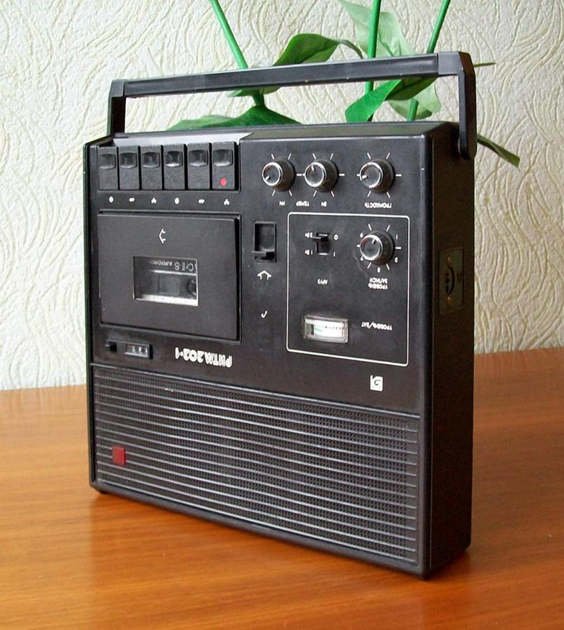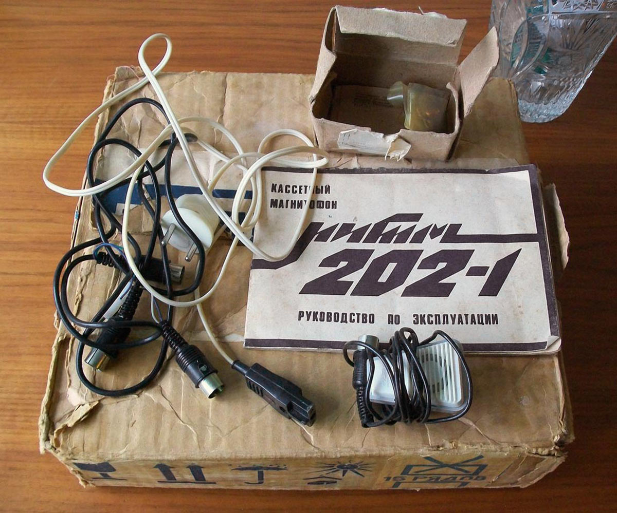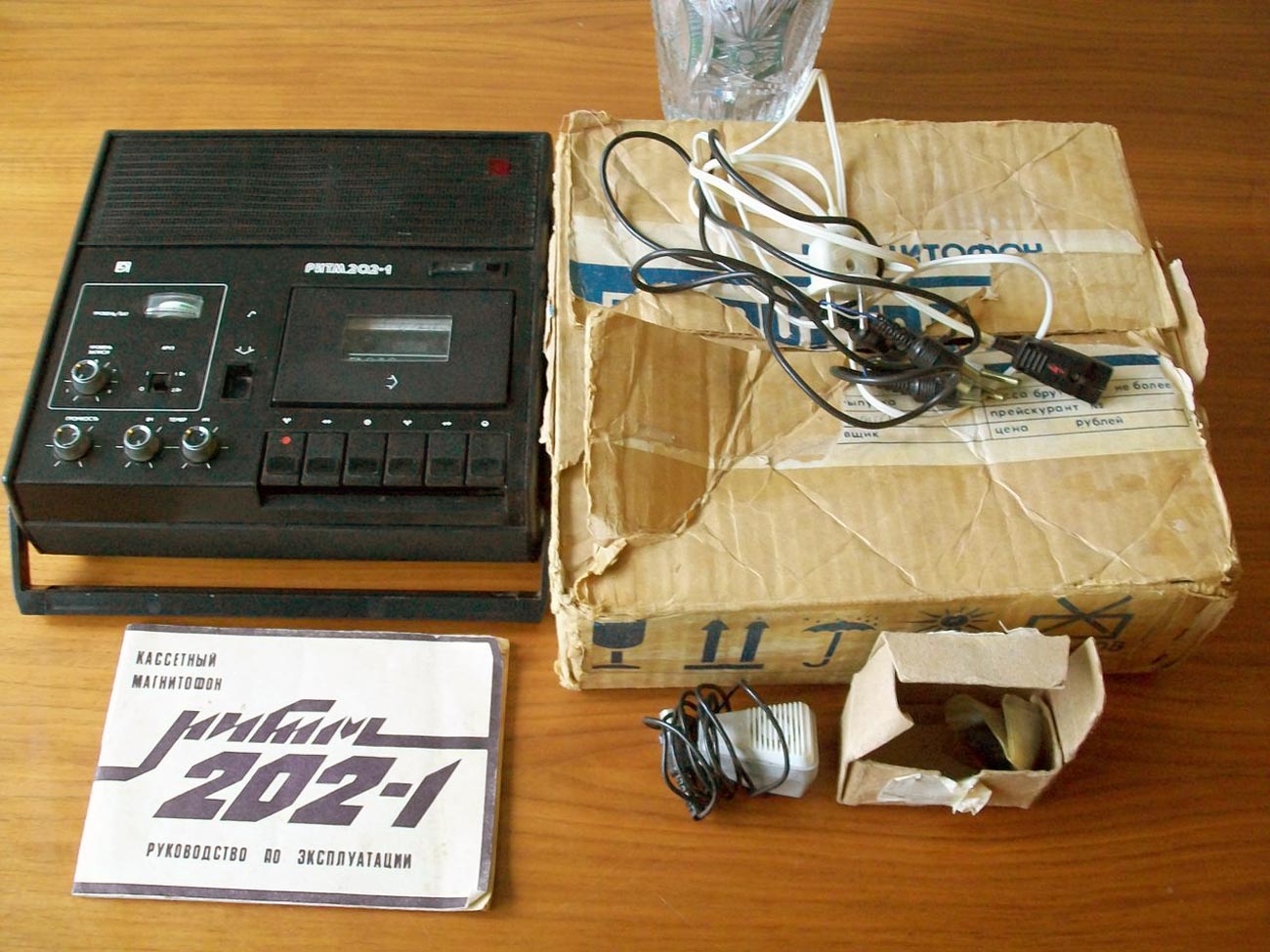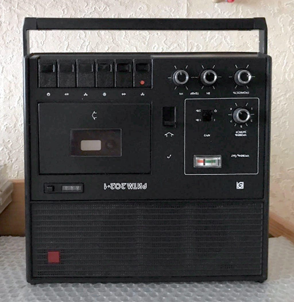 Портативный кассетный магнитофон *Ритм-202-1* с 1983 года выпускал Пермский электроприборный завод. Магнитофон предназначается для записи фонограмм от микрофона, проигрывателя, приёмника, телевизора, радиолинии на магнитную ленту в кассетах и их воспроизведение через громкоговоритель. В магнитофоне есть гнездо для внешней АС. Стабилизированный генератор подмагничивания и стирания, позволяет производить записи при напряжения питания от 6 до 10 В. Регулировка уровня записи осуществляется вручную и автоматически (АРУЗ). Расход ленты контролируется 3-х декадным счётчиком. Магнитофон позволяет осуществлять запись и воспроизведение и во время пешего движения. В магнитофоне автоматически выключается двигатель по окончании ленты. Магнитофон является модификацией модели **Ритм-202** и отличается от него лишь цветовым оформлением и наличием автостопа. Скорость движения магнитной ленты - 4,76 см/с. Коэффициент детонации - 0,3%. Рабочий диапазон частот на ЛВ - 63...12500 Гц. Относительный уровень шумов и помех в канале записи и воспроизведения -48 дБ, а с системой ШП -52 дБ. Коэффициент гармоник на ЛВ не более 4,5%. Номинальная выходная мощность 1, максимальная 2 Вт. Питание от батарей и сети. Потребляемая мощность 10 Вт. Габариты магнитофона - 290х282х81 мм. Масса 4,2 кг. С 1986 года магнитофон стал называться *Ритм М-202-1*. При общей электрической схеме и конструкции с прежней моделью, здесь заменён стрелочный индикатор на больший и более современный.