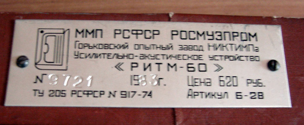 Эстрадный усилитель *Ритм-60* (усилительно-акустическое устройство) с 1973 года выпускал Горьковский опытный завод НИКТИМПа. Усилитель *Ритм-60* предназначен для использования в качестве эстрадного для ВИА. Усилитель выпускался в 2-х вариантах оформления. Он имеет 4-ре входа с регулировкой уровня сигнала и тембров по каждому из них, один вход для фонограммы, регулировку общего уровня сигнала. Номинальная выходная мощность усилителя 40 Вт, максимальная 90 Вт. Диапазон усиливаемых частот 16...18000 Гц. В комплекте идут две акустические системы по 30 Вт каждая. В одну АС входят по шесть громкоговорителей. АС воспроизводит полосу частот 40...16000 Гц.
