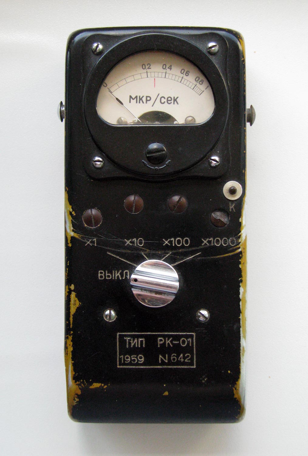 Карманный радиометр *РК-01* выпускался предположительно с 1959 года Московским заводом № 642. Подробнее о приборе в инструкции по эксплуатации.