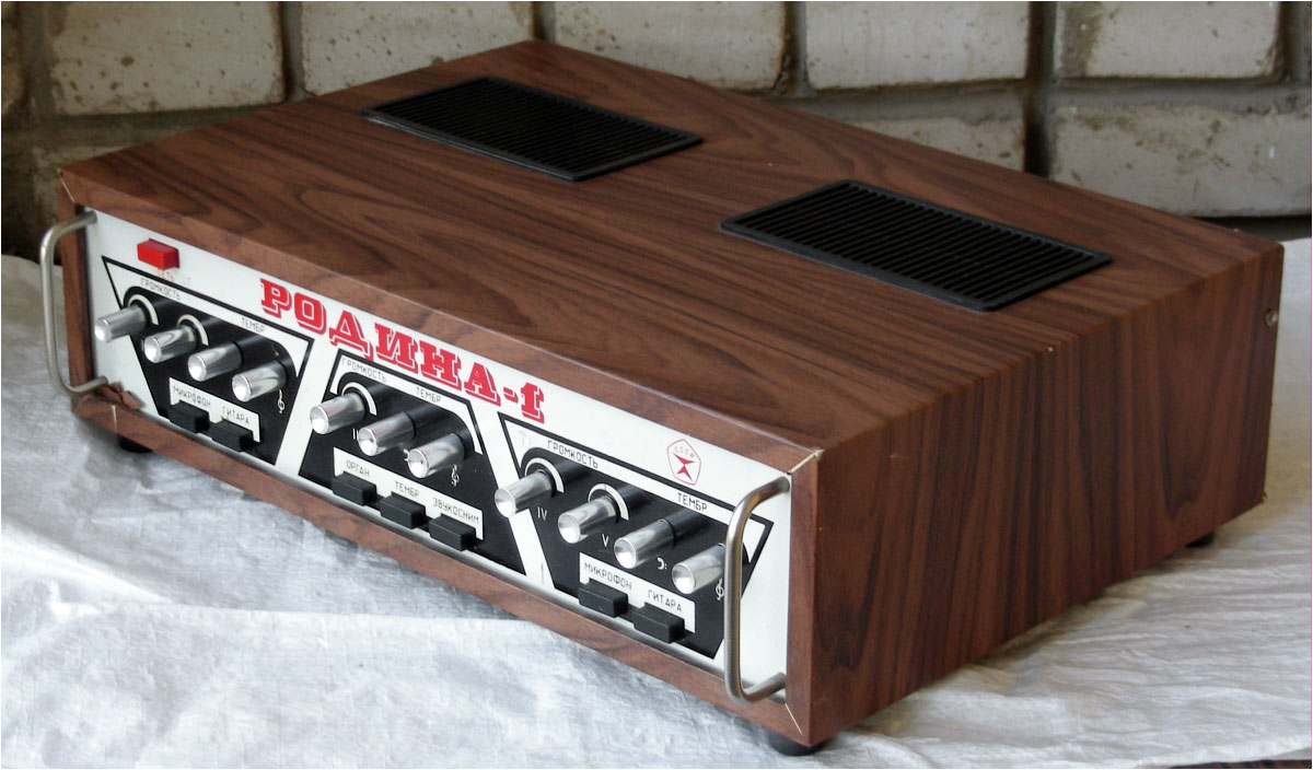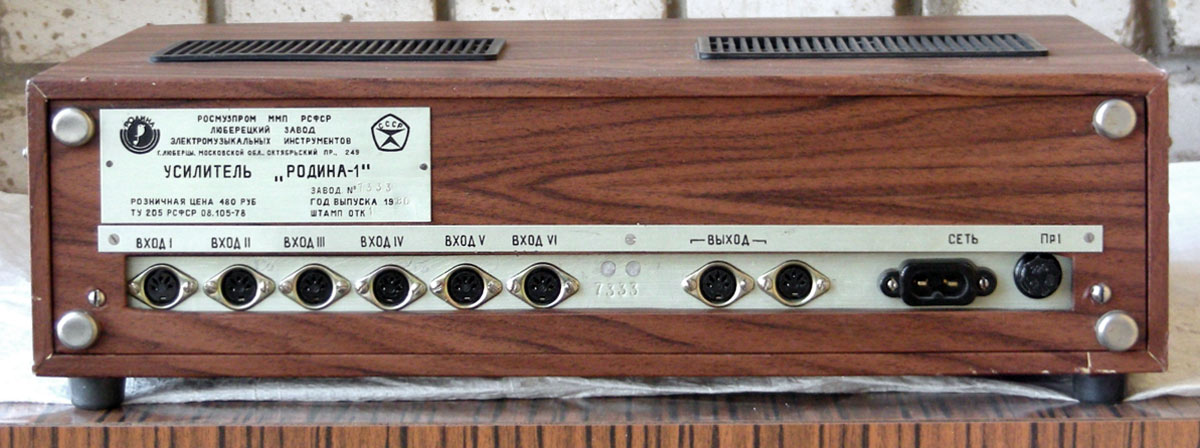 Усилитель низкой частоты *Родина-1* с акустической системой *Родина-1* с 1979 года выпускал Люберецкий завод электромузыкальных инструментов. Транзисторный усилитель низкой частоты **Родина-1** предназначен для усиления звуковых сигналов от электромузыкальных инструментов, микрофона и магнитофона в закрытых помещениях или на открытых площадках. Усилитель имеет 3 канала предварительного усиления и общий усилитель мощности. Диапазон воспроизводимых усилителем частот 25...25000 Гц. Диапазон частот воспроизводимых АС - 63...12500 Гц. Номинальная выходная мощность усилителя - 60 Вт. Номинальная входная мощность АС - 40 Вт. Габариты усилителя 140х330х450 мм. Габариты АС - 1000х500х300 мм. Масса усилителя 10 кг. Масса АС - 45 кг.