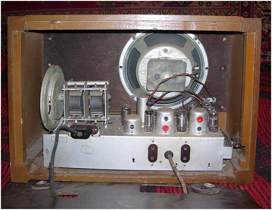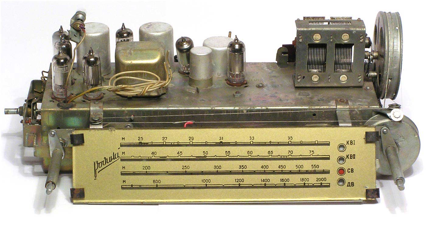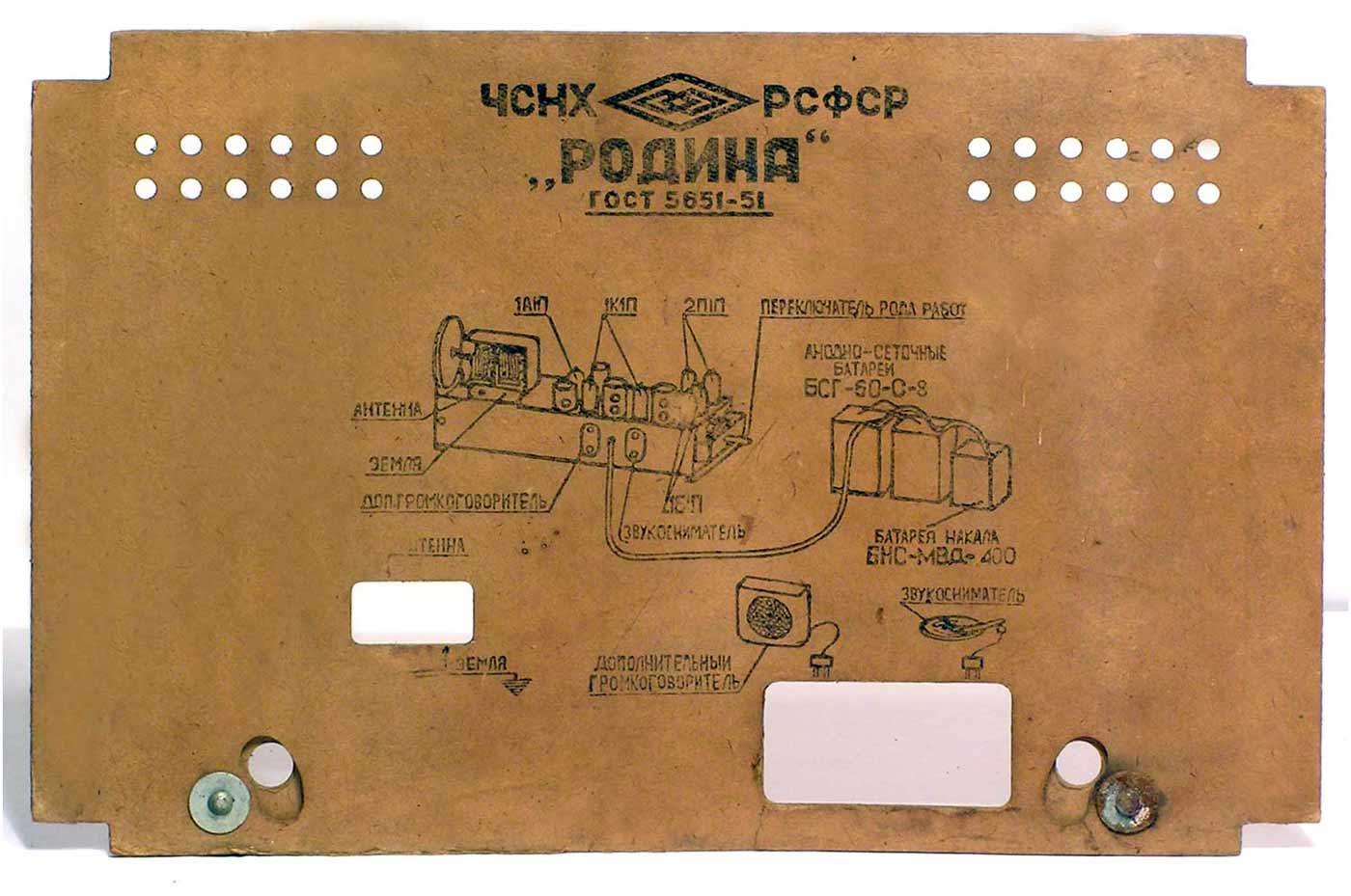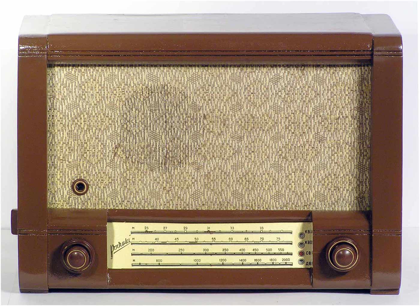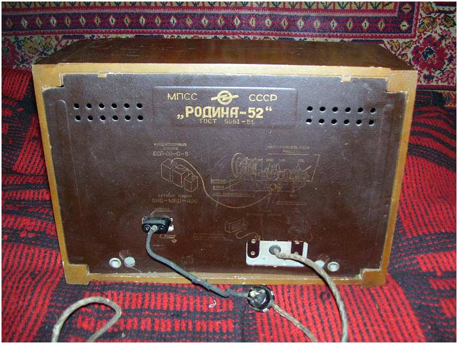 Радиоприёмник батарейный *Родина-52* с 1952 года выпускал Челябинский радиозавод и Воронежский завод *Электросигнал*. Приёмник разработан в 1951 году конструкторским бюро Воронежского завода **Электросигнал**. Приёмник заменил модель **Родина-47** и стал первым в СССР супергетеродинным приёмником 2-го класса на пальчиковых лампах. При высокой чувствительности и избирательности, он отличается экономичностью. Кроме того, в схеме имеется устройство, позволяющее уменьшать расход энергии, когда не требуется работа с большой громкостью. На передней панели, справа находится сдвоенная ручка: большая служит для переключения диапазонов, малая для настройки. Сдвоенная ручка слева выполняет несколько функций: большая - выключатель питания и регулятор тона, малая регулятор громкости. Регулятор тона имеет положения: **Выключено**, **Широкая** и **Узкая полоса**. В положении **Узкая полоса** срезаются высокие частоты. На левой боковой стенке находится переключатель рода работы на три положения: для работы в экономичном режиме **ММ** (Малая мощность), в нормальном режиме **БМ** (Большая мощность) и для работы от звукоснимателя **ЗС**. Сзади находятся гнёзда антенны и заземления, звукоснимателя и добавочного громкоговорителя. С помощью этого же разьёма приёмник может быть включен в трансляционную сеть. Для подключения батарей приёмник снабжен шнуром с колодками. Кроме того в комплекте имеется переходная колодка, которая позволяет использовать обычные батареи накала и анода. Радиоприёмники **Родина-52** начиная с 1954 года работали на батареях от приёмников **Искра-53**. Приёмник имеет 4 диапазона: ДВ 200...723 м, СВ 577...167 м, КВ1 76...36 м и КВ2 36...24,8 м.Чувствительность на ДВ, СВ 200 мкВ, КВ 300 мкВ. Избирательность по соседнему каналу 26 дБ. Избирательность по зеркальному каналу на ДВ 36 дБ, СВ 30 дБ, КВ 12 дБ. Диапазон воспроизводимых звуковых частот 100...4000 Гц. ПЧ 465 КГц. Индикатором включения служит неоновая лампа, расположенная слева над регулятором громкости. Расход тока по накалу 520 мА в обычном и 400 мА в экономичном режиме. Потребляемый ток в режиме **ММ** при выходной мощности 100 мВт - 8,5 мА, в режиме **БМ** при мощности 300 мВт - 12 мА. При работе звукоснимателя выключается накал ламп приёмной части, а выходной каскад работает в режиме **БМ**. В приёмнике установлен громкоговоритель 3ГД-3 (позднее 0,5ГД-5) с постоянным магнитом. Габариты приёмника 450х310х225 мм. Вес 12,5 кг. Радиоприёмник **Родина-52** выпускался до середины 1960 года, претерпев за это время несколько модернизаций схемы и внешнего вида.