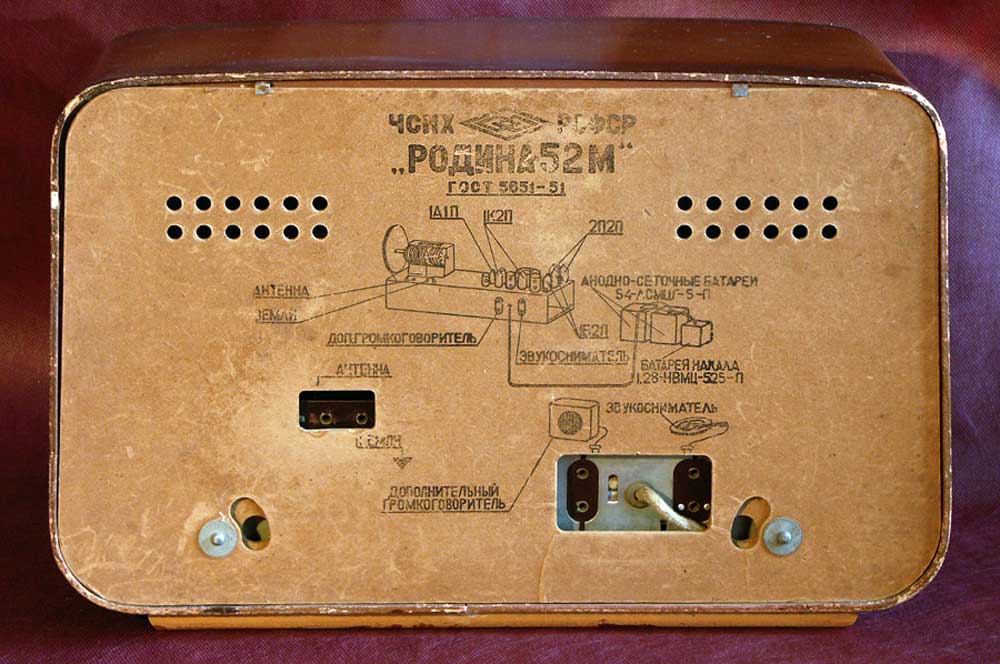 Радиоприёмник батарейный *Родина-52М* с 1953 года выпускал Челябинский радиозавод. В 1953 году наряду с выпуском радиоприёмника **Родина-52** было налажено производство модернизированной модели **Родина-52М**. Радиоприёмник получил другое внешнее оформления, небольшие изменения были и в электрической схеме. Во всём остальном по параметрам, конструкции и построении электрической схемы модель аналогична приёмнику *Родина-52*. В новом радиоприёмнике применены лампы 1А1П, 1К1П, 1Б1П (2), 2П1П (2). Диапазоны волн: ДВ 150...415 кГц, СВ 520...1600 кГц, КВ1 3,95...8,33 мГц, КВ2 8,33...12,1 мГц. ПЧ 465 кГц. Чувствительность в диапазонах ДВ, СВ 200 мкВ, КВ 300 мкВ. Селективность по соседнему каналу 26 дБ, зеркальному в ДВ, СВ 30 дБ, КВ 10 дБ. Диапазон воспроизводимых частот звука 150...4000 Гц. Номинальная выходная мощность 150 мВт. Габариты радиоприёмника 460х300х250 мм. Его вес 12 кг. Аналогичный по схеме и конструкции радиоприёмник, но с наименованием *Родина-53М* выпускал с осени 1953 года и Владивостокский завод *Радиоприбор*.