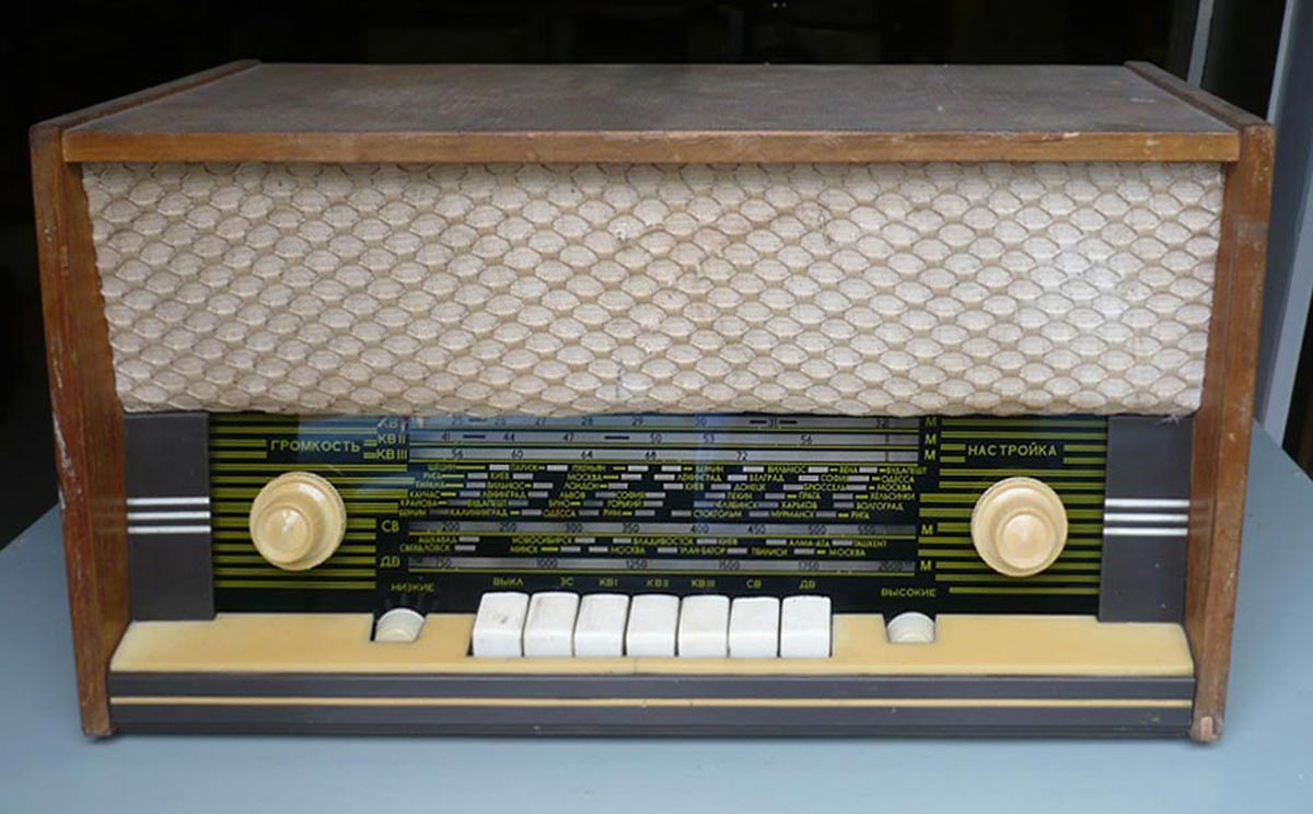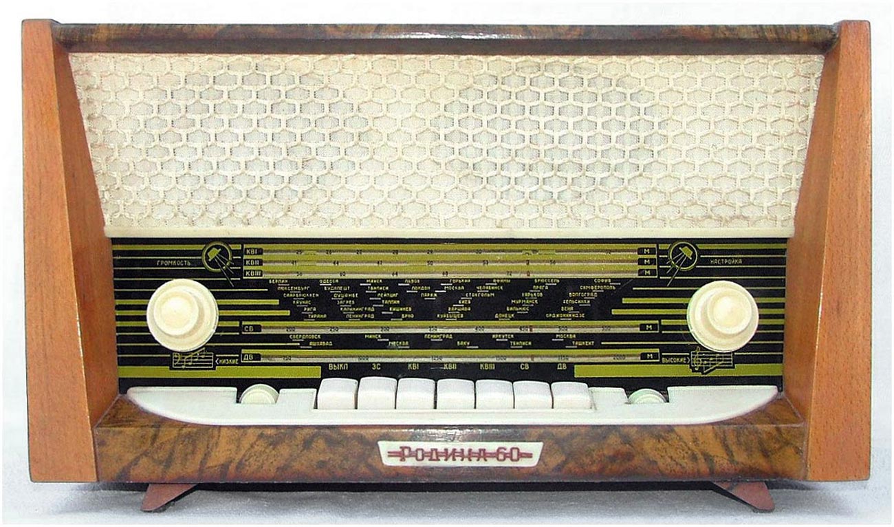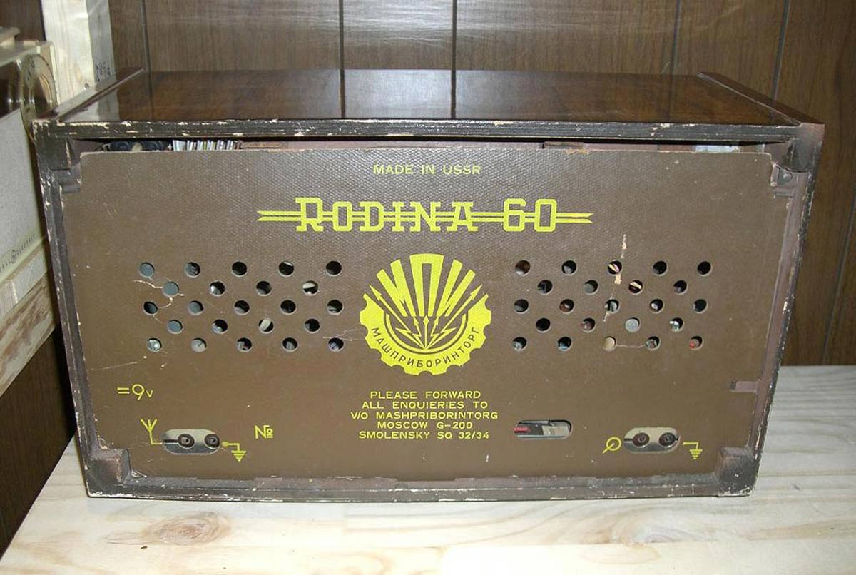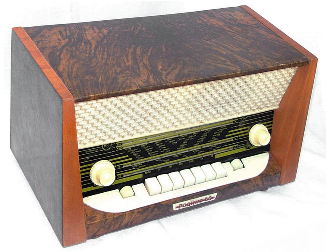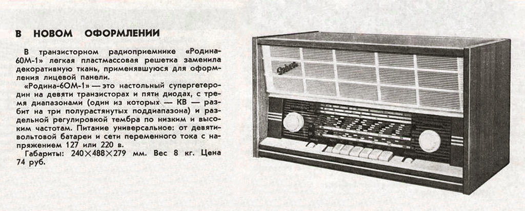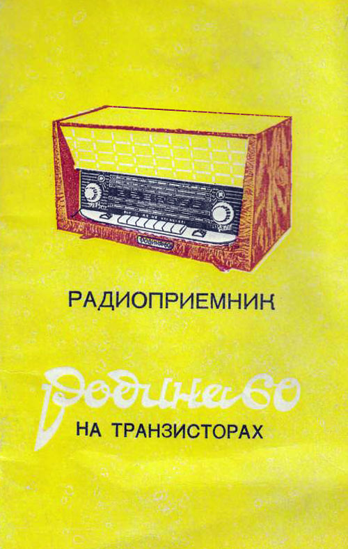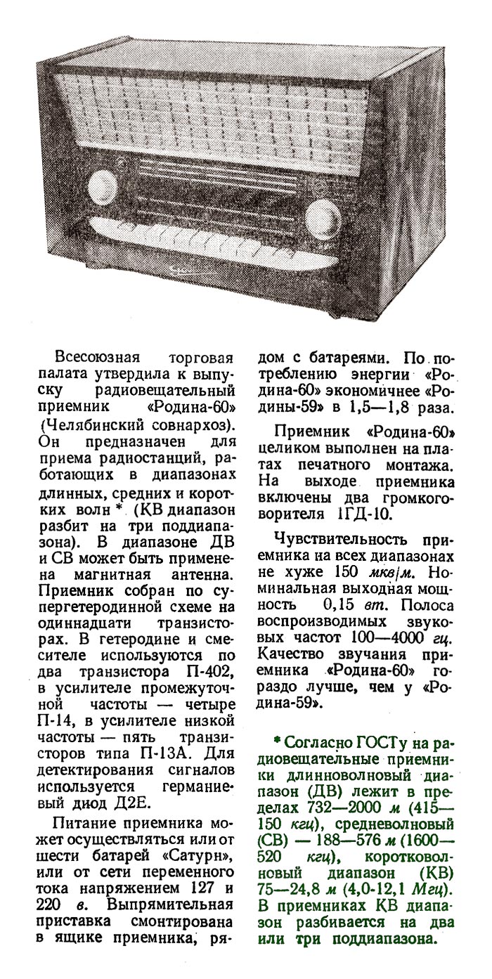 Стационарный транзисторный радиоприёмник *Родина-60* с 1960 года выпускал Челябинский радиозавод. Радиоприемник **Родина-60** - это настольный супергетеродин, собранный на 10 транзисторах. Предназначен для приёма радиостанций в диапазонах ДВ, СВ и КВ на наружную антенну. Диапазоны ДВ, СВ стандартные. КВ имеет 3 поддиапазона; KB1 12,1...9,4, KB2 7,5...5,2, KB3 5,4...3,95 МГц. Чувствительность в ДВ, СВ и КВ диапазонах 60, 40 и 30 мкВ. Избирательность по соседнему каналу 36 дБ. Ослабление зеркального канала 36, 30 и 14 дБ. ПЧ 465 кГц. Действие АРУ: при изменении сигнала на входе на 40 дБ, изменение сигнала на выходе около 6 дБ. Полоса воспроизводимых звуковых частот: при приёме радио 100...4000 Гц, при воспроизведении грамзаписи через внешний электропроигрыватель 100...7000 Гц. Номинальная выходная мощность при КНИ 6% - 150 мВт. Источник питания: 6 элементов типа 373 Марс или сеть 50 гц 127 или 220 В, через выносной блок питания. Ток, потребляемый приёмником при отсутствии сигнала 12 мА. Мощность, потребляемая от сети 1,2 Вт. Работоспособность модели сохраняется при напряжении батареи до 5 В. Длительность работы приёмника от одного комплекта элементов 150 часов. Чувствительность усилителя НЧ с гнезд звукоснимателя при номинальной мощности 200 мВ. Габаритные размеры приёмника 488х240х280 мм. Масса РП 8 кг.