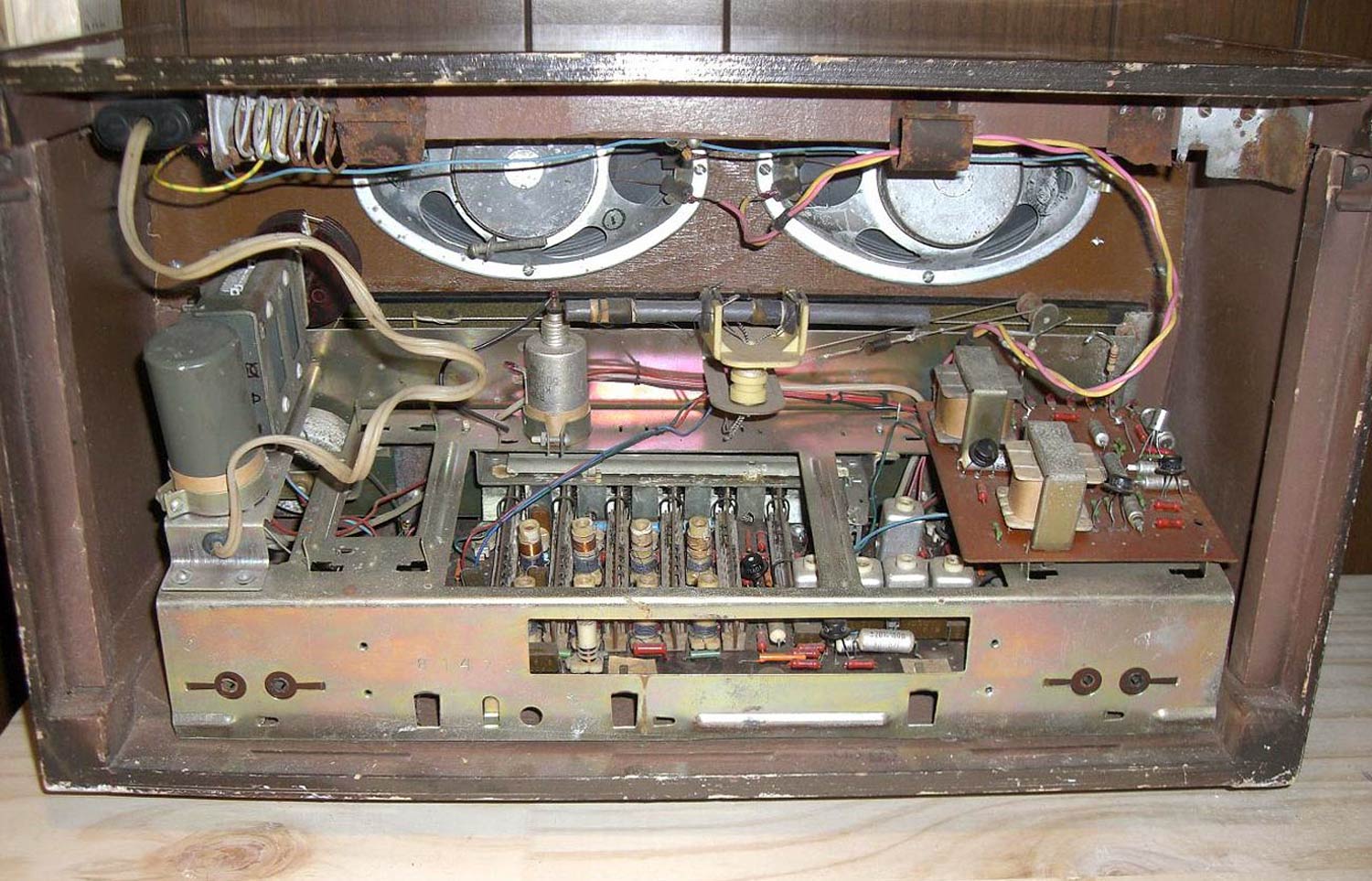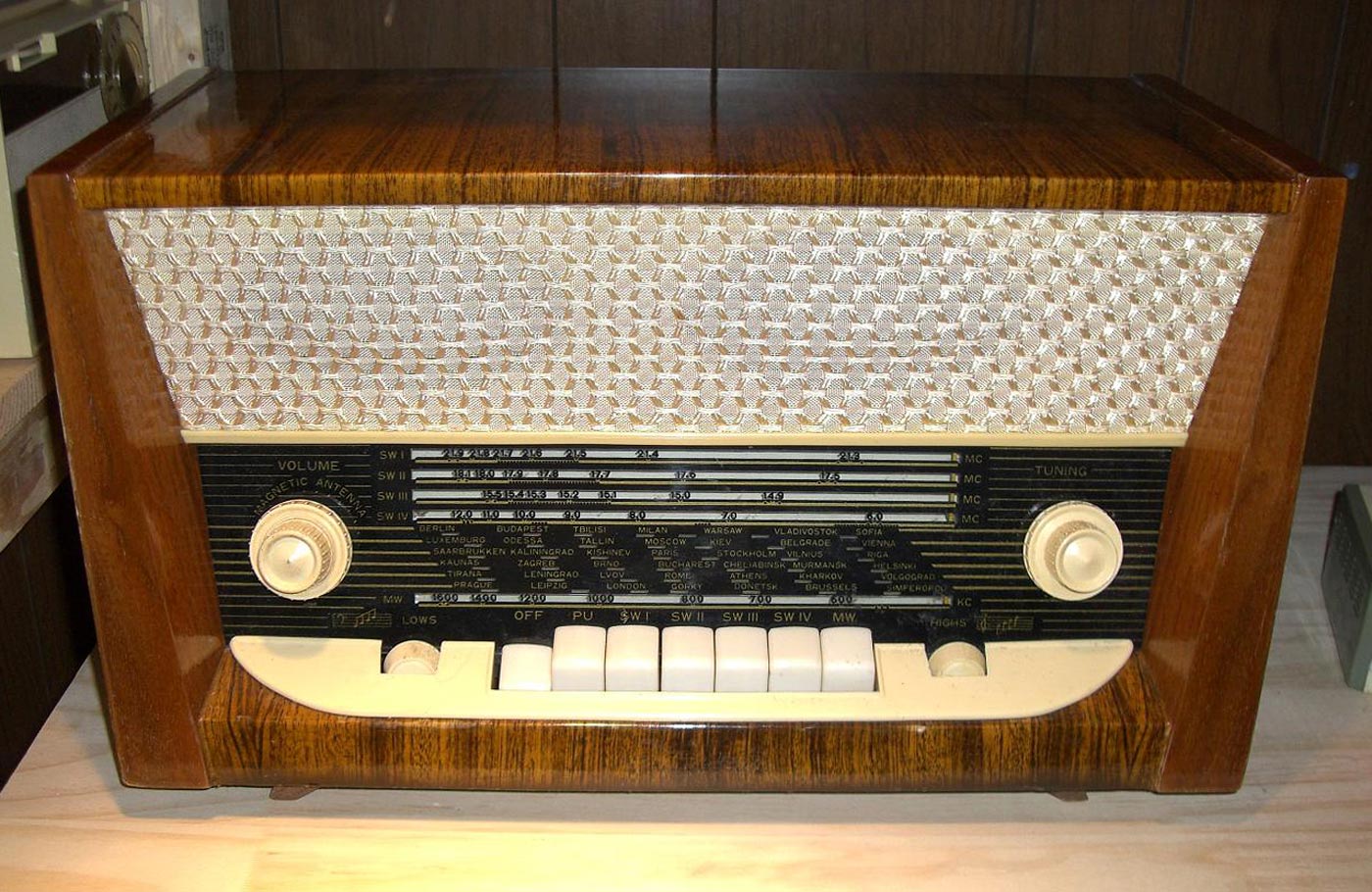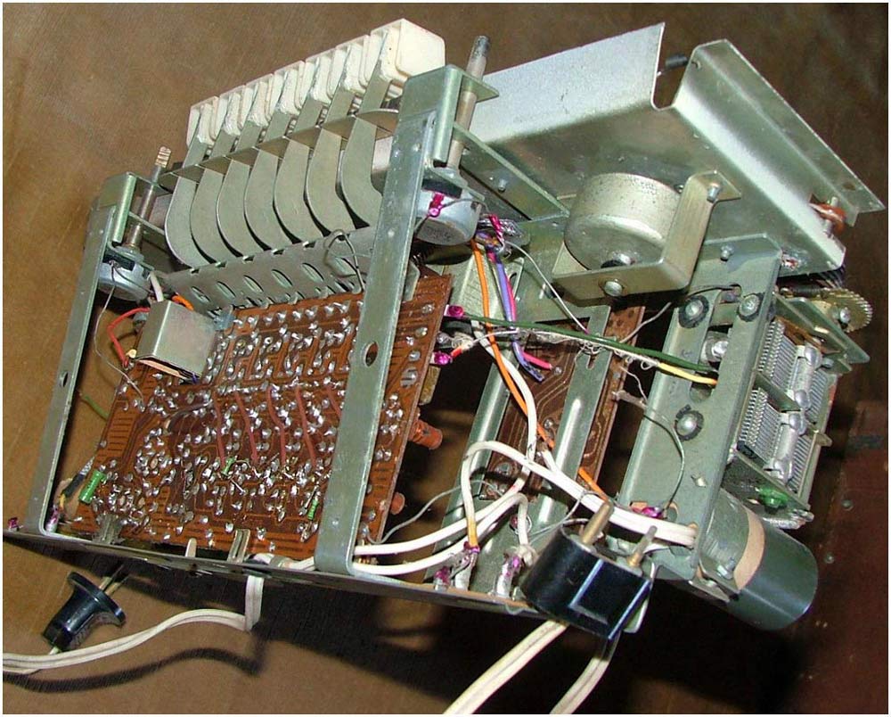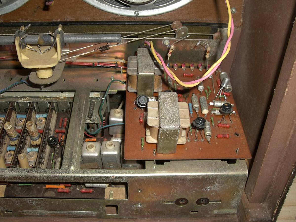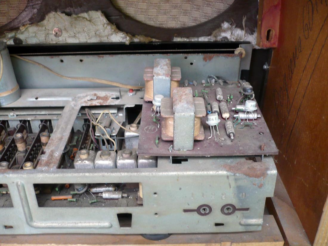 Стационарный транзисторный радиоприёмник *Родина-60* с 1960 года выпускал Челябинский радиозавод. Радиоприемник **Родина-60** - это настольный супергетеродин, собранный на 10 транзисторах. Предназначен для приёма радиостанций в диапазонах ДВ, СВ и КВ на наружную антенну. Диапазоны ДВ, СВ стандартные. КВ имеет 3 поддиапазона; KB1 12,1...9,4, KB2 7,5...5,2, KB3 5,4...3,95 МГц. Чувствительность в ДВ, СВ и КВ диапазонах 60, 40 и 30 мкВ. Избирательность по соседнему каналу 36 дБ. Ослабление зеркального канала 36, 30 и 14 дБ. ПЧ 465 кГц. Действие АРУ: при изменении сигнала на входе на 40 дБ, изменение сигнала на выходе около 6 дБ. Полоса воспроизводимых звуковых частот: при приёме радио 100...4000 Гц, при воспроизведении грамзаписи через внешний электропроигрыватель 100...7000 Гц. Номинальная выходная мощность при КНИ 6% - 150 мВт. Источник питания: 6 элементов типа 373 Марс или сеть 50 гц 127 или 220 В, через выносной блок питания. Ток, потребляемый приёмником при отсутствии сигнала 12 мА. Мощность, потребляемая от сети 1,2 Вт. Работоспособность модели сохраняется при напряжении батареи до 5 В. Длительность работы приёмника от одного комплекта элементов 150 часов. Чувствительность усилителя НЧ с гнезд звукоснимателя при номинальной мощности 200 мВ. Габаритные размеры приёмника 488х240х280 мм. Масса РП 8 кг.