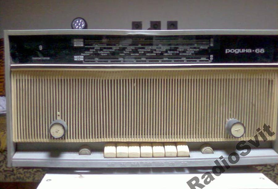 Стационарный транзисторный радиоприёмник *Родина-68* с 1969 года выпускал Челябинский радиозавод. Радиоприёмник создан на базе модели **Эфир-67** (без ЭПУ) и представляет собой настольный супергетеродин 2-го класса, собранный на 9 транзисторах и 4-х диодах. Радиоприёмник предназначен для приёма передач радиовещательных станций с амплитудной модуляцией в диапазонах ДВ, СВ и КВ на наружную антенну. Диапазон КВ волн разделен на три поддиапазона. Чувствительность в диапазонах ДВ, СВ - 60 мкВ, в поддиапазонах КВ - 25 мкВ. Чувствительность в режиме **Местный приём** - 900 мкВ. Селективность - 40 дБ. Номинальная выходная мощность 500 мВт. Диапазон воспроизводимых частот 100...6000 Гц. Питание от 6-ти батарей А-373 или от сети. Габариты модели 502х252х230 мм. Вес 8 кг.