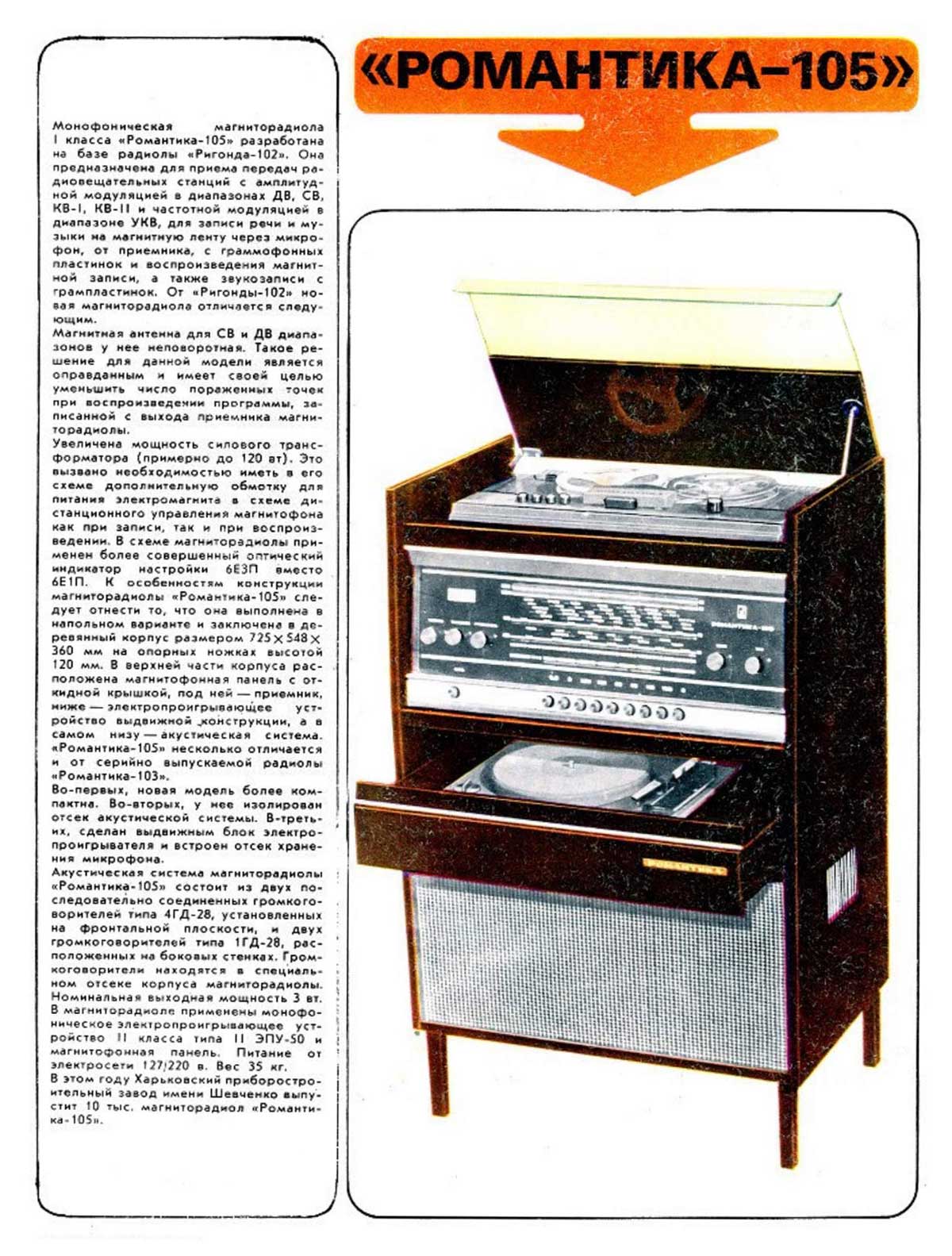 Консольная магниторадиола *Романтика-105* с 1972 года выпускалась Харьковским ПСЗ имени Шевченко. Магниторадиола создана на базе серийной радиолы **Ригонда-102**. Радиоприёмник работает в диапазонах ДВ, СВ, KB-1, КВ-2 и УКВ-ЧМ. В модели применена МП от магниторадиолы **Романтика-103**. ЭПУ типа II-ЭПУ-50 позволяет воспроизводить запись с обычных и долгоиграющих пластинок всех форматов. В отличие от **Ригонды-102**, **Романтика-105** имеет более мощный силовой трансформатор и индикатор на лампе 6Е3П. АС имеет по два громкоговорителя 4ГД-28 и 1ГД-28. Размеры модели 725х548х360 мм. Вес 35 кг.