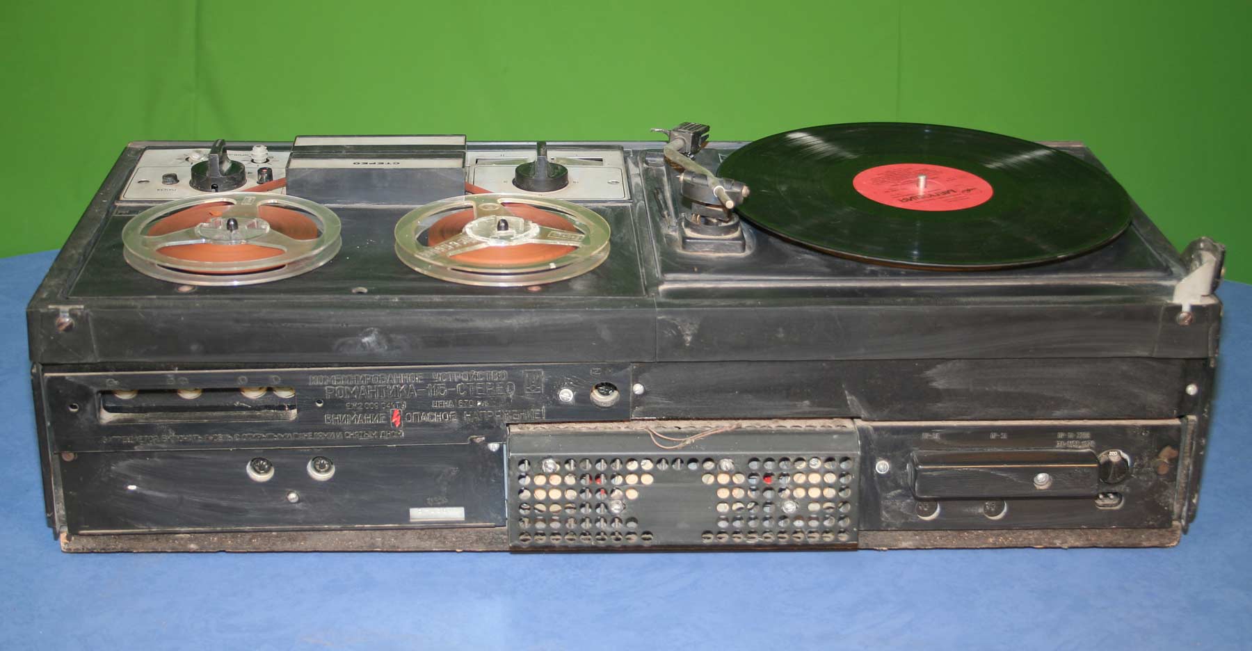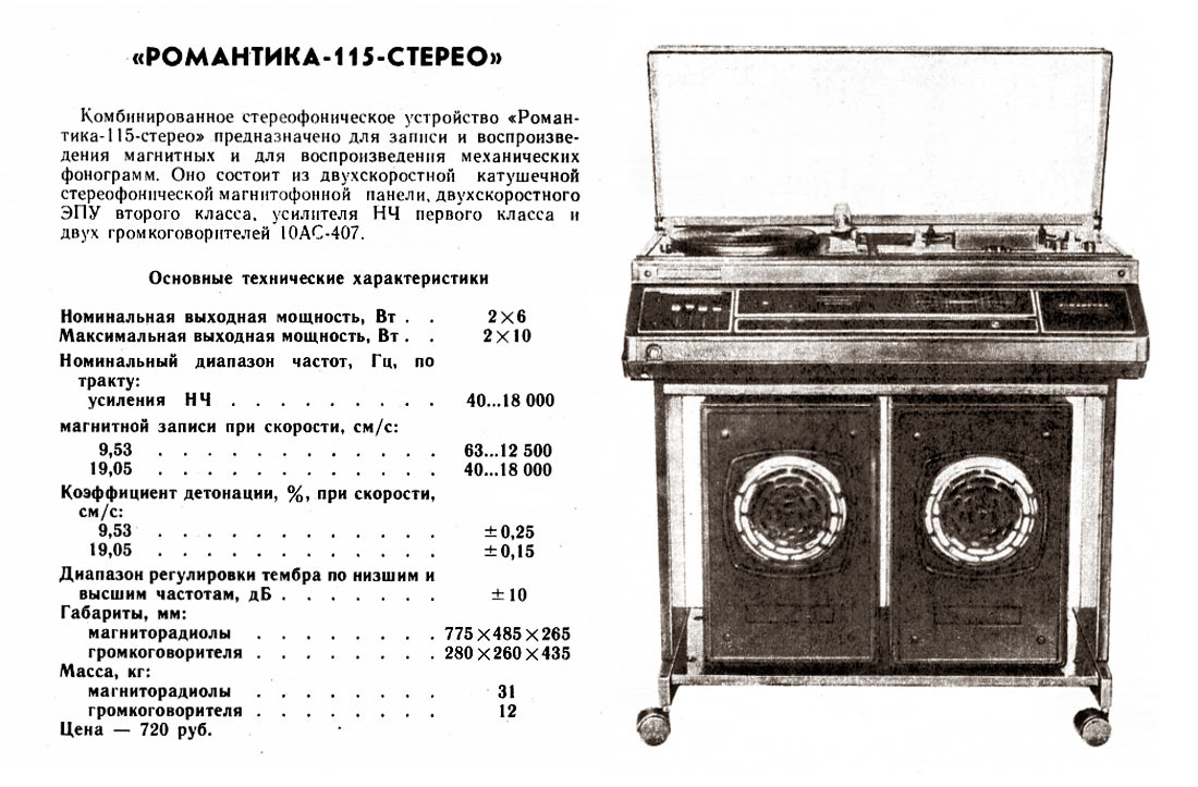 Комбинированное стереофоническое устройство *Романтика-115-стерео* с 1981 года выпускал Харьковский ПСЗ имени Шевченко. КУ предназначено для записи и воспроизведения магнитных фонограмм на скоростях 9,53 и 19,05 см/сек, а также для прослушивания грампластинок всех стандартных форматов. Комбинированное устройство состоит из двухскоростной катушечной стереофонической магнитофонной панели второго класса, двухскоростного ЭПУ 2-го класса, усилителя низкой частоты первого класса и двух широкополосных АС 10АС-407. Номинальная выходная мощность 2х6 Вт, максимальная 2х10 Вт. Диапазон частот звука по тракту усиления - 40...18000 Гц, магнитной записи при скорости 9,53 см/с - 63...12500 Гц, 19,05 см/с - 40...18000 Гц. Коэффициент детонации на скорости 9,53 см/с ±0,25%, 19,05 см/с ±0,15%. Диапазон регулировки тембра ±10 дБ. Габариты магниторадиолы 775х485х265 мм. Одной АС 280х260х435 мм. Масса магниторадиолы 31 кг. Масса одной АС - 12 кг. Общая цена комплекта - 670 рублей. Цена КУ со столиком на колёсиках 720 рублей.
