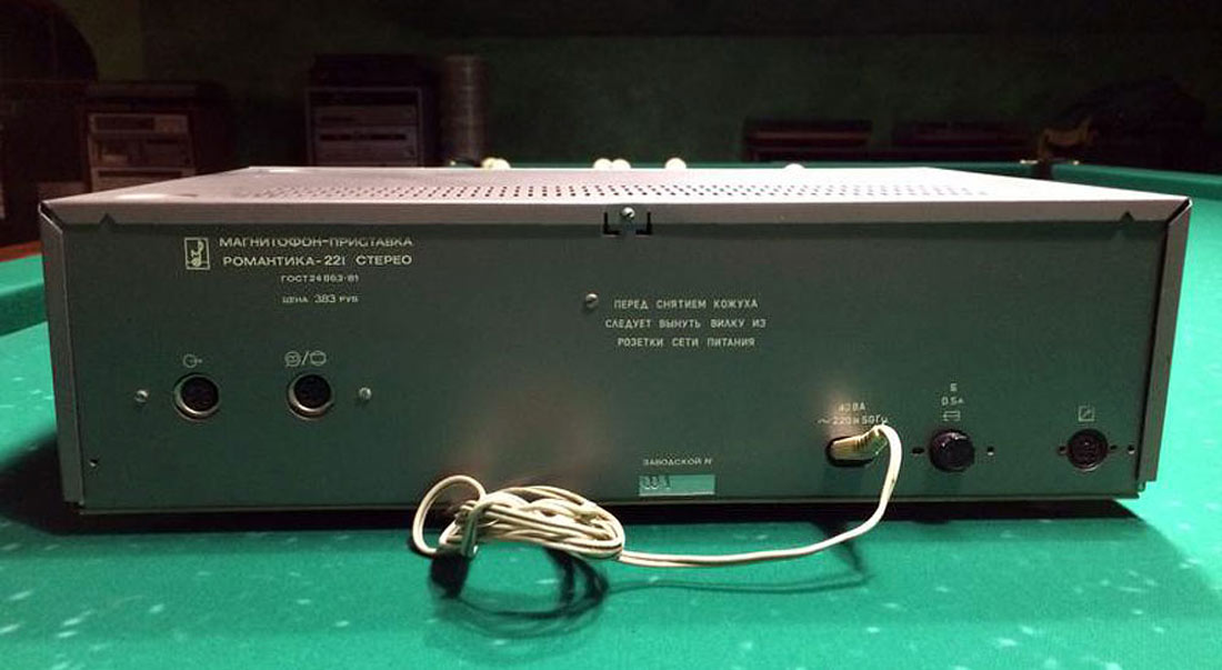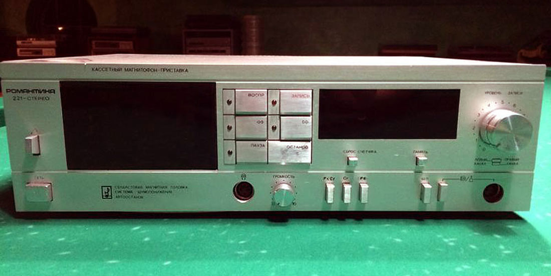 Магнитофон-приставку *Романтика-221-стерео* в 1987 году подготовил к выпуску Харьковский приборостроительный завод имени Шевченко. МП создан на базе модели *Романтика-220-стерео*. МП планировалось выпускать в двух вариантах оформления, были изготовлены опытые образцы, но дальше не пошло. МП предназначен для записи и воспроизведения фонограмм через телефоны или УКУ. Есть возможность работы с 3-мя типами ленты. Имеются: 3-х моторный ЛПМ, сендостовая головка, cветовая индикация режимов работы, устройство ШП, автостоп с отключением ЛПМ, электронный счётчик расхода ленты с режимом память. Кроме ручной, есть и система АРУЗ, переключатель типа лент, беспроводное ПДУ. Управление ЛПМ квазисенсорное. Рабочий диапазон частот на ленте А-4212-ЗБ - 31,5...18000 Гц. Коэффициент детонации ЛПМ ±0,1. Габариты МП 462х380х162 мм. Масса 6,3 кг.