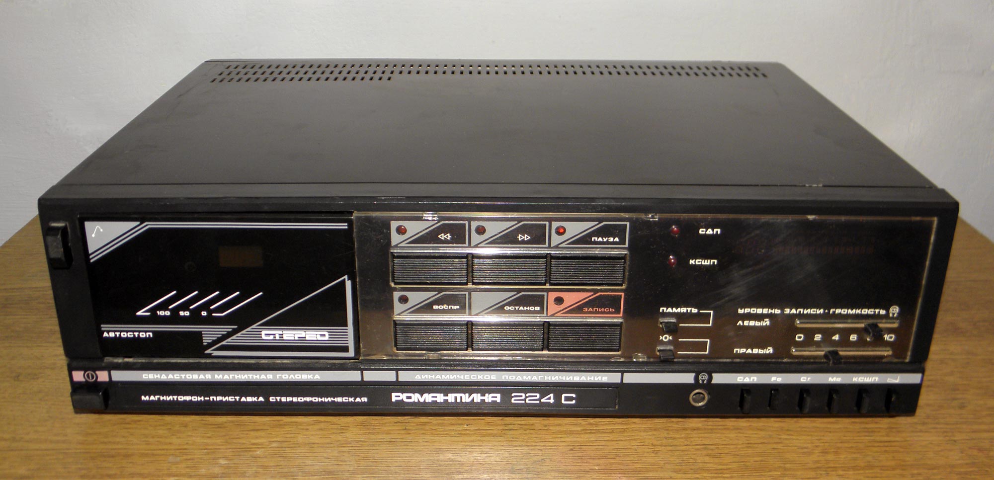 Кассетный магнитофон-приставка *Романтика МП-224С* с начала 1988 года подготовил к выпуску Харьковский завод Шевченко. Предназначена для записи звуковых фонограмм на магнтную ленту в кассетах МК, с последующим воспроизведением. В МП предусмотрены: Псевдосенсорное управление режимами работ ЛПМ. Возможность работы с 3 типами магнитной ленты. Сендастовая магнитная головка. Электронный индикатор записи и воспроизведения. Светодиодные индикаторы режимов работы. Электронный автостоп по окончании ленты. Система шумопонижения. Прослушивание фонограмм через стереотелефоны. Основные характеристики: Диапазон частот 40...14000 Гц. Коэффициент детонации - 0,2%. Относительный уровень шумов и помех с СШП -62 дБ. Потребляемая мощность 40 Вт. Габариты МП 430х160х380 мм. Масса 9 кг. Этот вариант МП не был поставлен на конвейер, а вместо него с таким же наименованием с 1989 года завод выпускал улучшенную МП. Информация о ней в инструкции.