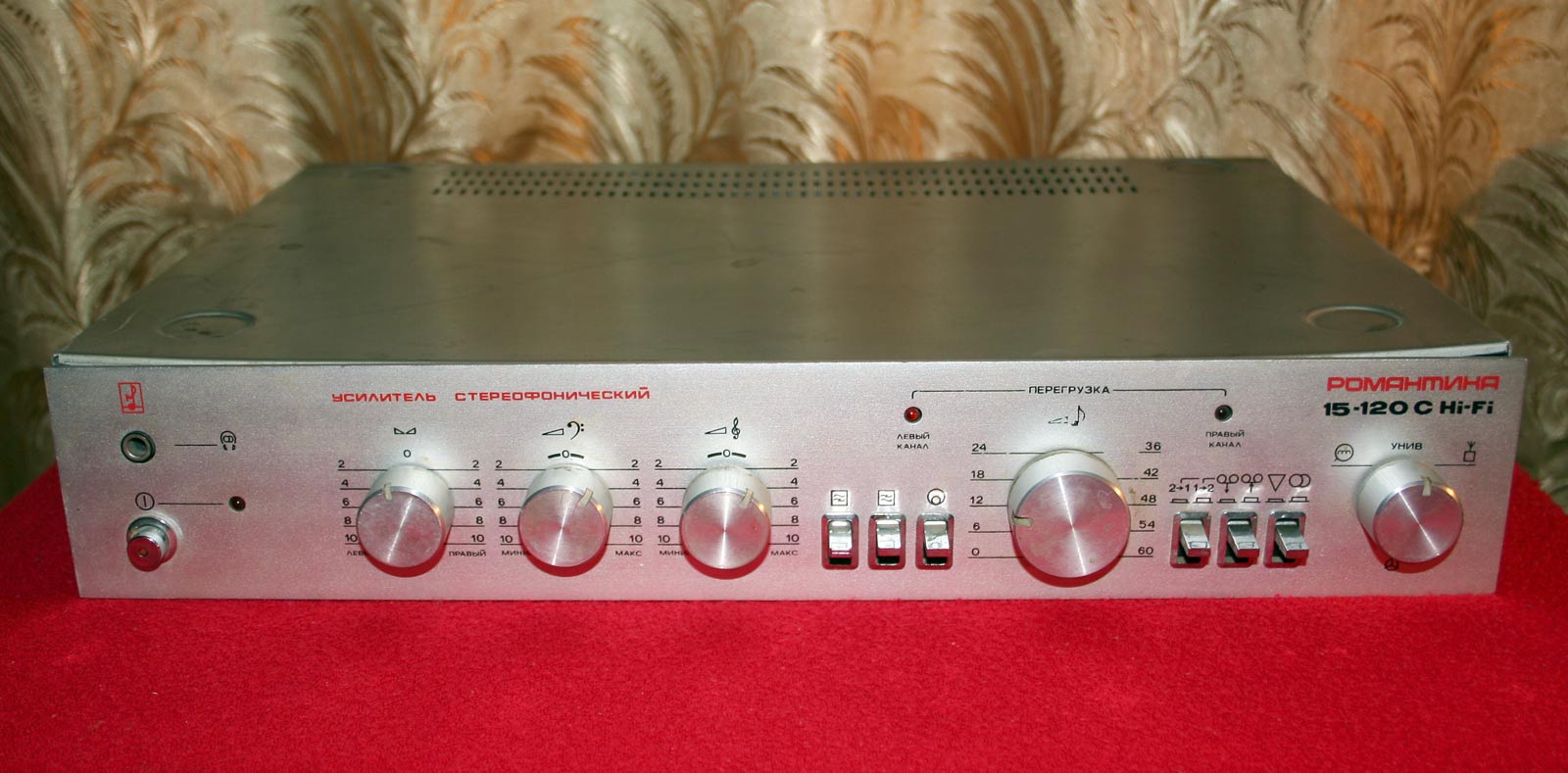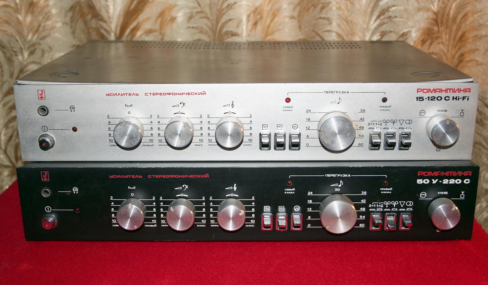 Усилители *Романтика 15У-120С* и *Романтика 50У-220С* с 1985 и 1988 года выпускал Харьковский ПСЗ имени Шевченко. По ГОСТ 24388-83 это усилитель **Романтика 15У-120С**, а по ГОСТ 24388-88 **Романтика 50У-220С**. Модель представляет собой полный стереофонический усилитель 2-й группы сложности. Усилитель предназначен для усиления монофонических или стереофонических фонограмм от различных источников сигнала и воспроизведения их с помощью АС *50АС-105* или аналогичных, с номинальным сопротивлением 4 Ома. Технические характеристики: номинальная выходная мощность, при номинальном сопротивлении в 4 Ом а - 2х15 Вт; максимальная долговременная мощность - 2х50 Вт; кратковременная мощность - 2х115 Вт; диапазон рабочих частот 40...16000 Гц; отклонения АЧХ в диапазоне воспроизводимых частот 1,5...2%; общие гармонические искажения в диапазоне частот не более 0,5%. Питание усилптеля осуществляется от сети 220 В. Габариты любого из усилителей 460х90х350 мм. Масса 7 кг. Первые выпуски усилителя именовались как *Романтика У-120С*.