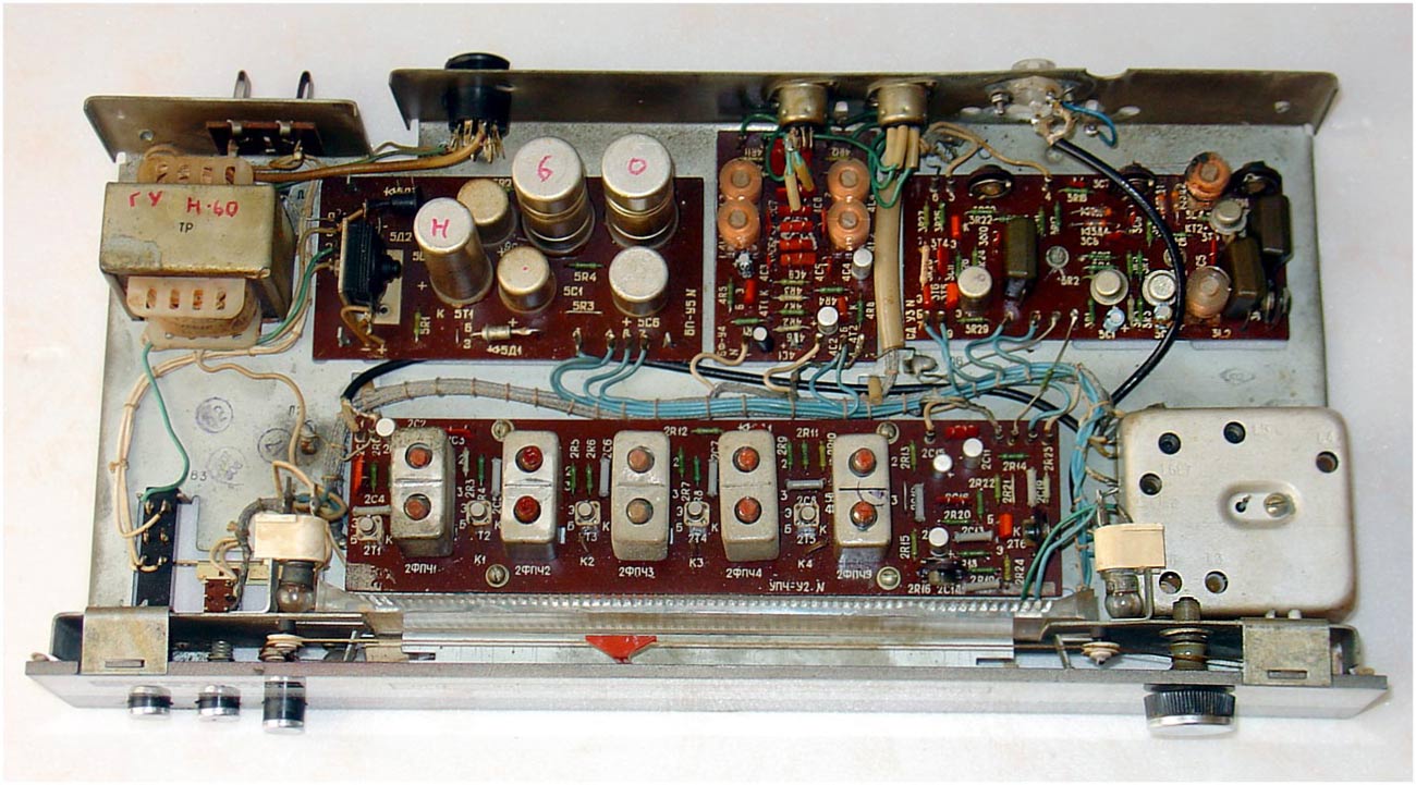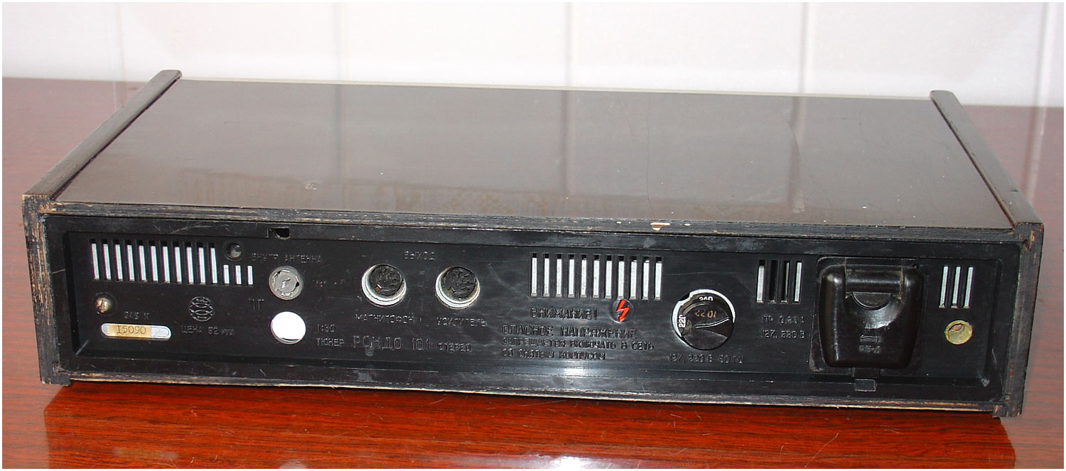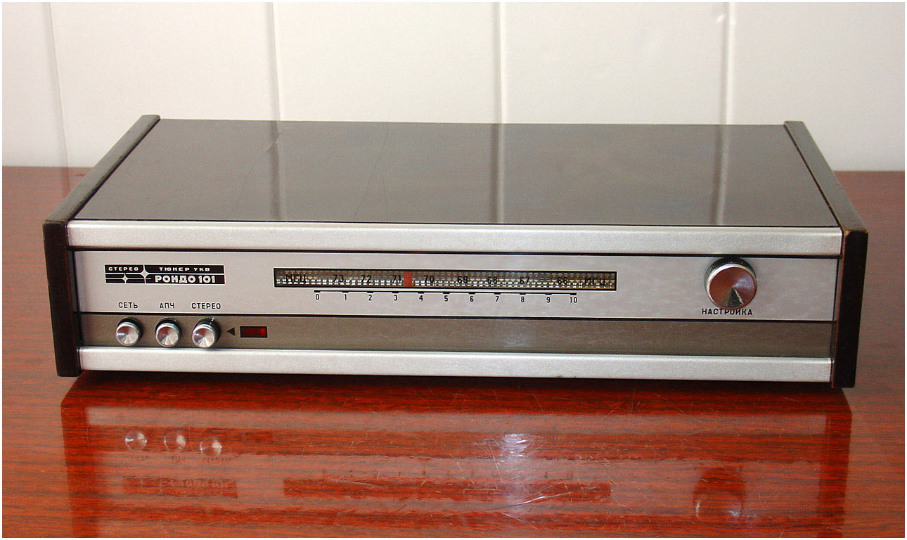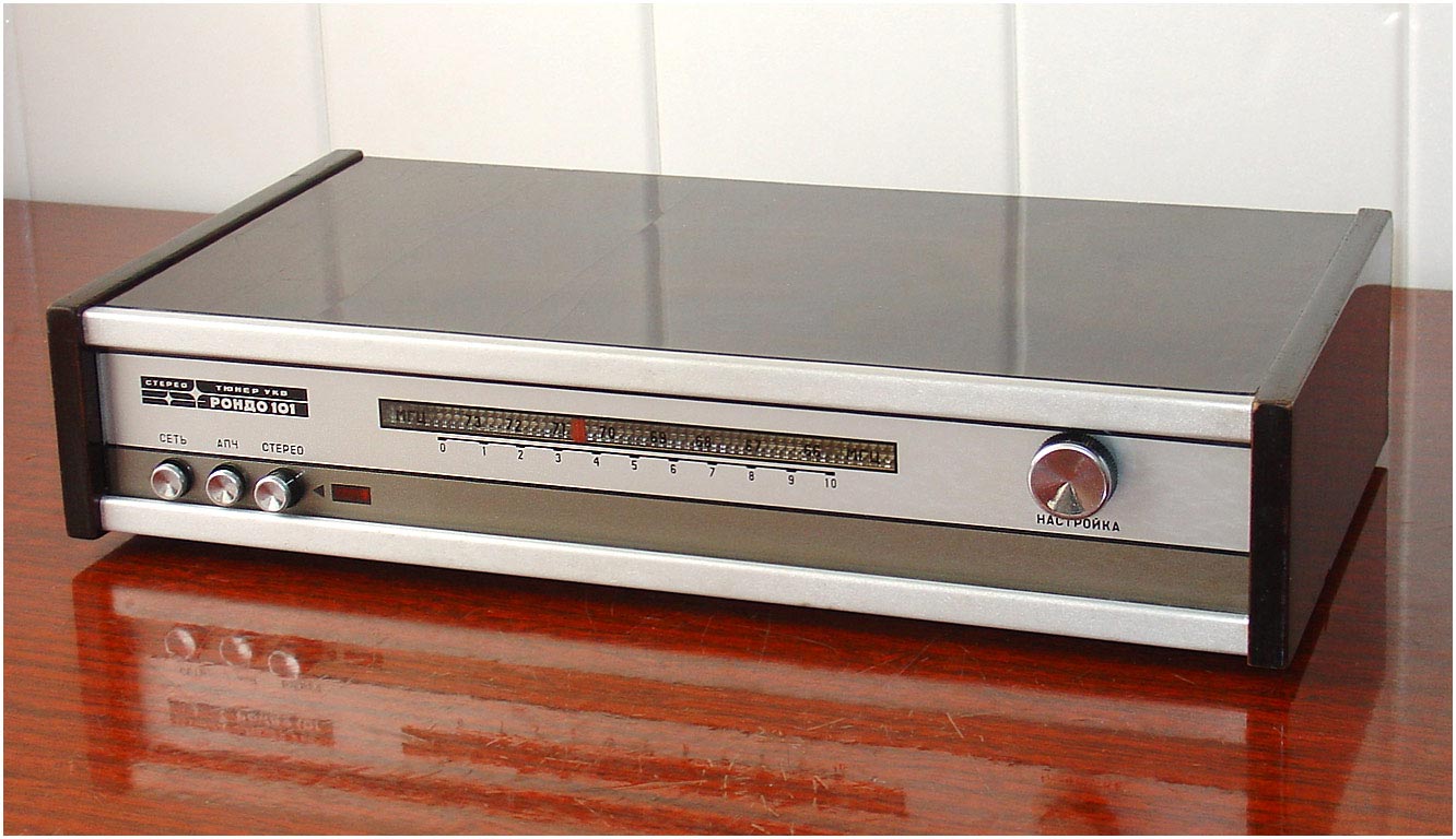 Стационарный транзисторный тюнер *Рондо-101-стерео* с I-кв 1974 года выпускал Таганрогский завод Прибой. Тюнер - представляет собой радиоприёмное устройство первого класса, предназначенное для приёма моно и стереофонических радиовещательных программ в УКВ-ЧМ диапазоне (65,8...73 МГц). Он рассчитан на совместную работу с любой бытовой радиоаппаратурой, имеющей стереофонический усилитель НЧ. Чувствительность - 5 мкВ при отношении сигнал/шум - 26 дБ, переходное затухание - 25 дБ, диапазон звуковых частот на выходе для усиления 31,5...15000 Гц. Питание от сети 127 или 220 вольт. Потребляемая мощность 5 Вт. Размеры тьюнера - 400х200х80 мм, масса 3 кг.