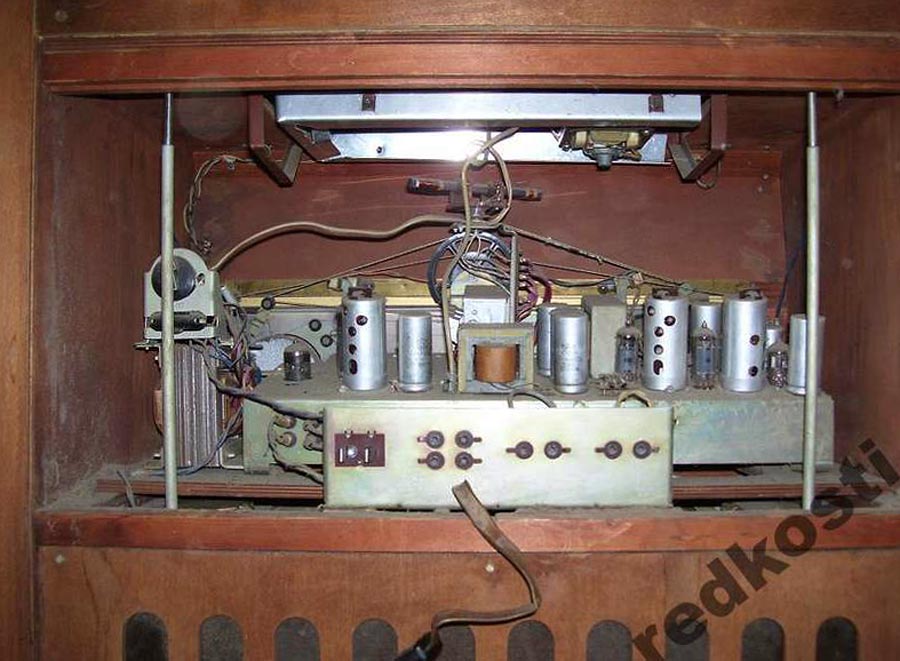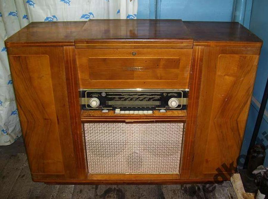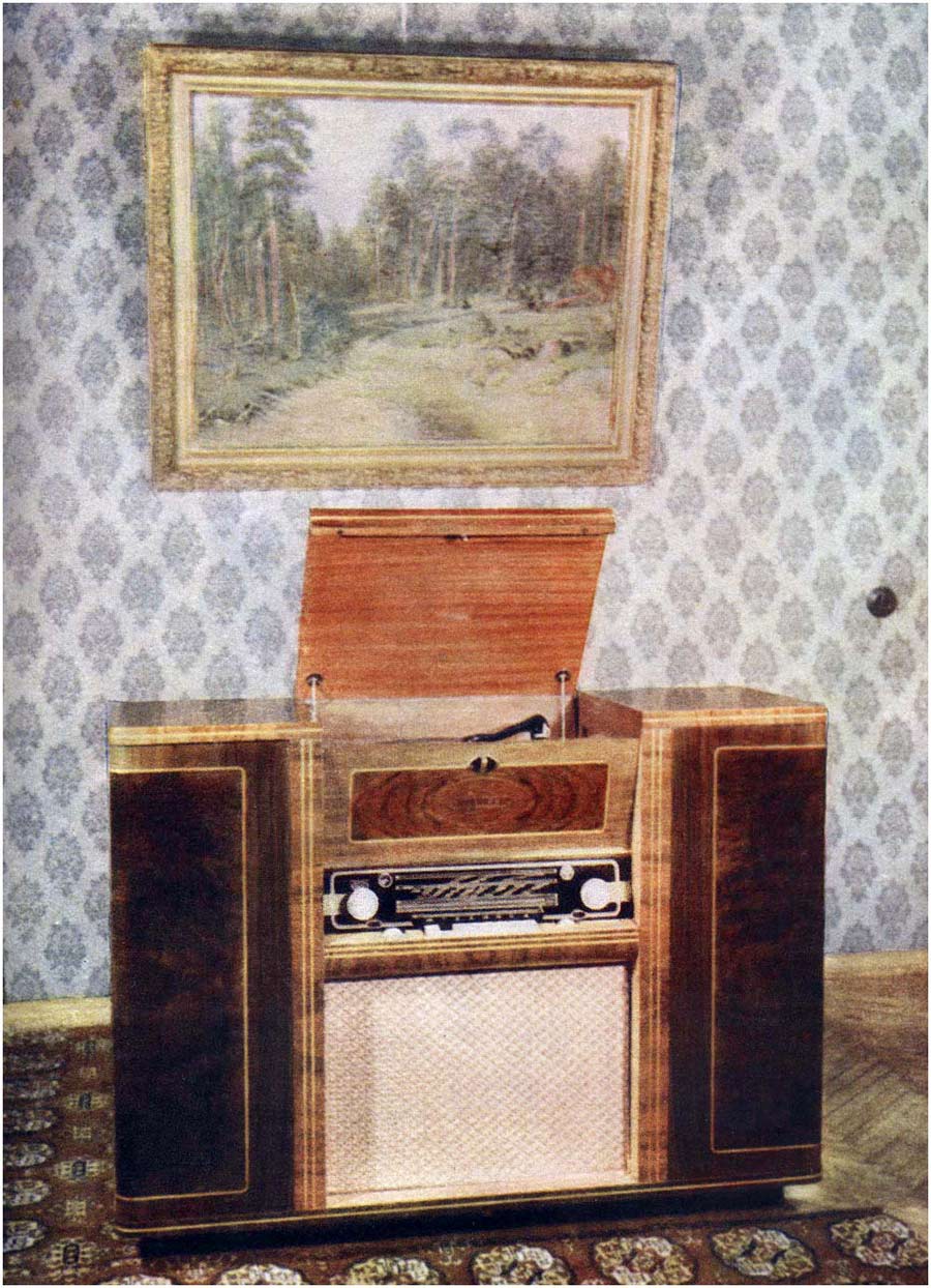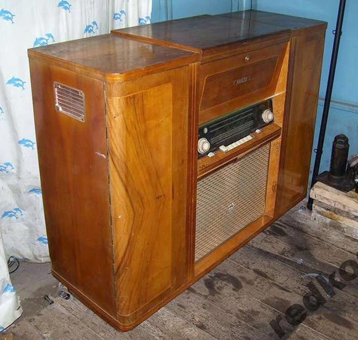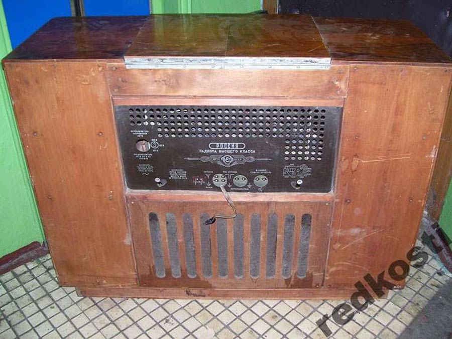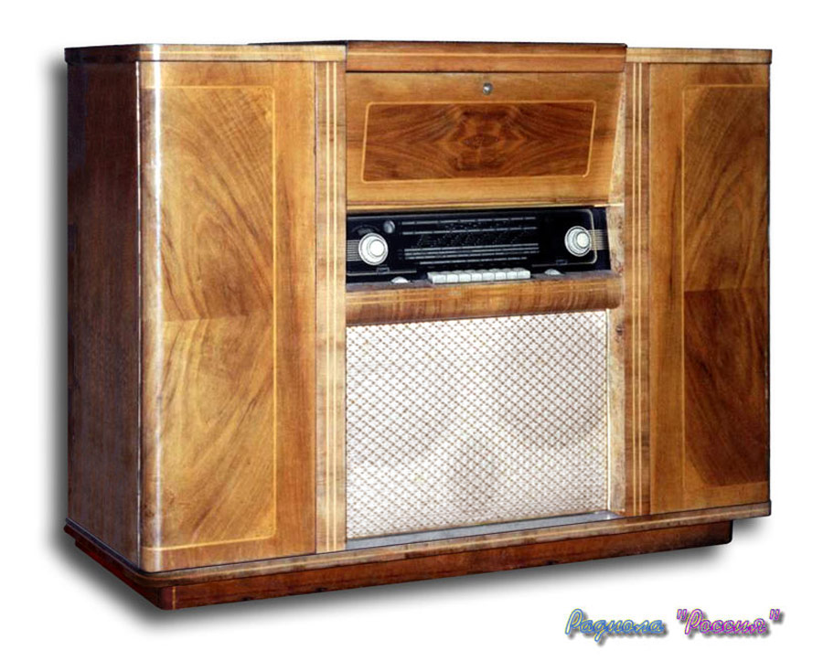 Радиола сетевая ламповая *Россия* с осени 1956 года выпускалась на Рижском государственном электротехническом заводе *ВЭФ*. Всеволновая радиола высшего класса **Россия** - создана на базе радиолы **Люкс** и по своей электрической схеме и конструкции, кроме футляра аналогична ей. В акустической системе радиолы применены 2 фронтальных громкоговорителя типа 5ГД-10, один фронтальный и два боковых типа 1ГД-9. Диапазон воспроизводимых звуковых частот при проигрывании пластинок и приёме в ЧМ диапазоне 40...15000 Гц. Максимальная выходная мощность УНЧ 16 Вт. Потребляемая мощность от электросети 220 вольт при приёме 100 Вт, при работе ЭПУ - 120 Вт. Габариты модели 1150х850х405 мм. Масса 66 кг.