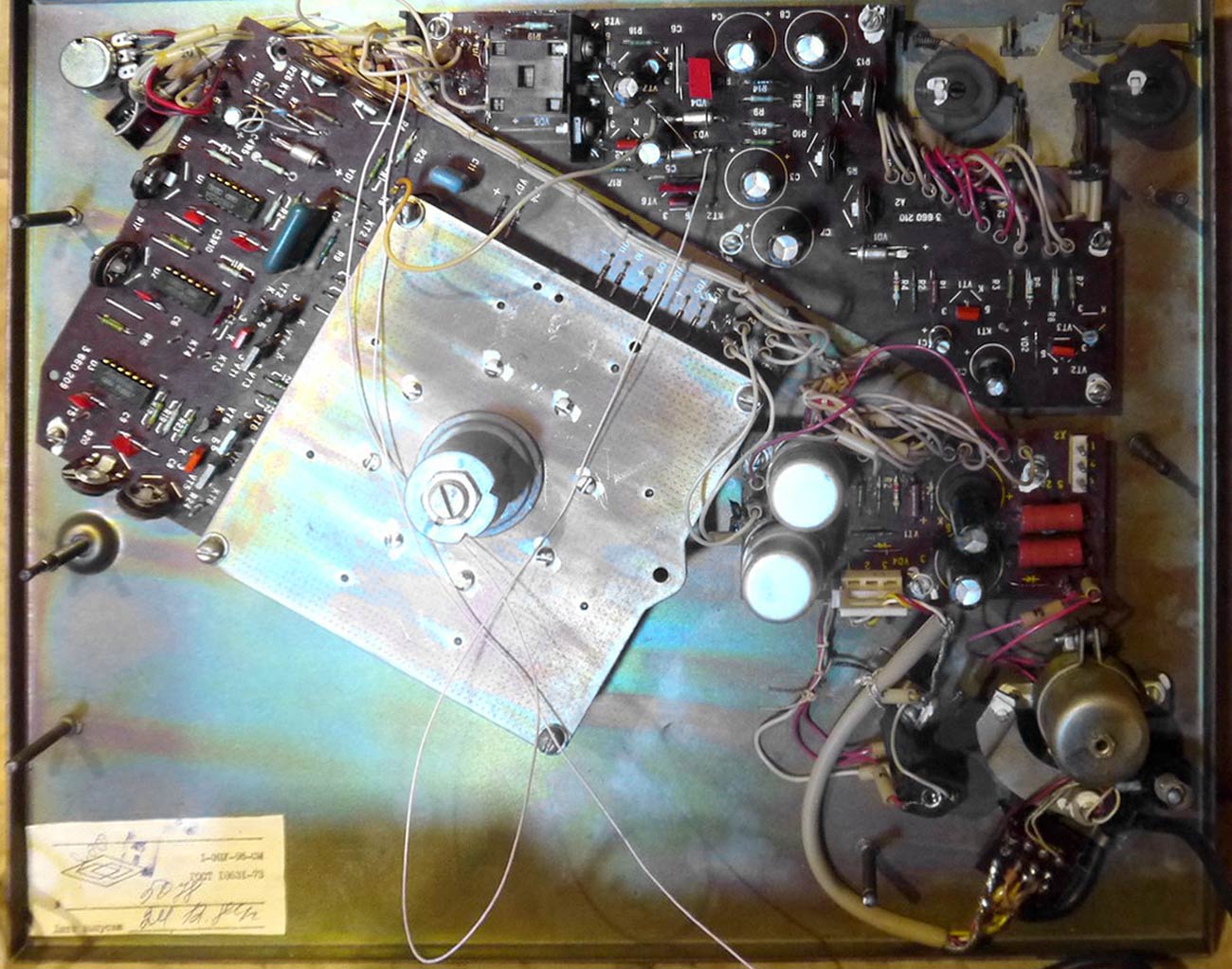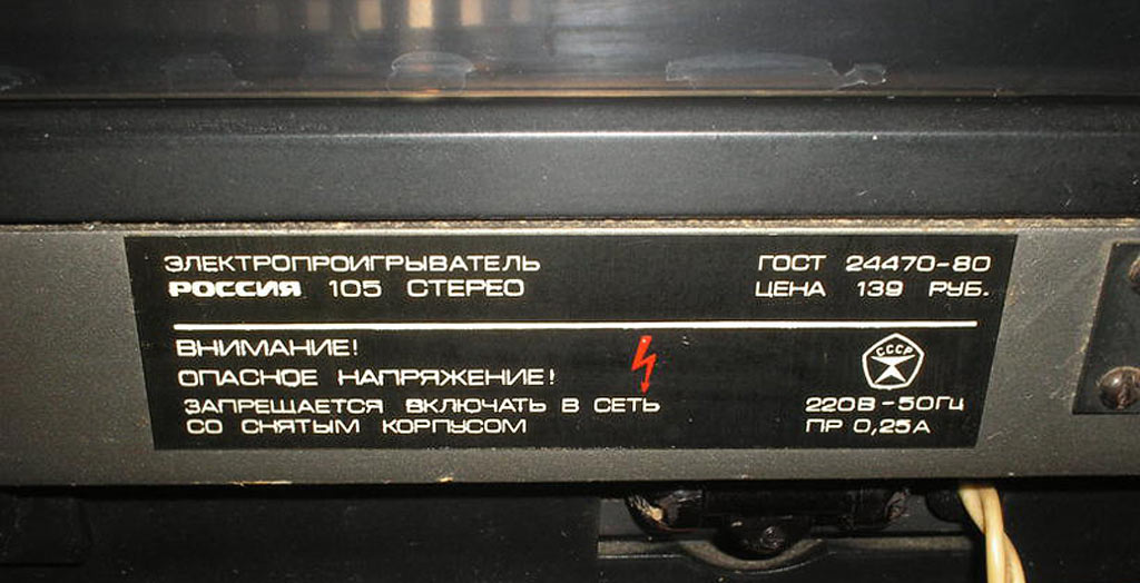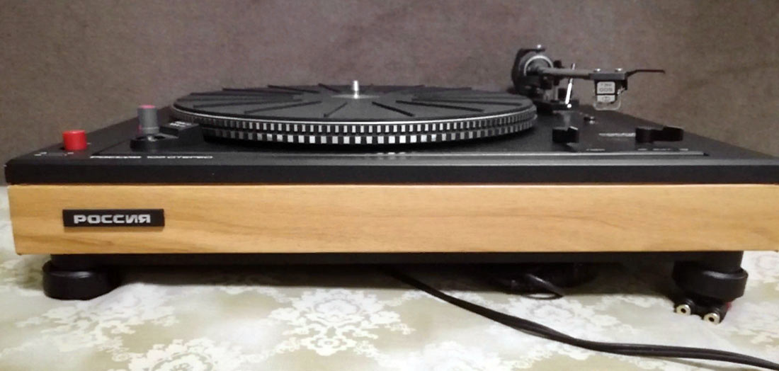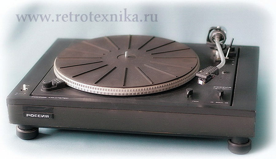 Электропроигрыватель *Россия-105-стерео* с 1985 года выпускало Челябинское ПО *Полёт. Стереофонический электропроигрыватель первой группы сложности **Россия-105-стерео** предназначен для воспроизведение звукозаписей с моно или стереофонических грампластинок всех форматов. ЭП имеет двухскоростное электропроигрывающее устройство I-ЭПУ-95СМ со сверхтихоходным бесконтактным электродвигателем постоянного тока, прямой привод с пониженным уровнем рокота, устройство для точной подстройки частоты вращения диска ЭПУ, регулятор прижимной силы звукоснимателя, компенсатор скатывающей силы тонарма, микролифт и электронный автостоп. Корпус аппарата выполнен из ударопрочного полистирола. Краткие характеристики: Частота вращения диска 33 1/3; 45 об/мин. Диапазон воспроизводимых звуковых частот 31,5...16000 Гц. Коэффициент детонации 0,15%. Относительный уровень рокота со взвешивающим фильтром -60 дБ. Уровень электрического фона -63 дБ. Напряжение питания 220 В. Потребляемая мощность - 20 Вт. Габариты электропроигрывателя - 441х343х150 мм. Его масса - 9 кг.