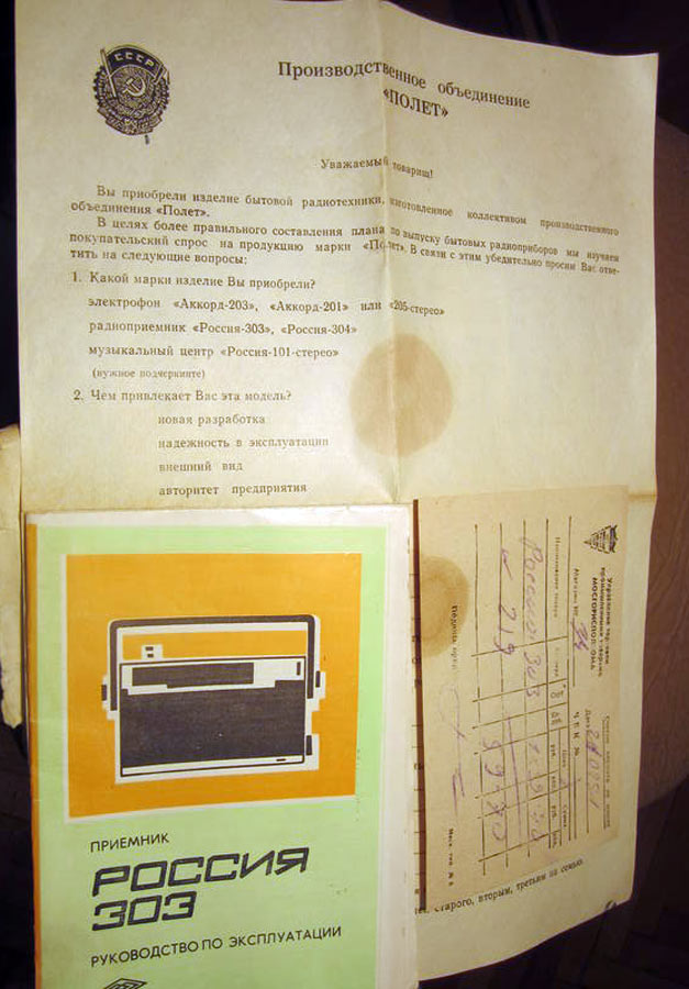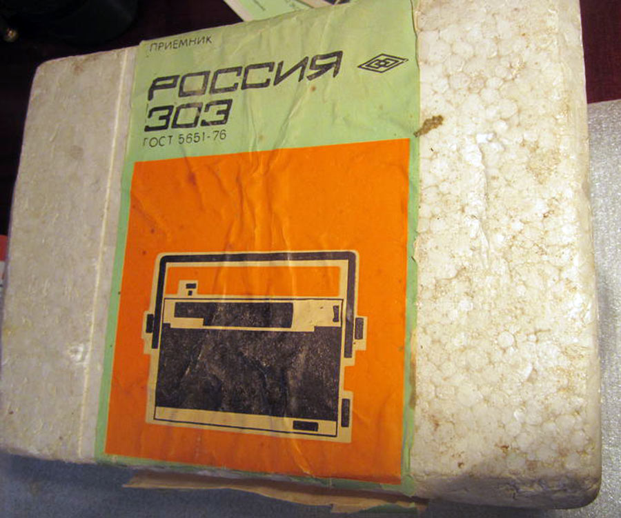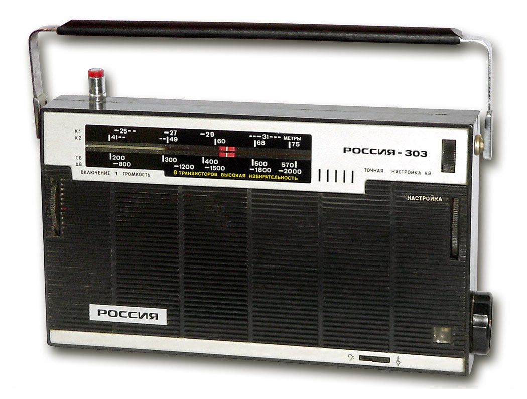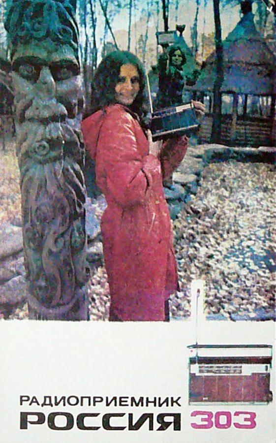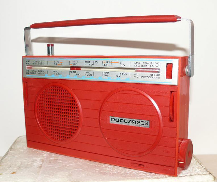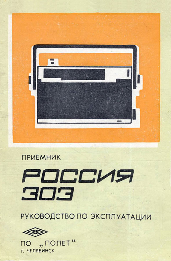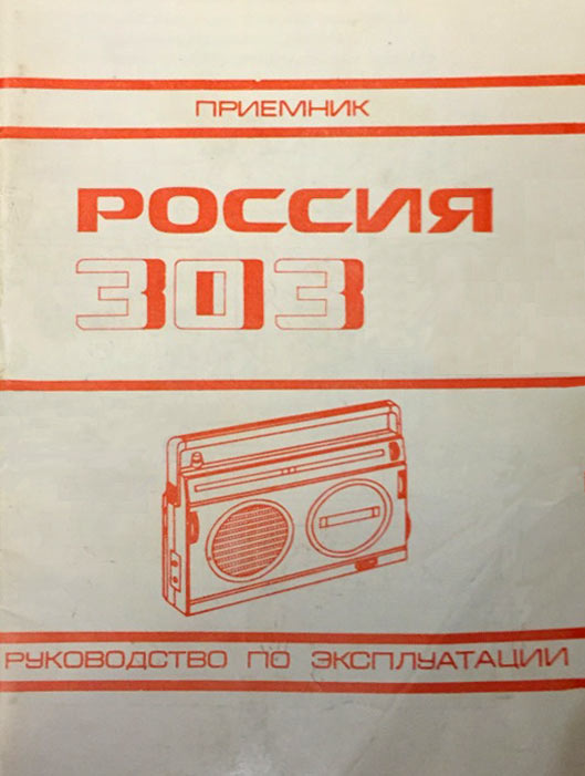 Портативный радиоприёмник *Россия-303* с 1974 года выпускало Челябинское ПО *Полёт*. Переносный радиоприёмник 3-го класса **Россия-303** собран на 8-ми транзисторах и 2-х диодах. Он предназначен для приёма радиостанций с АМ модуляцией, в диапазонах ДВ, СВ на внутреннюю магнитную антенну и в поддиапазонах KB, на телескопическую. Диапазоны частот: ДВ - 150...408 кГц, СВ - 525...1605 кГц, КВ-1 - 9,5...12,1 МГц, КВ-2 - 3,95...7,3 МГц. ПЧ равна 465 кГц. Чувствительность в диапазоне ДВ - 1,5 мВ/м, СВ - 0,7 мВ/м, KB - 100 мкВ. Селективность по соседнему каналу в ДВ и СВ - 46 дБ. Селективность по зеркальному каналу в диапазоне ДВ - 26 дБ, СВ - 30 дБ, KB - 14 дБ. Действие АРУ: при изменении входного сигнала на 26 дБ, напряжение на выходе изменяется на 6 дБ. Номинальная выходная мощность 100 мВт. Полоса воспроизводимых частот - 300...3550 Гц. Питание от 4-х элементов 316. Габариты модели 215х125х47 мм. Масса 1 кг. С 1987 года приёмник *Россия-303* именовался как *Россия РП-303*. По параметрам он аналог описанного приёмника, а оформление аналогично сиреневому приёмнику. Впрочем для увеличения ассортимента наименований продолжился выпуск и модели *Россия-303*. В процессе производства все элементы радиоприёмника, такие как громкоговоритель, пьезофильтр и резисторы и конденсаторы заменяли современными.