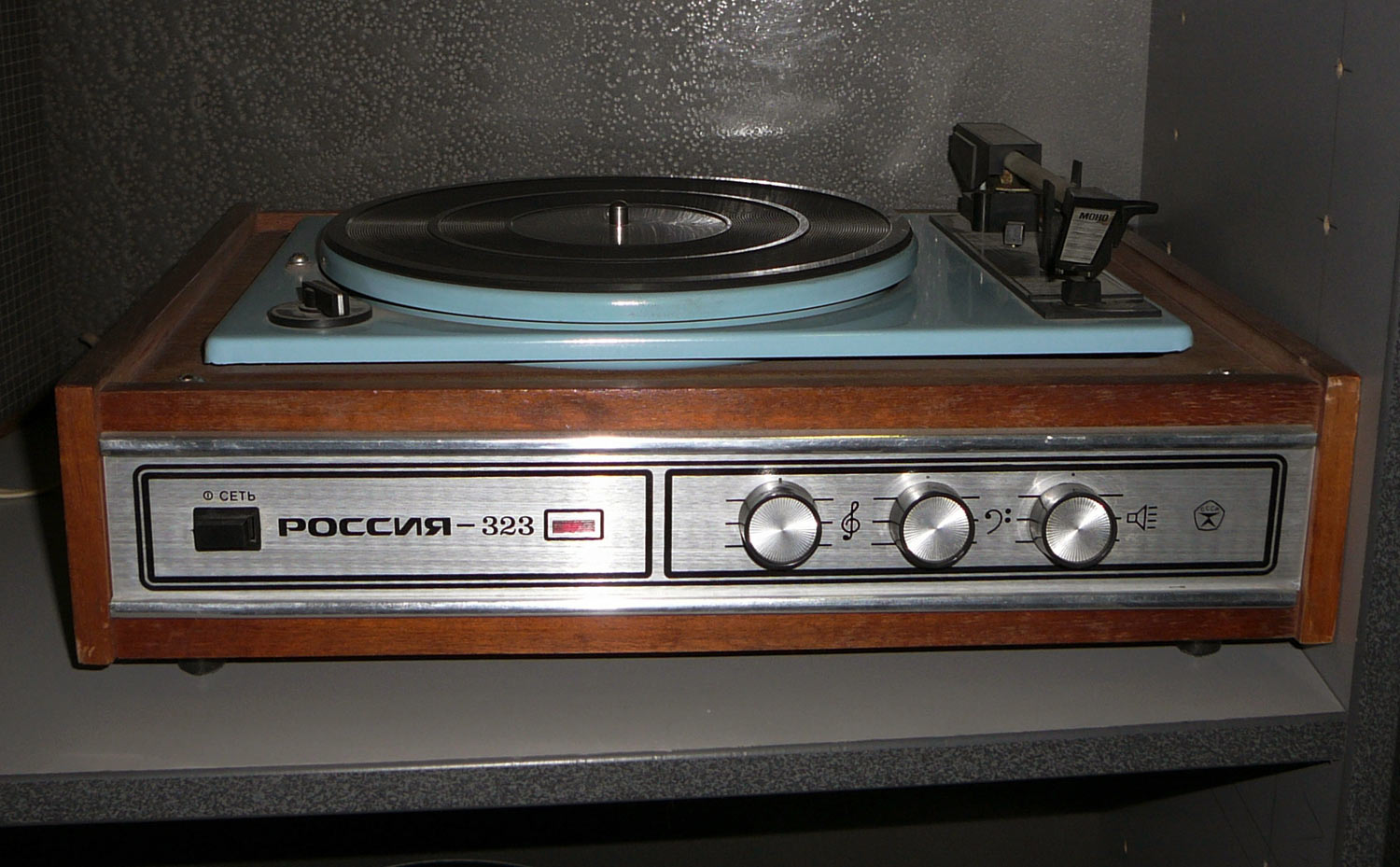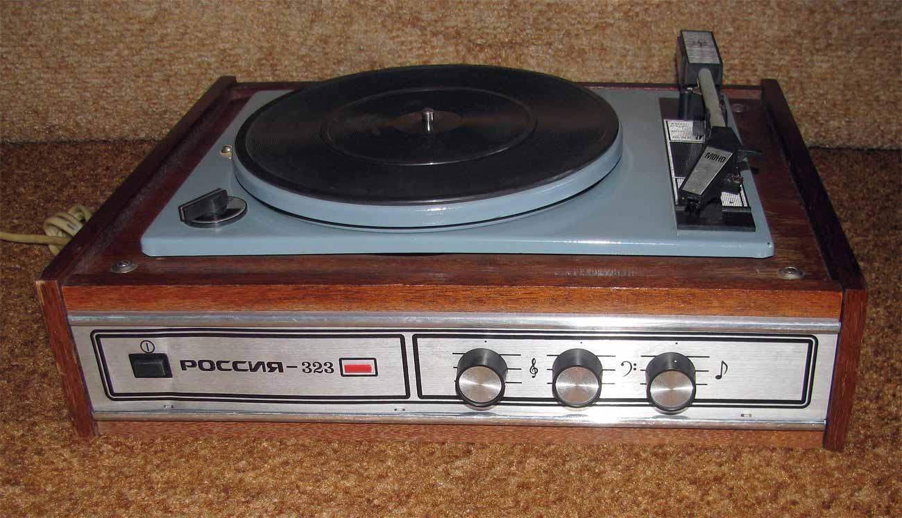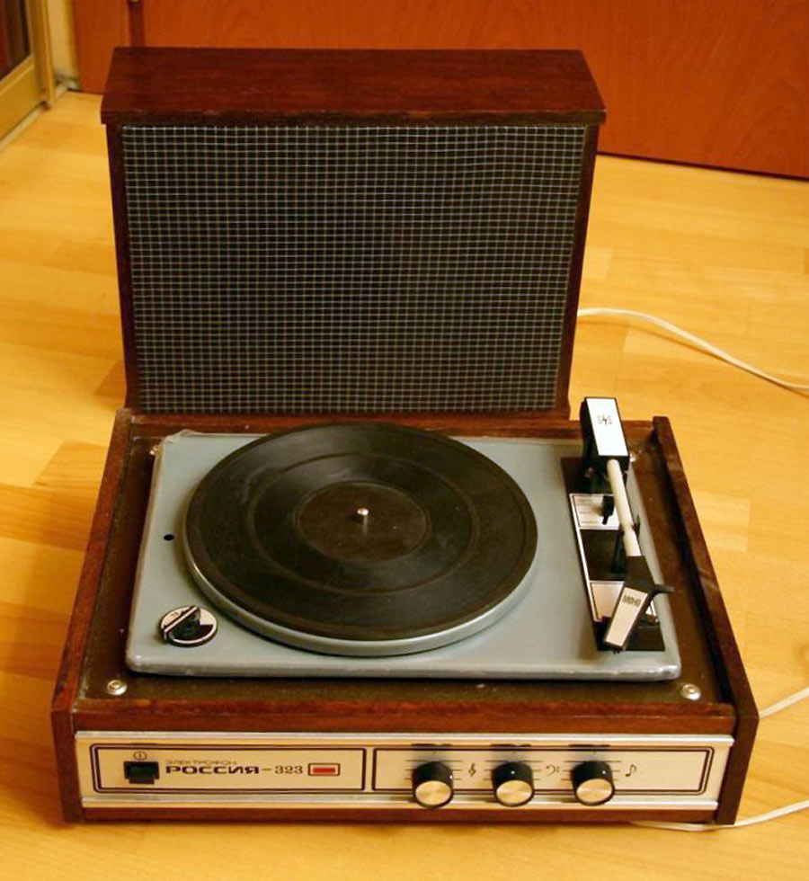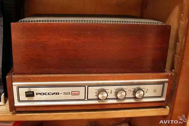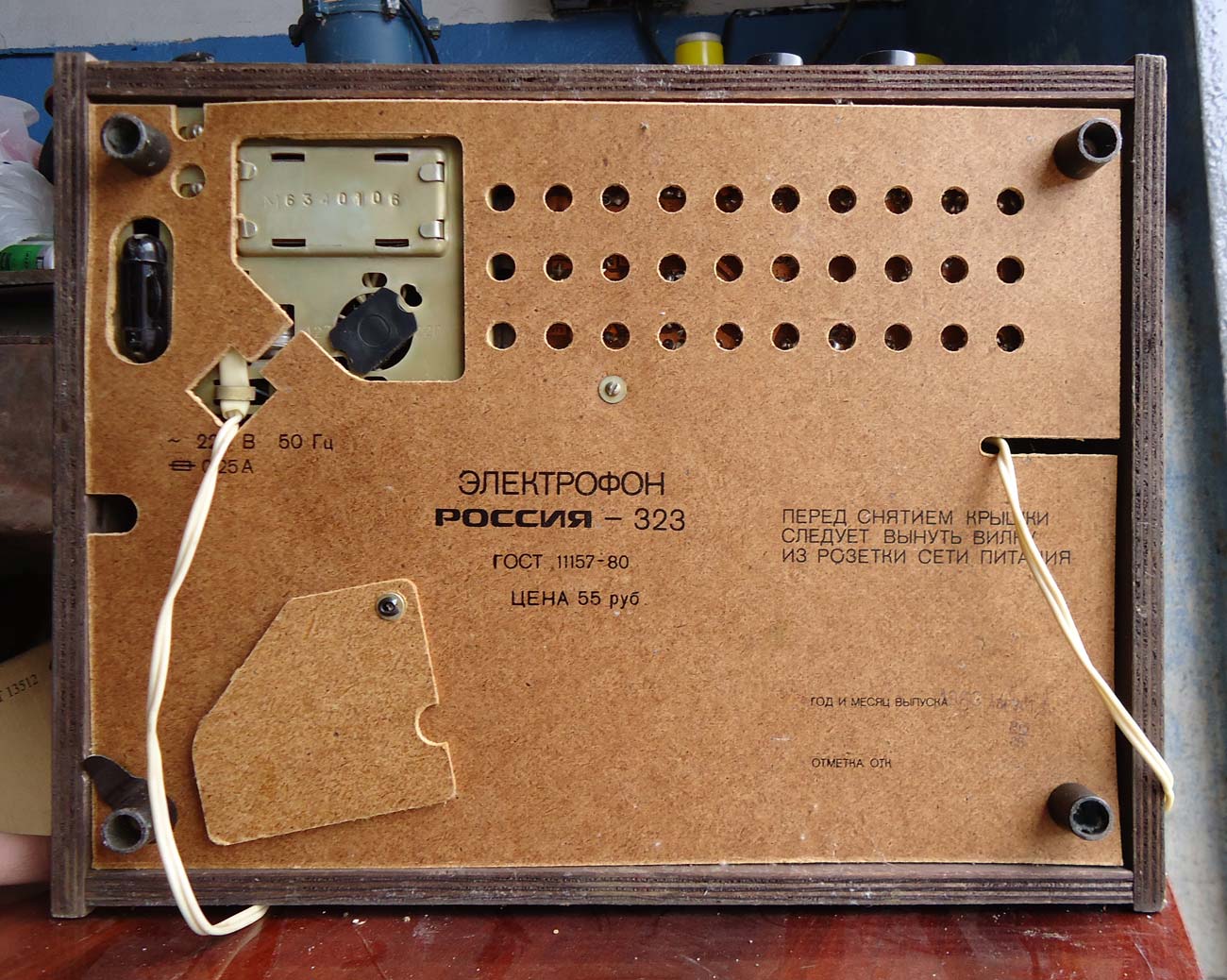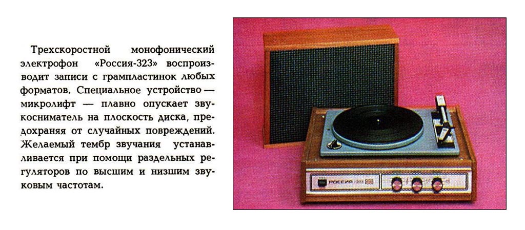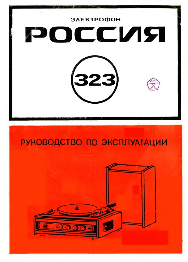 Электрофон сетевой транзисторный *Россия-323* с осени 1982 года выпускало Челябинское ПО *Полёт*. ЭФ обеспечивает воспроизведение грамзаписи и состоит из ЭПУ - III-ЭПУ-76 и усилителя НЧ, объединенных в одном корпусе и выносной акустической системы с громкоговорителем 4ГД-35 или акустической системы 8ГДШ-1. Тембр звучания устанавливается с помощью регуляторов тембров по ВЧ и НЧ частотам. Имеется возможность подключения магнитофона и трансляционной сети в режиме усиления звука. Корпуса полированы или отделаны шпоном ценных пород дерева. Частота вращения диска 33, 45 и 78 об/мин. Диапазон рабочих частот звука 80...12500 Гц. КНИ 2,5%. Номинальная выходная мощность 1,5 Вт, максимальная 4 Вт. Сопротивление АС 4 Ом. Потребляемая мощность 30 Вт. Габариты электрофона 395х325х150 мм, АС - 365х270х140 мм. Общий вес 12 кг. Цена аппарата с 1984 года 63 рубля, с 1985 года 55 рублей.