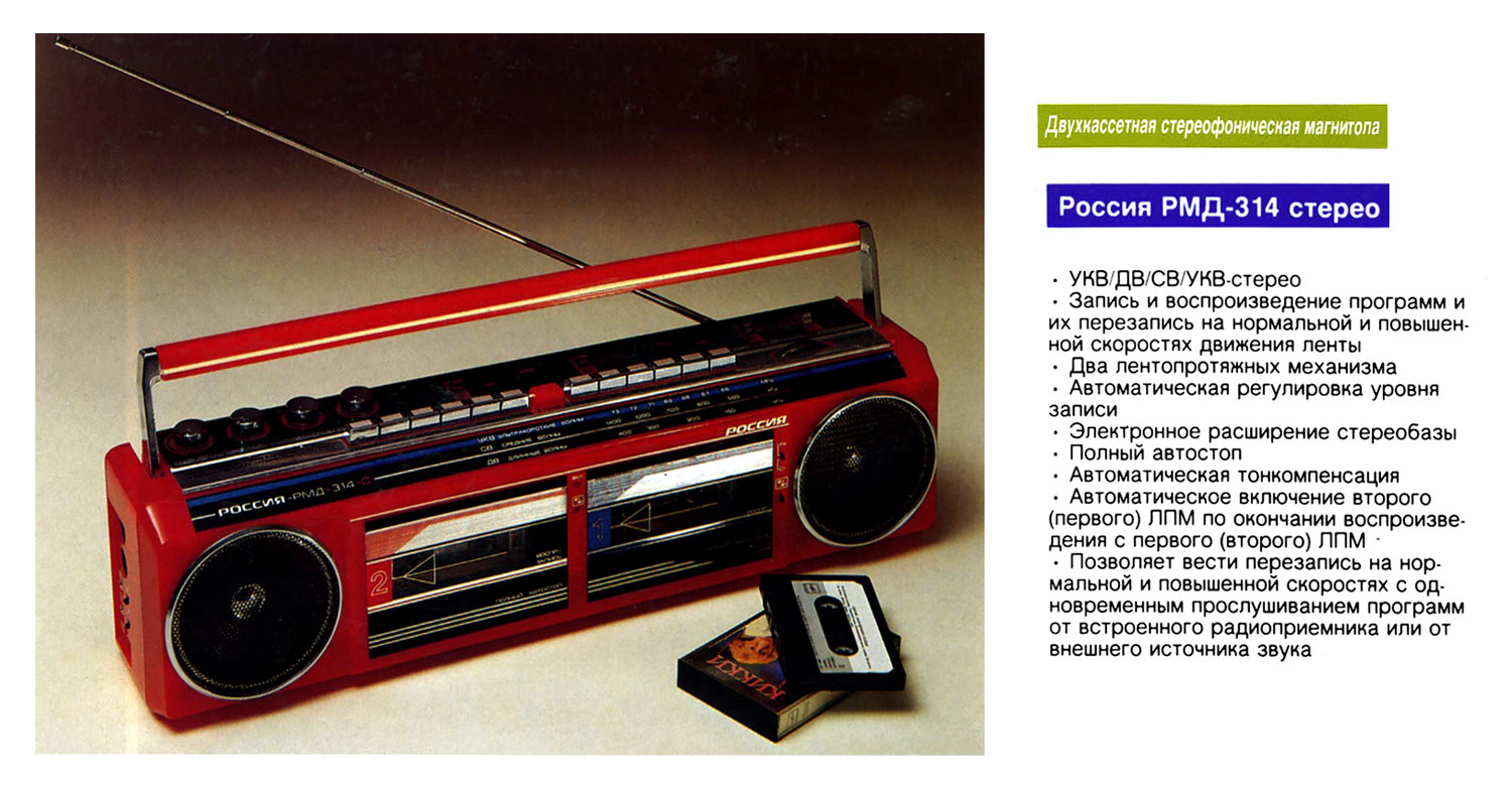 Стереофоническая магнитола *Россия РМД-314С* разработана в 1987 году Челябинским ПО *Полёт*. Магнитола не выпускалась, однако на её базе с небольшими изменениями в схеме и оформлении с 1988 года ПО выпускалась магнитола *Россия РМ-314С*. С 1989 года ПО выпускало магнитолу *Россия РМ-214С*, описанная ниже. Магнитола предназначена для приёма в диапазонах: ДВ, СВ, УКВ (стереофонический приём), записи и воспроизведения фонограмм на кассеты и перезаписи фонограмм с кассеты на кассету. Магнитола имеет отключаемые системы АПЧ и БШН радиоприёмника, ускоренную перезапись, выбор типа магнитной ленты, ускоренный поиск фонограмм по паузам с прослушиванием, поочерёдное воспроизведения кассет, подключения внешних источников сигнала. Есть регулировки тембра НЧ и ВЧ, баланс, громкость с тонкомпенсацией, расширение стереобазы, выход на наушники. Питание МЛ от сети через выносной БП, внешнего источника питания или от 8-ми элементов А-343. Чувствительность в диапазонах: ДВ - 2,0, СВ - 1,2, KB - 0,3 и УКВ ЧМ - 0,05 мВ/м. Коэффициент детонации ± 0,3%. Выходная мощность: номинальная 2х1,5 Вт, максимальная 2х3 Вт. Диапазон рабочих звуковых частот тракта магнитофонов не уже 70...14000 Гц. Масса модели 3 кг.