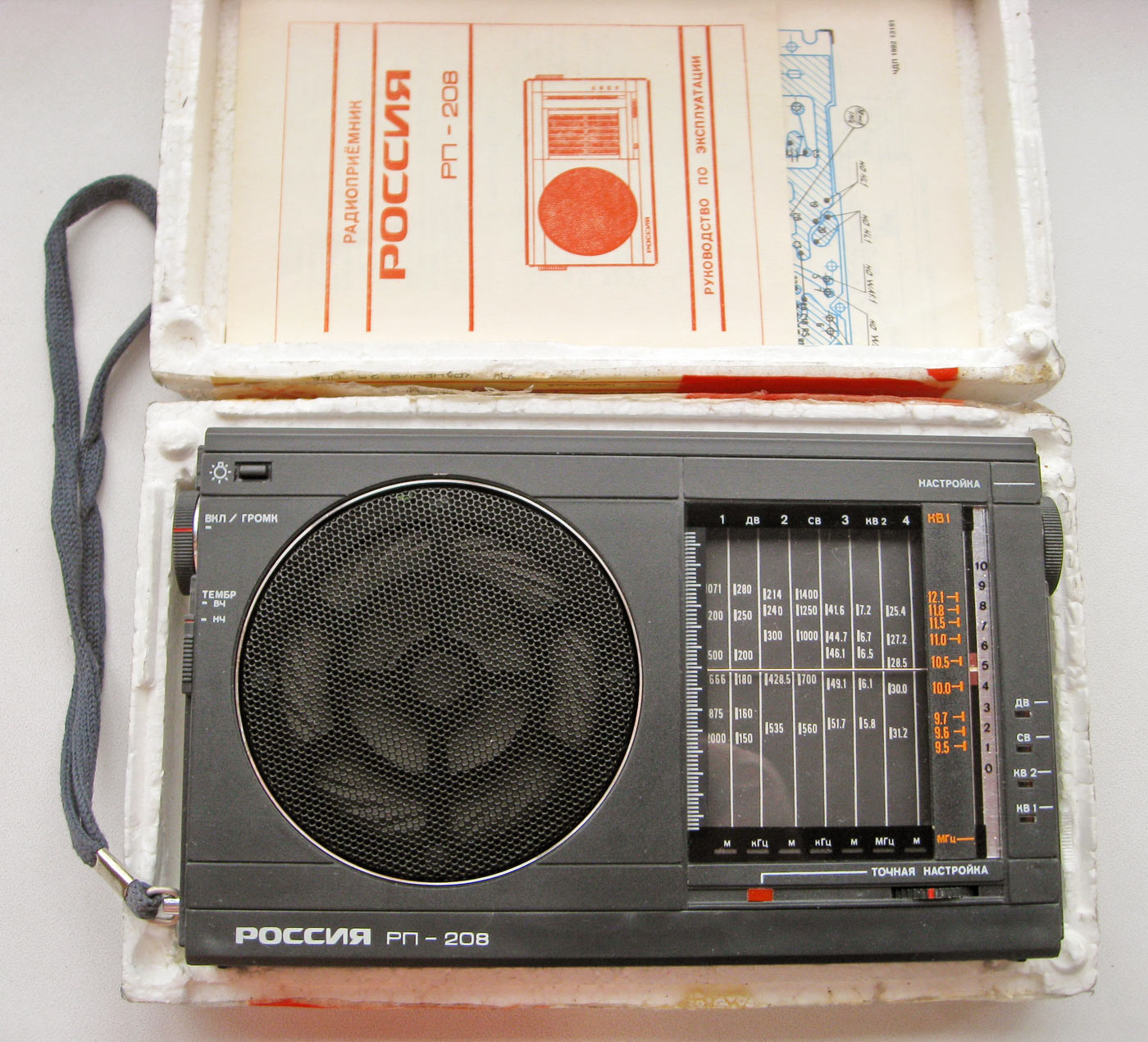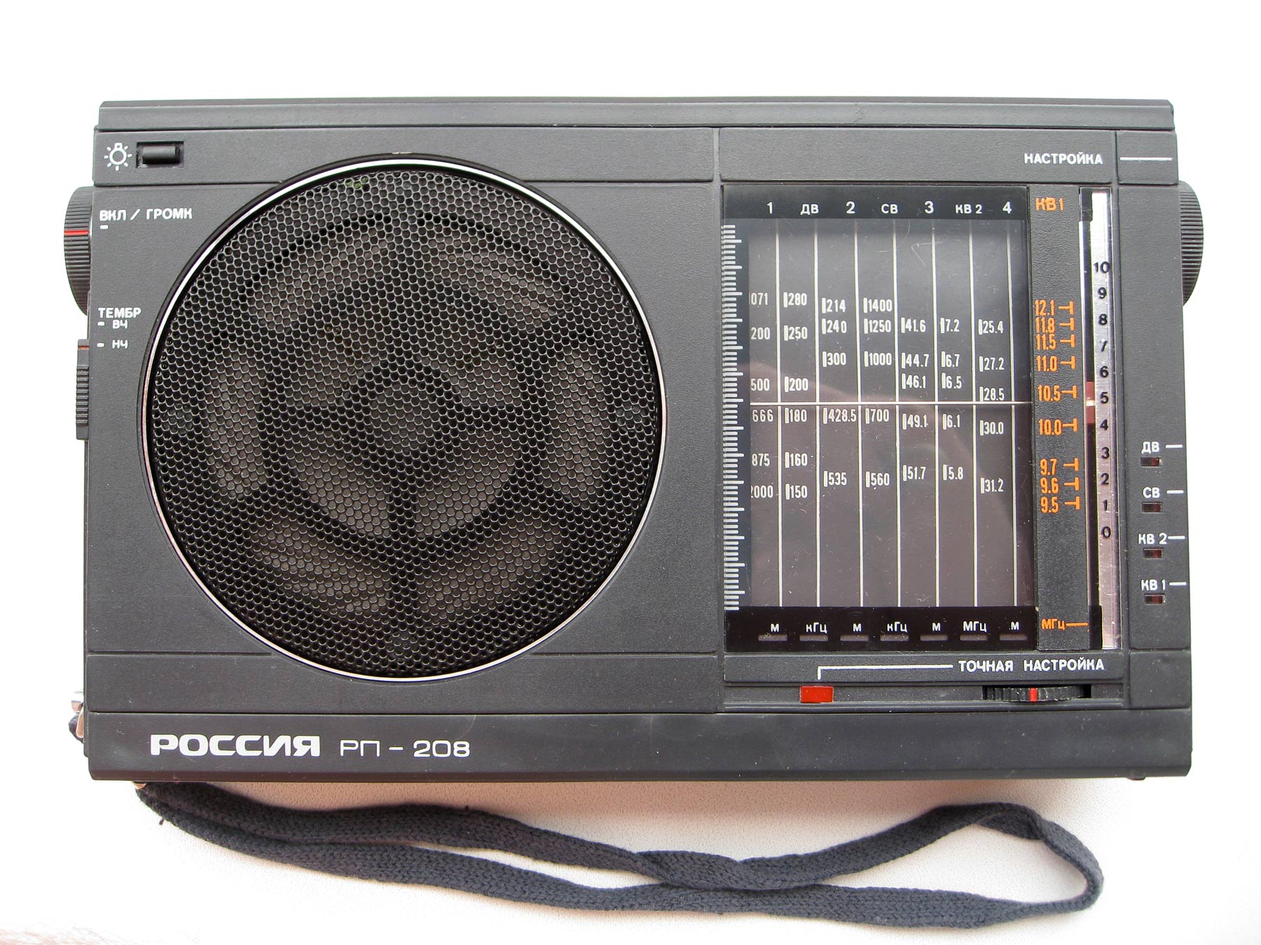 Портативный радиоприёмник *Россия РП-208* выпускался предположительно с 1993 года Челябинским ПО ”Полёт”. Радиоприёмник работает в диапазонах: ДВ 148,5...283,5 кГц; СВ 576,5...1606,5 кГц; КВ-2 5,8 ...7,3 МГц; КВ-1 9,5...12,1 МГц. В радиоприёмнике предусмотрены: возможность подключения внешней антенны; внешнего источника питания; наушников; подсветка шкалы; двухпозиционный переключатель тембра ВЧ и НЧ; регулировка точной настройки в КВ диапазонах; световой индикатор наличия станции. Питание 6 В. Габариты модели 198х115х37,5 мм. Вес 0,6 кг.