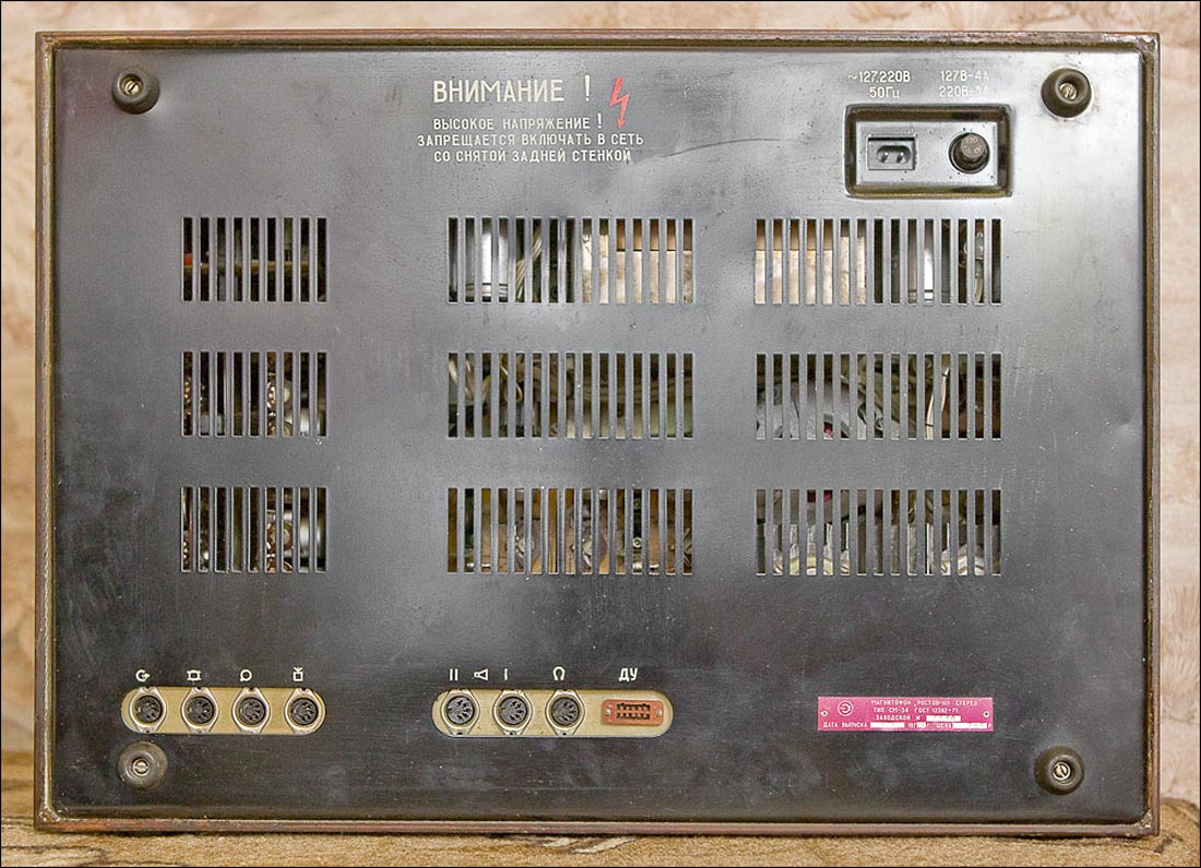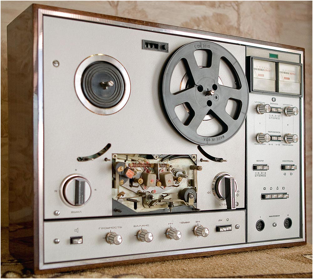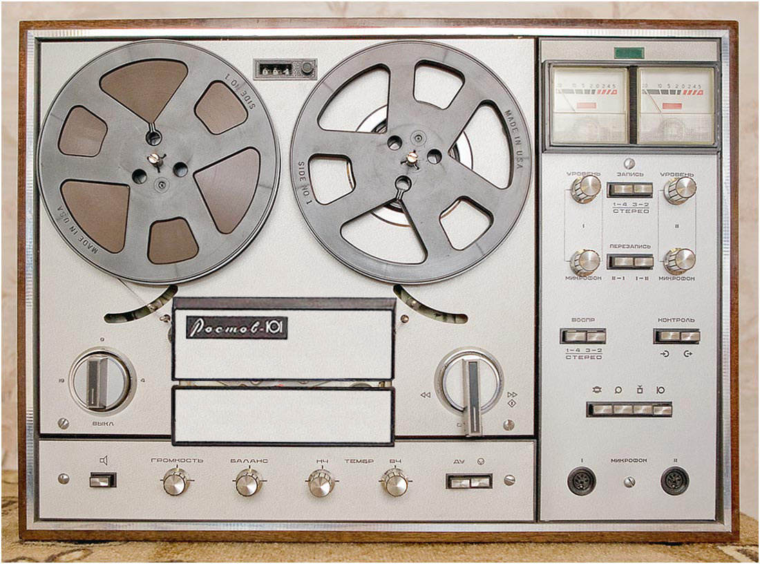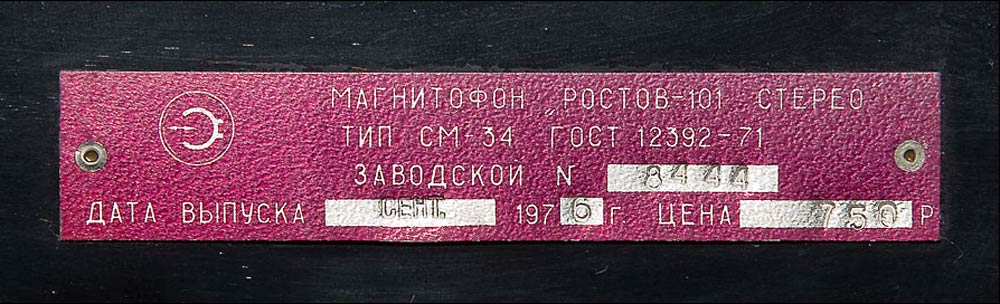 Стереофонический катушечный магнитофон *Ростов-101-стерео* с 1975 года выпускал Ростовский завод *Прибор*. Он обеспечивает высококачественную запись и воспроизведение фонограмм с микрофона, звукоснимателя, приёмника, телевизора, другого магнитофона и радиолинии. В модели предусмотрены: регулировка и визуальный контроль уровня записи по каждому каналу при неподвижной и движущейся ленте: контроль качества записи на слух: перезапись с дорожки на дорожку с одновременной записью со входа **микрофон**: световая индикация включения записи раздельно по каналам: наложение новой записи на старую; автостоп, срабатывающий при обрыве и окончании ленты; счётчик ленты, устройство очистки ее от пыли. Совместно с АС магнитофон может быть использован в качестве двухканального усилителя. ЛПМ выполнен по одномоторной кинематической схеме на электродвигателе КД6-4. Скорости движения ленты: 19,05, 9,53 и 4,76 см/с при коэффициентах детонации соответственно ±0,1: ± 0,2, ± 0,5%. Запись четырехдорожечная на магнитную ленту типа А4403-6, А4407-6Б или А4408-6Б. При использовании катушек №18 вмещающих 525 метров ленты длительность записи одной дорожки на скорости 19,05 см/сек не менее 45 мин, на средней 1,5 часа, на меньшей 3 часа. Длительность перемотки 3 минуты. Номинальная выходная мощность усилителя ЗЧ магнитофона при работе на АС **10МАС-1** с сопротивлением по входу 8 Ом - 6х2 Вт. Диапазон рабочих частот на скорости: 19,05 - 40...18000 Гц. 9,53 - 40...14000 Гц и 4,76 см/с 63...8000 Гц. Коэффициент гармоник на ЛВ по сквозному каналу на частоте 400 Гц на скорости: 19,05, 9.53 см/с - 3%, на скорости 4,76 см/с - 4%. Относительный уровень помех в канале воспроизведения -44/48 дБ. Питание от сети. Потребляемая мощность 150 Вт. Размеры магнитофона 540 х 405 х 210 мм. Масса 25 кг.