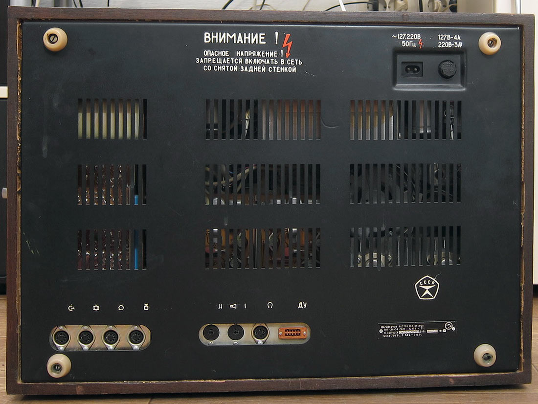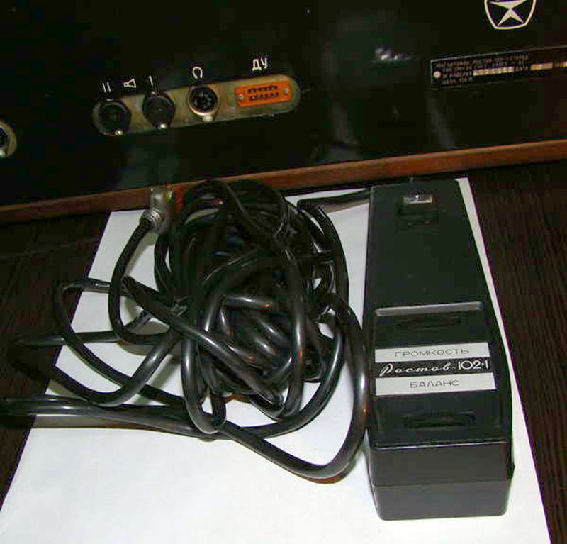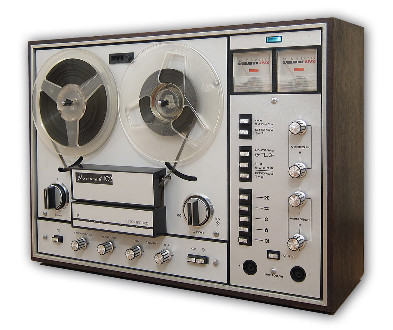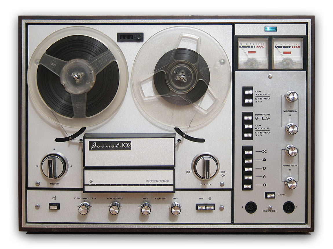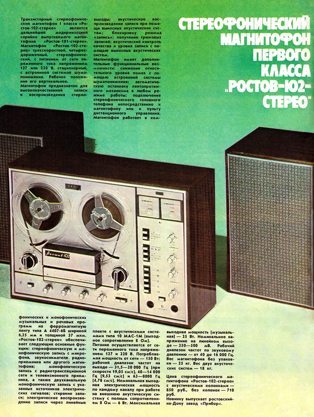 Катушечный магнитофон *Ростов-102 стерео* с 1978 года выпускал Ростовский завод *Прибор*. Магнитофон выполняет обычные записи и например трюковые, смешивая сигналы со входа микрофон и другого, перезапись с дорожки на дорожку с добавлением новой программы. Модель имеет: проводной ПДУ; 3-х декадный счётчик ленты с кнопкой сброса; стрелочные индикаторы уровня записи; автоматической остановкой ЛПМ по окончании и обрыве ленты. От прошлой модели отличается СШП, которая повышает качество записей. Число дорожек записи и воспроизведения 4. Тип магнитной ленты - А4407-6Б. Номер катушки 18. Скорость движения ленты 19,05; 9,53; 4,76 см/с. Диапазон частот на скорости 19,05 см/сек - 40...18000 Гц, 9,53 см/сек - 40...14000 Гц. 4,76 см/сек - 63...8000 Гц. Коэффициент детонации 0,1; 0,2; 0,5 %. Сопротивление АС - 8 Ом. Номинальная выходная мощность - 2х6 Вт. Потребляемая мощность 150 Вт. Габариты модели 540 х 400 х 215 мм. АС - 422 х 272 х 234 мм. Масса магнитофона 25 кг. Одной АС 8,5 кг. Цена 850 рублей. С 1982 года завод выпускал магнитофон *Ростов-102-1-стерео* имеющий более высокие характеристики.