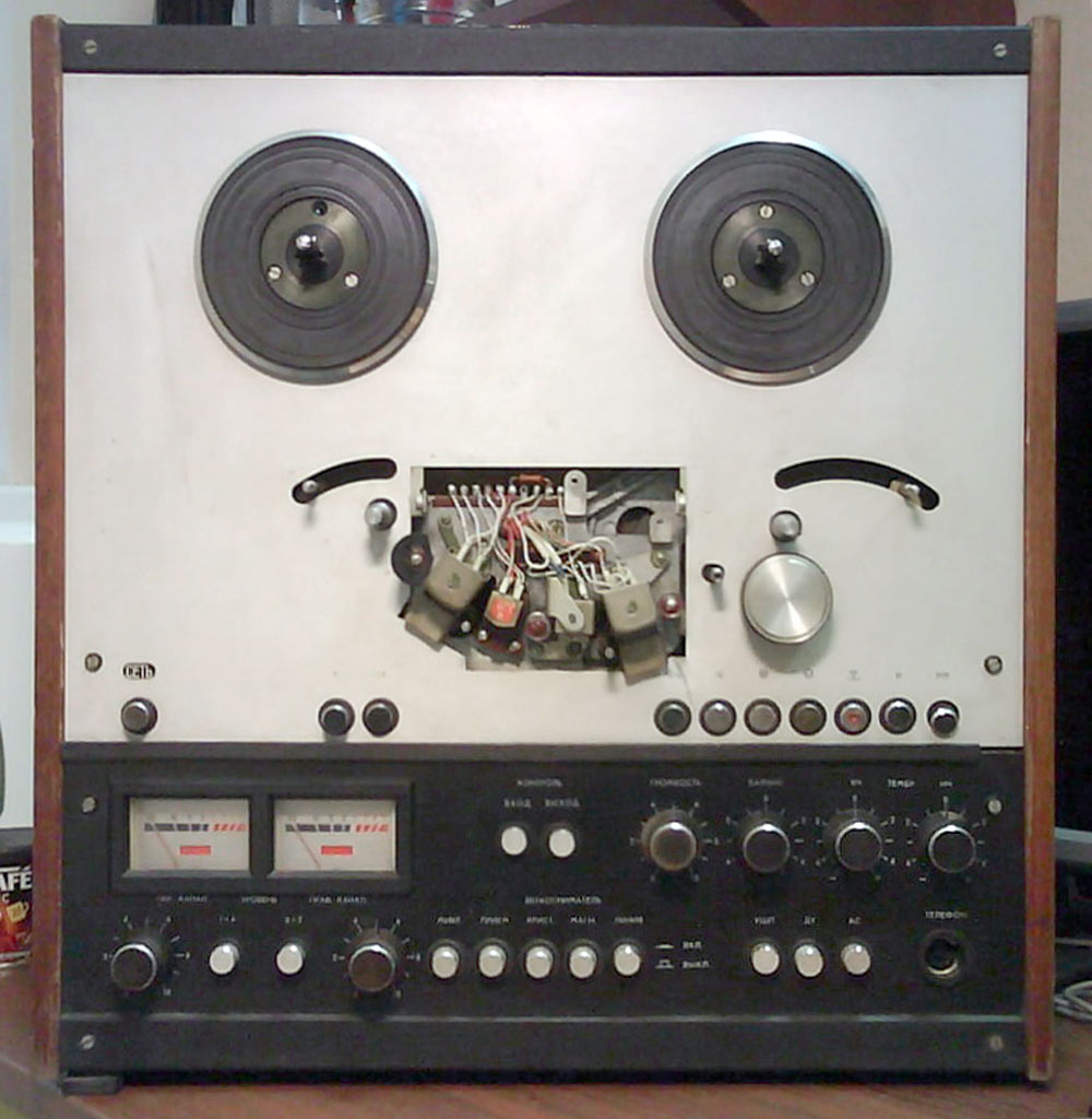 Катушечный магнитофон *Ростов-104-стерео* с 1979 года выпускал Ростовский завод *Прибор*. 2-х скоростной катушечный магнитофон первого класса **Ростов-104-стерео** выполнен на базе трёхмоторного реверсируемого ЛПМ с прямым приводом ведущего вала. В магнитофоне имеется электронная система стабилизации частоты вращения ведущего вала, автостоп при обрыве или окончании ленты, стеклоферритовые головки, устройство шумопонижения. Магнитофон снабжён пультом для дистанционного управления, позволяющим управлять всеми режимами работы магнитофона. Работает магнитофон **Ростов-104-стерео** на две акустические системы 35AC-1. Рабочий диапазон частот на линейном выходе на скорости: 19,05 см/сек - 31,5...20000 Гц, 9,53 см/сек - 40...16000 Гц. Коэффициент детонации на скорости 19,05 см/сек 0,1%, 9,53 см/сек 0,2%. Номинальная выходная мощность 2х30 Вт. Относительный уровень шумов в канале З-В -49 дБ. Снижение уровня шумов в диапазоне частот 2-20 кГц при включении ШП -10 дБ. Потребляемая мощность 250 Вт. Габариты модели 480x460x250 мм. Его масса 28 кг. Розничная цена 2280 рублей.