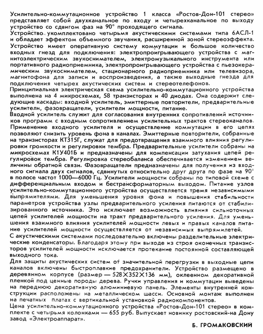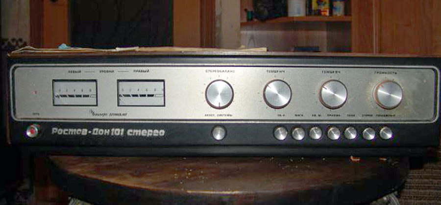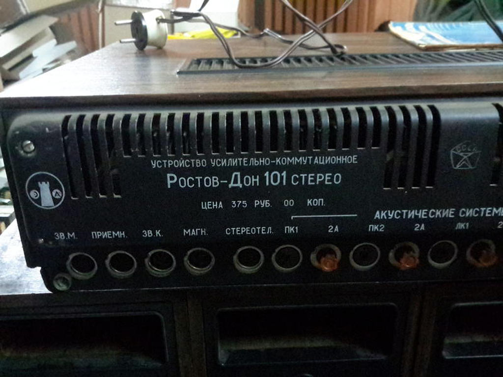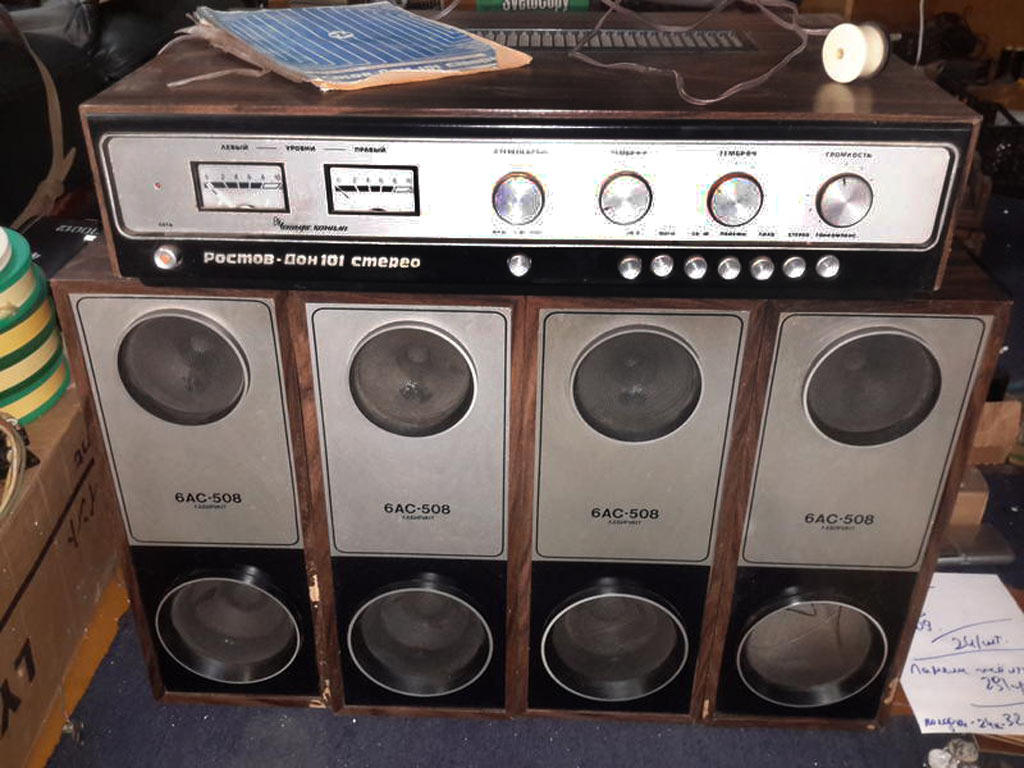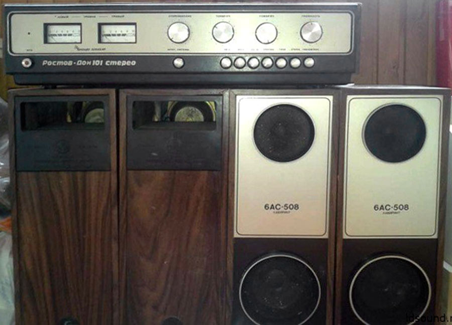 Система объемного звучания *Ростов-Дон-101-стерео* с марта 1976 года выпускал Ростовский завод *Электроаппарат*. Система состоит из УКУ и 4-х двухполосных лабиринтных громкоговорителей 6АСЛ-1. Она обеспечивает прослушивание моно-программ с эффектом объемного звучания и стереопрограмм с расширенным стереоэффектом. Источниками звукового сигнала могут быть магнитофон, электропроигрыватель или тюнер. Характеристики усилителя Ростов-Дон-101-стерео. Рабочий диапазон частот 40...18000 Гц. Выходная мощность на нагрузке 4 Ом; номинальная 2х10, максимальная 2х15 Вт. Коэффициент гармоник 1 %. Относительный уровень помех со входа керамического звукоснимателя и магнитофона -60 дБ, магнитного звукоснимателя и тюнера -50 дБ. Чувствительность со входа: звукоснимателя и магнитофона 200...250 мВ, магнитного звукоснимателя 3...5 мВ, тюнера 25 мВ. Пределы регулировки тембра на частотах 63 Гц и 16 кГц - ±10 дБ. Потребляемая мощность 150 Вт. Габариты 530х355х136 мм. Масса 16,5 кг. Характеристики громкоговорителя 6ACЛ-1. Номинальная мощность 6 Вт. Диапазон рабочих звуковых частот - 63 ...18000 Гц. Входное сопротивление 4 0м. Среднее стандартное звуковое давление 0,1 Па. Суммарный коэффициент гармоник 3 %. Габариты одной АС -170х285х430 мм. Вес 7 кг.