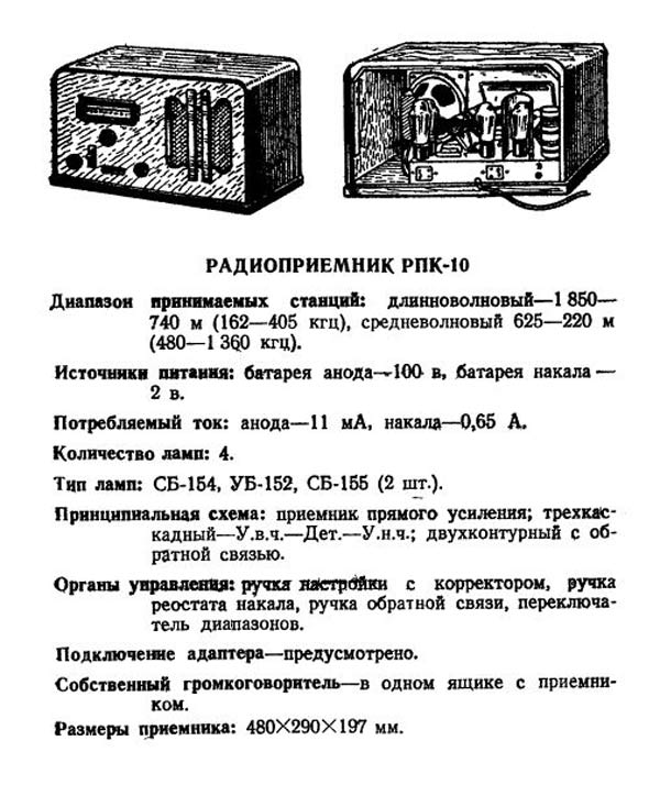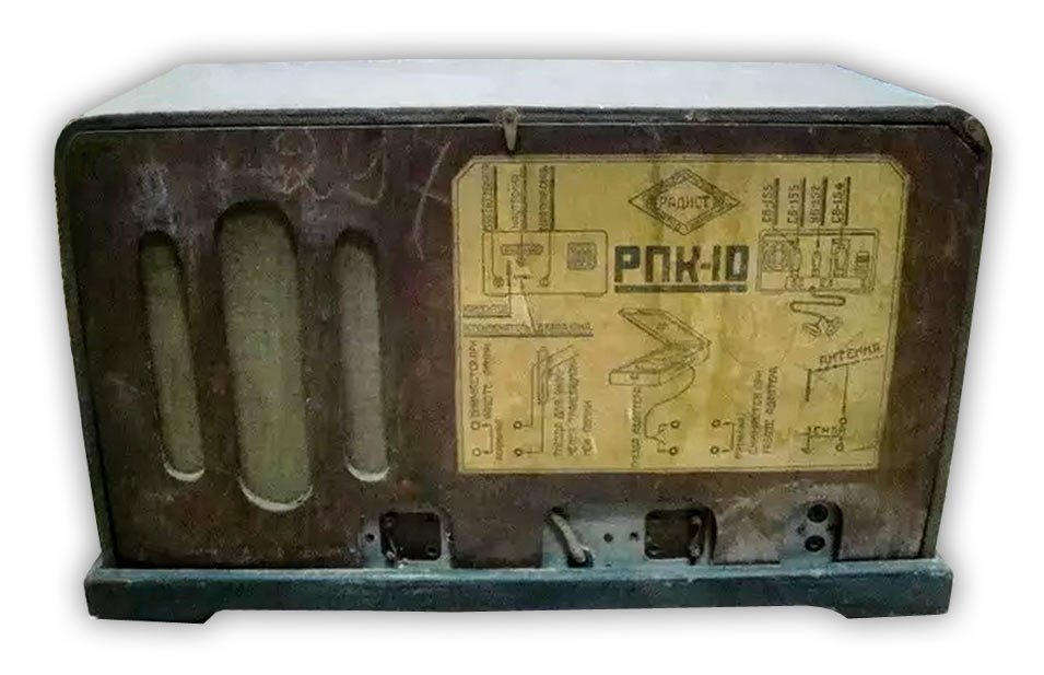 Радиоприёмник батарейный *РПК-10* с 1940 года выпускался Ленинградским заводом *Радист*. *РПК-10* (Радио Приёмник Колхозный, 10 вариант) приёмник индивидуального пользования, рассчитанный на работу в местах не имеющих электричества. Диапазон радиоволн: 1850...740 и 625...220 метров разбит на 2 поддиапазона ДВ и СВ. Радиоприёмник имеет внутренний динамический громкоговоритель. Есть возможность использования приёмника в качестве небольшого радиотрансляционного узла с несколькими громкоговорителями типа *Рекорд* или *Ф-3*, которые включаются в специальные гнёзда. При этом внутренний громкоговоритель выключается. Номинальная выходная мощность приемника 0,25 Вт. Приёмник имеет гнёзда для подключения антенны, заземления и звукоснимателя.