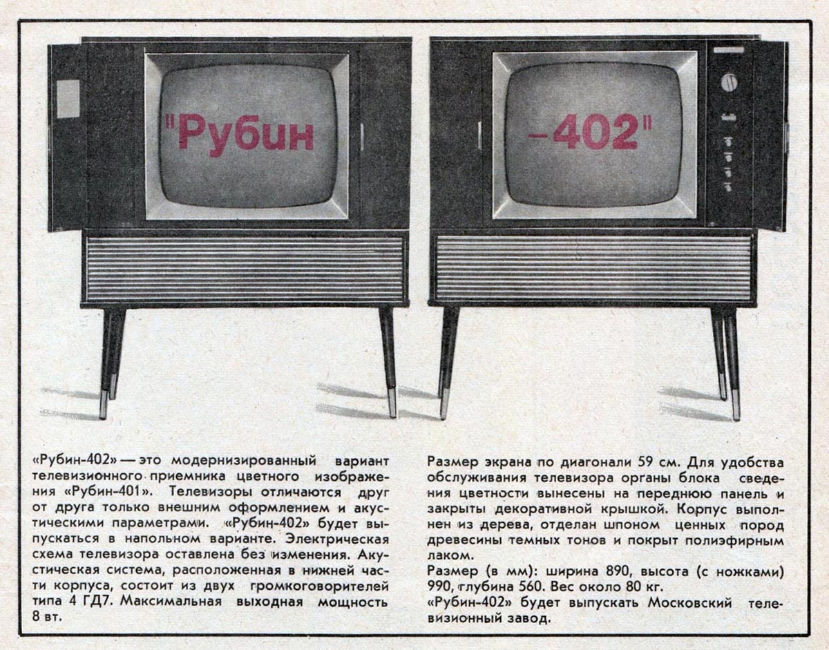 Цветной телевизор *Рубин-402* подготовил к выпуску с 1970 года Московский телевизионный завод. Информация в журнале *Новые товары* 1-1970.