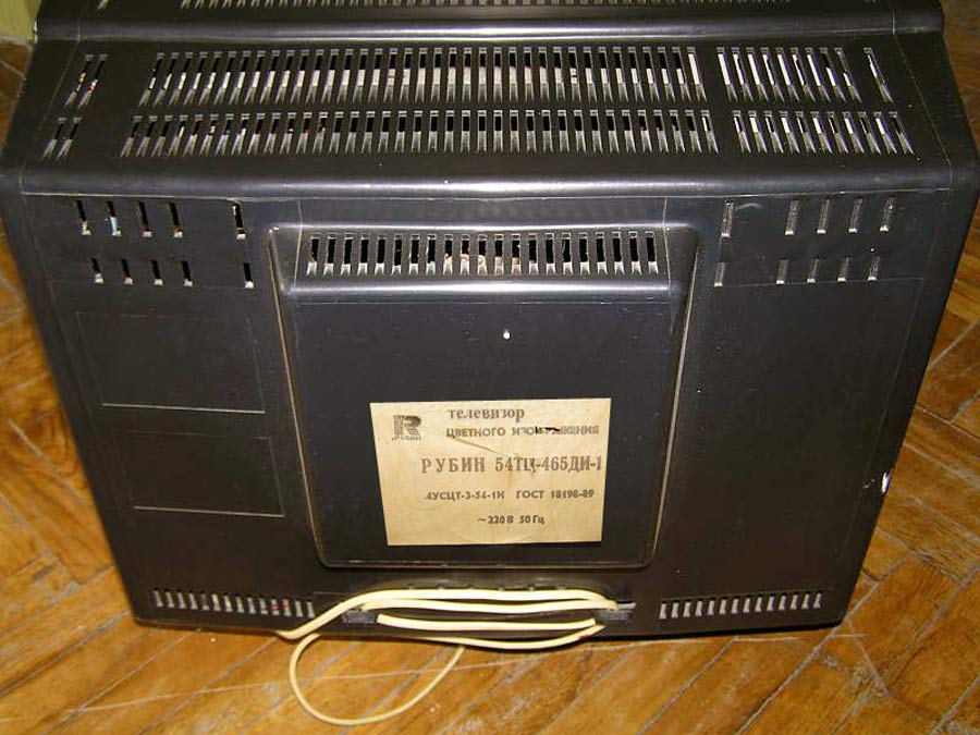 Телевизионный приёмник цветного изображения *Рубин 51ТЦ-465ДИ-1* с 1992 года выпускало Московское ПО *Рубин*. *Рубин 51ТЦ-465ДИ-1* тип 4УСЦТ-3-51-1 - унифицированный цветной телевизор 4-го поколения для приёма телевизионных программ в диапазонах МВ и ДМВ по системам Пал и Секам. Чувствительность в МВ - 40 мкВ, ДМВ - 70 мкВ. Разрешающая способность 325 линий. Номинальная выходная мощность 1 Вт. Диапазон воспроизводимых звуковых частот 100...10000 Гц. Потребляемая от сети мощность 60 Вт. Габариты телевизора - 515х530х475 мм. Его масса - 27 кг.