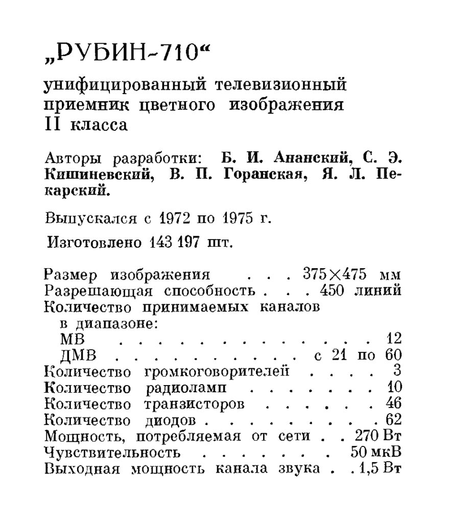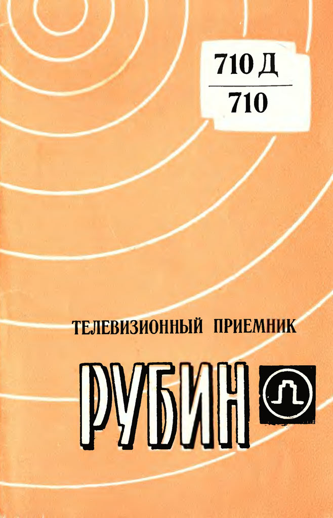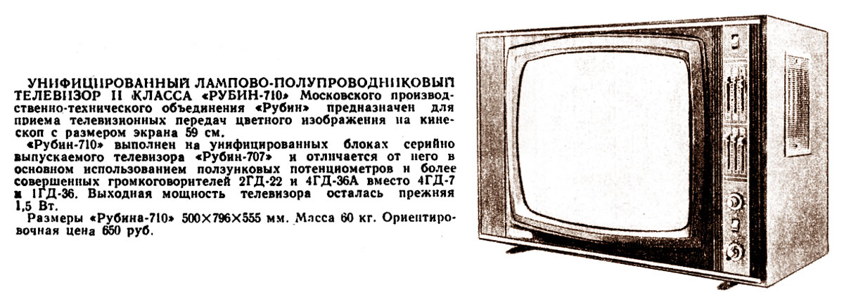 Телевизионный приёмник цветного изображения *Рубин-710/Д* с 1972 года выпускало МПТО *Рубин*, Москва. Совершенная технология производства позволила создать один из лучших Советских телевизоров 70-х годов **Рубин-710**. Телевизор предназначен для приёма цветных и ч/б передач на любом канале в МВ, а телевизор с индексом **Д** и в ДМВ диапазоне. Управление телевизором осуществляется регуляторами ползункового типа справа, на передней фальш-панели. Такие регуляторы создают удобства при пользовании телевизором и улучшают его эстетические показатели. В модели имеются автоматические регулировки, обеспечивающие качественное изображение и кристально чистое звуковое сопровождение, а также отключение блока цветности (для уменьшения цветовых помех) при приёме чёрно-белого изображения. Телевизор оформлен в деревянном футляре, облицованном ценными породами дерева с глянцевым покрытием. Телевизор выпускался в настольном исполнении. В нём применено 11 радиоламп, 42 транзистора и 58 диодов. Имеется возможность для подключения магнитофона на запись звукового сопровождения программ, прослушивания звука на головные телефоны при отключенной АС модели. Высокая чувствительность, в сочетании с эффективно действующей АРУ позволяют вести устойчивый приём программ с наружной антенной на значительном удалении от телецентра. Телевизор выполнен на унифицированных блоках от модели **Рубин-707**, отличаясь использованием ползунковых потенциометров и новых громкоговорителей 2ГД-22 и 4ГД-36А. Чувствительность в диапазоне МВ - 50 мкВ, в диапазоне ДМВ - 200 мкВ. Номинальная выходная мощность 1,5 Вт. Диапазон воспроизводимых звуковых частот 80...12500 Гц. Потребляемая мощность 270 Вт. Габариты телевизора 500 х 796 х 555 мм. Масса 60 кг. Цена 650 рублей.